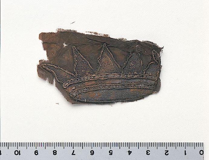 Fragment av siden i varprips med applicerad vävd och broderad femuddig krona. Kronan är klippt ur en väv av silke och guldlan. Kronans hjässband har detaljer av påsydda, veckade förgyllda guldlan samt broderier av grovt silke. Kronans konturer samt de veckade guldlanen kantas av en applicerad guldsnodd. Kronan ursprungligen applicerad på manteln, troligen fastklistrad. De ursprungliga färgerna delvis förändrade, fragmentet numera i brunt och guld. Udden näst längst till höger har toppen täckt av tuskaftsväv, den högraste udden är stukad. Fragmentet ingår i en samling fragment tagna som prov ur drottning Kristinas kista vid gravöppningen den 13-14 december 1965. Mantel: Varp: 2-trådigt löst spunnet silke i svag s-snodd. Trådtäthet: 75 varptrådar/cm. Inslag: 2-trådigt löst spunnet silke i svag s-snodd. Trådtäthet: 35 inslag/cm. Material: Silke. Teknik: Varprips fr. gros de Tours. Kommentar: Inslaget är grövre än varpen. Nuvarande färg är brun. Kronans väv: Mått: b: 77 mm, h: 42 mm. Varp: Knippen av parallellt liggande fibrer. Trådtäthet: 80 trådar/cm. Inslag: Vartannat inslag är silke vartannat är ett lan. Silke av parallellt liggande fibrer. Lanet består av förgyllt silver med förgyllning på båda sidor. Guldskiktet är <0,1 um och något förorenat av klor. Trådtäthet: 40 inslag/cm. Material Silke och förgyllt silver. Teknik: Tuskaft. Kommentar: Inslaget är grövre än varpen. Snodden runt kronan består av 3 st snoddar av spiralvridna guldlan vridna runt en silkekärna. Snodden är fastsydd på kronan med 2-trådigt silke, spunnet i z-snodd och tvinnat i s-snodd. Lanet består av silver, förgyllt på båda sidorna. Guldskikt <0,1 um. Tjocklek 0,01 mm. Litet klor på ytan. De veckade lanen på hjässbandet består av förgyllt silver. Guldförgyllningens tjocklek är <0,3 um. Tjocklek 0,05 mm. Endast små rester av lanen återstår. Lanen är fastsydda med 2-trådigt spunnet i z-snodd och tvinnat i s-snodd. Metalltråden som är virad runt de veckade lanen består av förgyllt silver med spår av klor på ytan. Förgyllningsskiktet <0,6 um. Diameter ca 0,07 mm. Broderiet på hjässbandet är sytt i grovt silke med långa stygn som bildar fem partier.