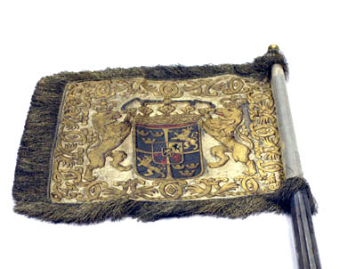 Standar, med kvadratisk duk i gult guldaktigt siden. På båda sidor påmålad dekor med stora riksvapnet i mitten. Målat i gult, svart, blått och rött samt med bruna konturer. Tjock guldfrans ca 80mm. Fästad vid stången med en fastnitad guldbård. Stång av trä, kannellerad i blågrå färg. Nedre del, l 650 mm. Grepp 195 mm. Ovanför detta stålbygel, l 295 mm, med bärring. Från greppet utgående tre stålskenor. Holk av mässing, förgyllt. Konturerad med bredare bas och hals.