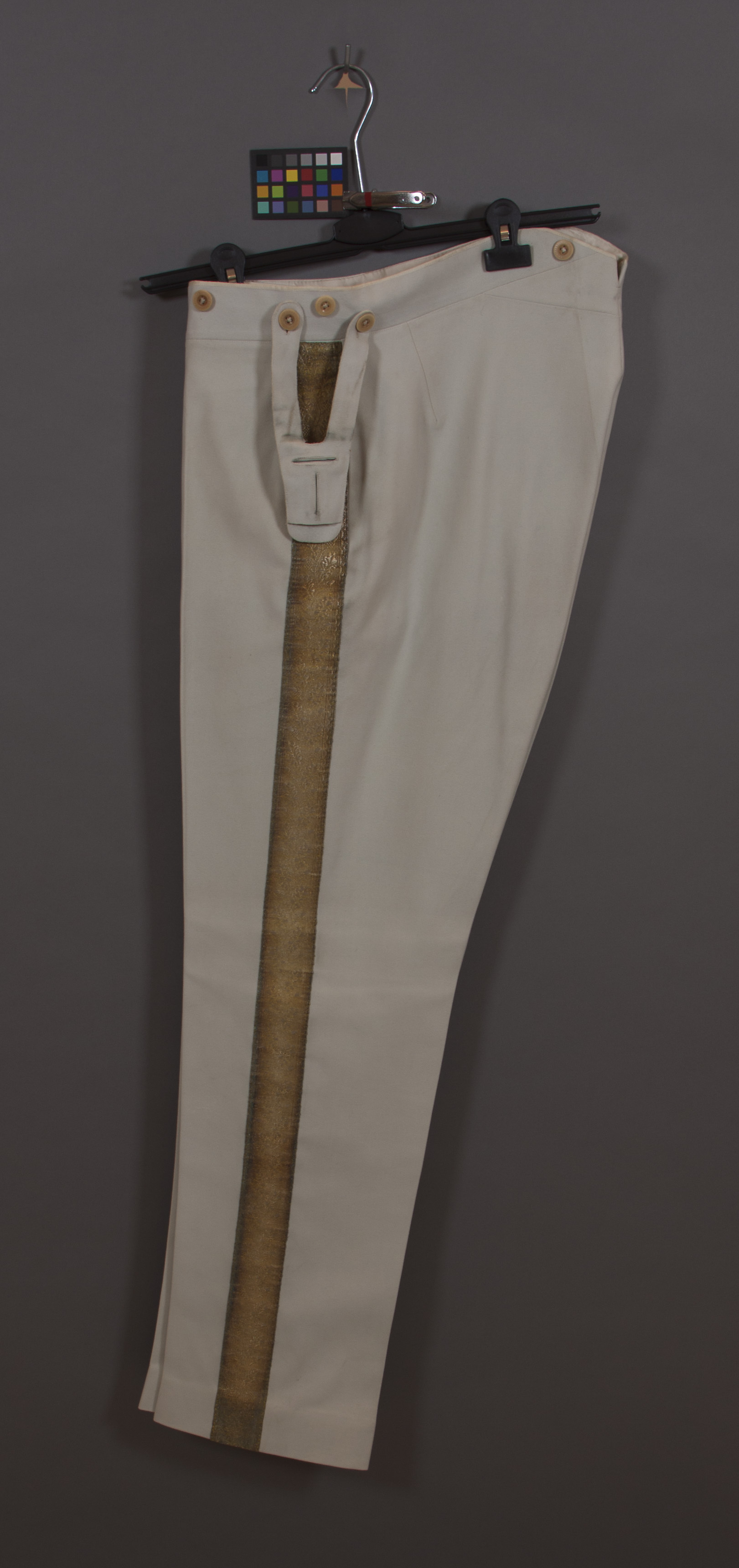 Byxor av vitt kläde knäppta med gylf med fem knappar av vitt ben med firmanamn: " J. M. JANSSON OCH WALLGREN " d: 14 mm. Linning med 9 knappar 17 mm. Två för koppelhylsa. Mitt bak litet sprund. Fickor i sidsömmarna. Utmed dessa 40 mm bred guldgalon. Foder i linningen av vitt siden. fickor av vit bomull. Mitt bak hängare av siden. Innanför linningen spänntamp med firmaetikett: " J. M. JANSSON & WALLGREN // KGL KEJSERL. HOFLEVERANTÖR // 9.7 STOCKHOLM 1912 // Kammarherre E. Hallin ".