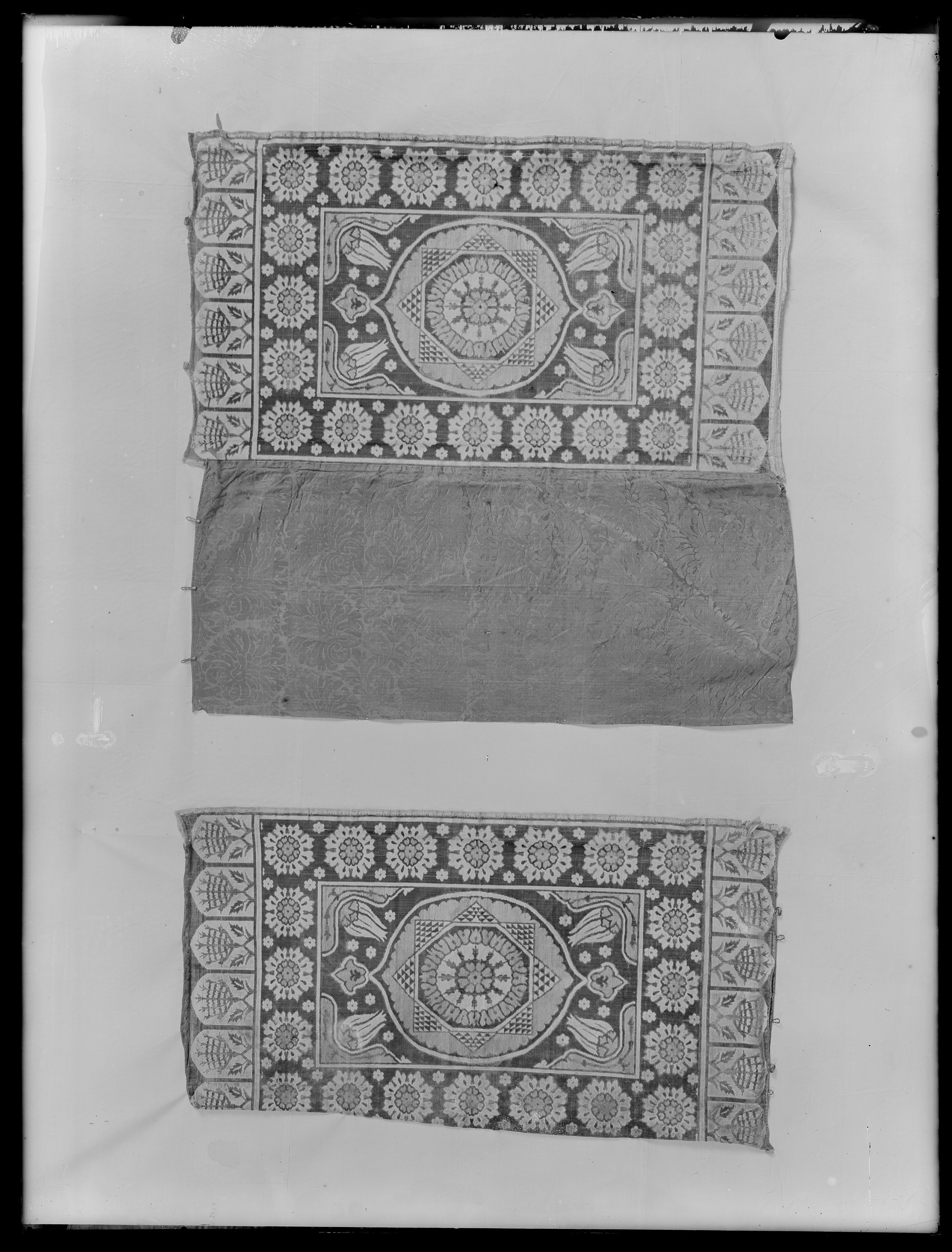 Vådbredd 67 x 118 av H-spunnet rött och grönt silke, broscherad botten med gult silke i kypertbinding 21 (24) ??? av gult silke överspunnen med h-tvinnad förg. lan. H-tvinnat blått silke har begagnats för att sy fast det blå damastfodret. Spegelsymmetriskt mönster. Vit atlasbotten, karminröd skuren sammet i huvudsak grenverk i grönt, blommornas kalkar i guld. Motivets mått 116 x 64 varp 30 x 46-52 tr inslag h tvinnat blått silke