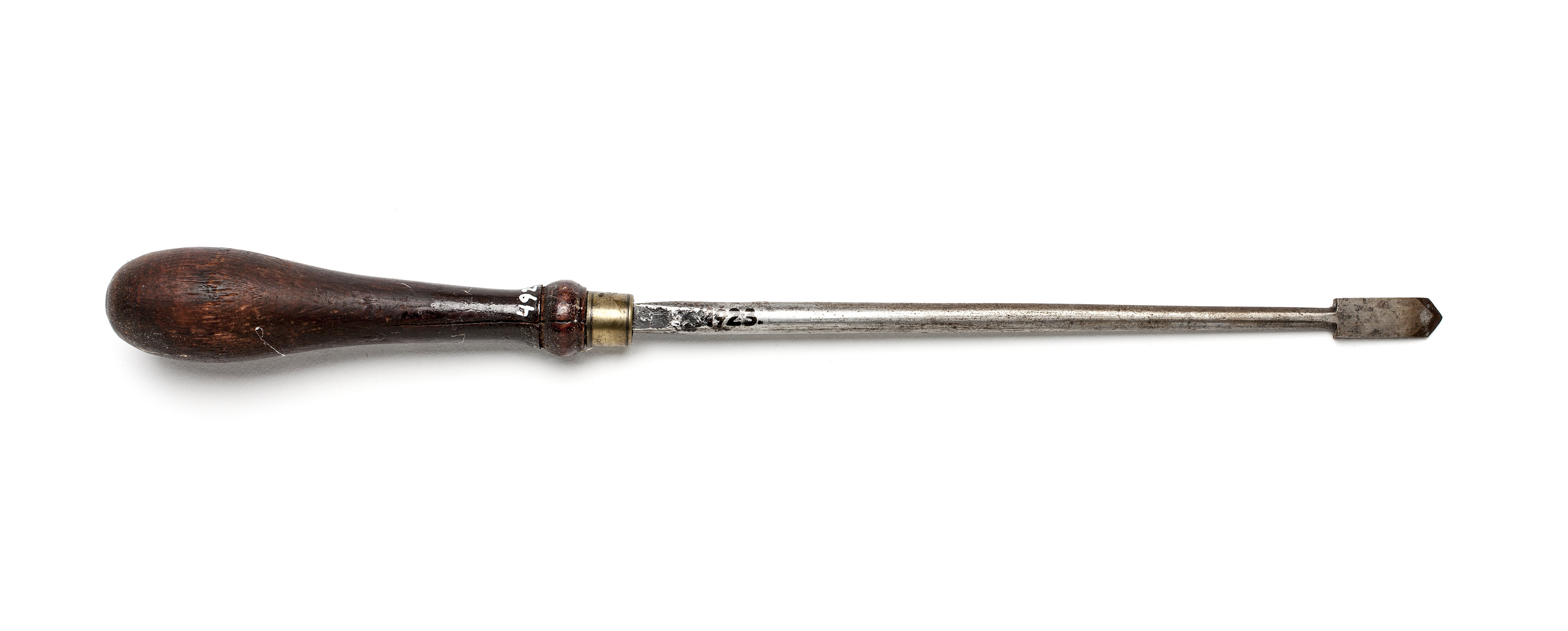 Rund klinga, i ena änden rektangulär eggplatta med spetsig främre egg och två sidoeggar. Svarvat skaft av päronträ med en vulst nedtill. Mässingsring.
