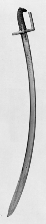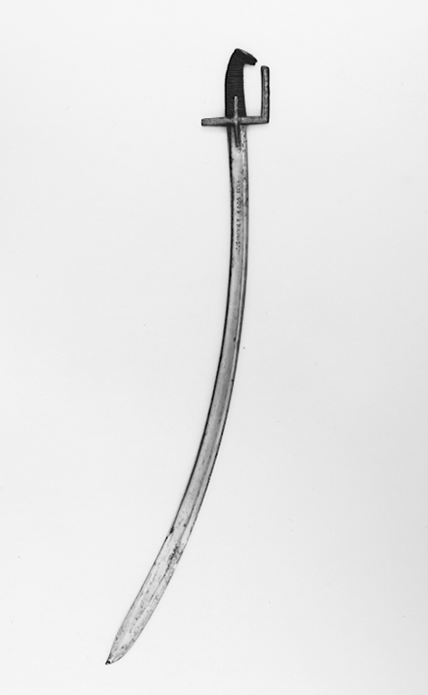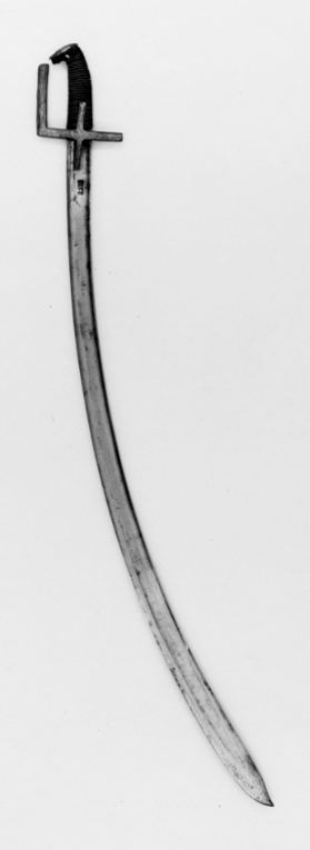 Fäste av mässing, gjutet med rankdekor i låg relief. Raka parerstänger med rektangulärt tvärsnitt, främre parerstången förlängd uppåt i rak vinkel till rak handbygel, öppen upptill, raka styrskenor. Kaveln med ovalt tvärsnitt, upptill framåtböjd i spets med kappa i mässing med graverat ornament. Kaveln klädd med mörkt läder med täta, tvärgående räfflor, i räfflorna tvinnade mässingstråd. Klinga av stål, böjd, eneggad med ett 227 mm långt, tvåeggat spetsparti. En bred, grund hålkäl, i denna intill fästet på utsidan en rektangulär stämpel: "I P Z D" (LRK vägl.1921:51:1), på insidan inslaget:"KRZI STOF KRAINSTI".