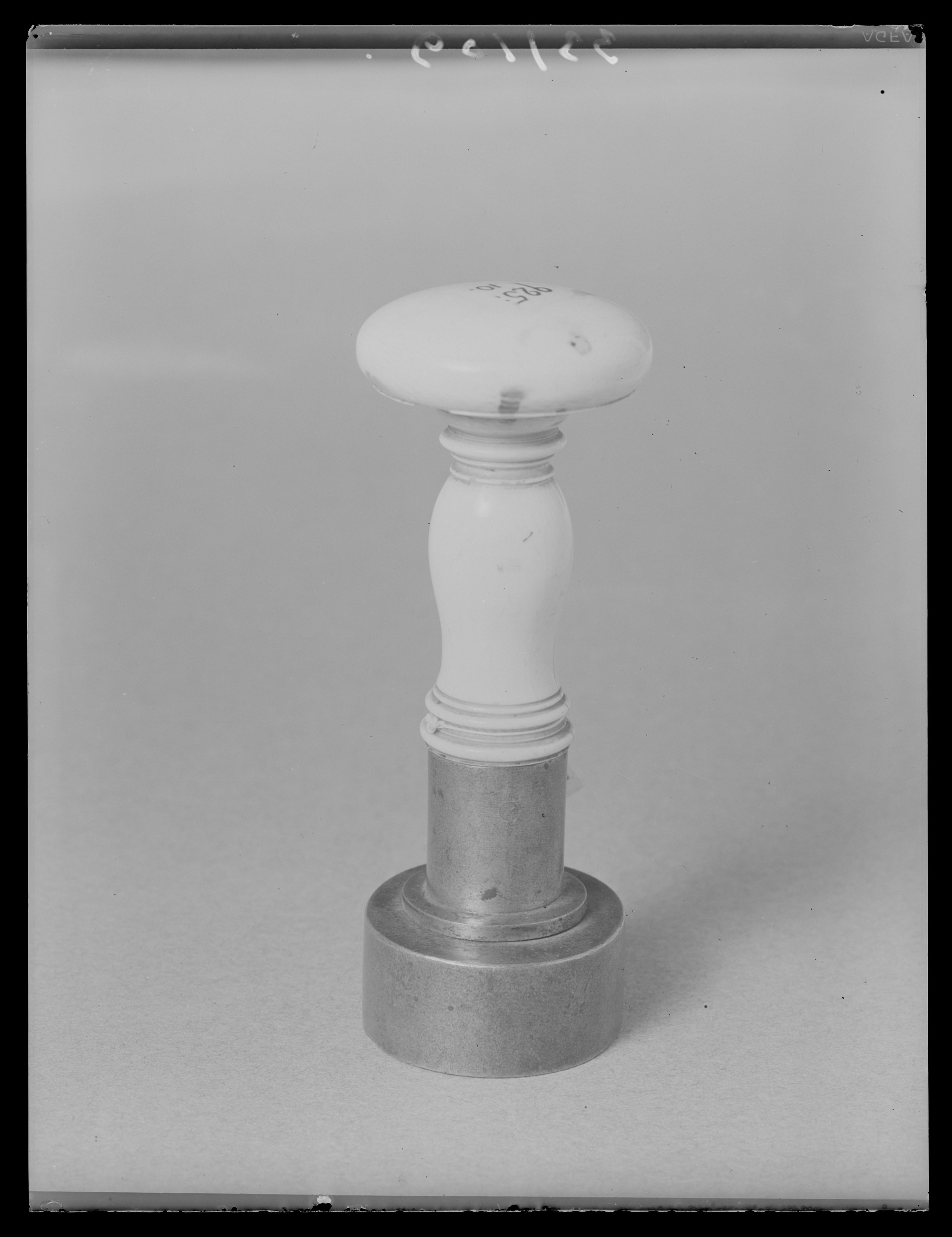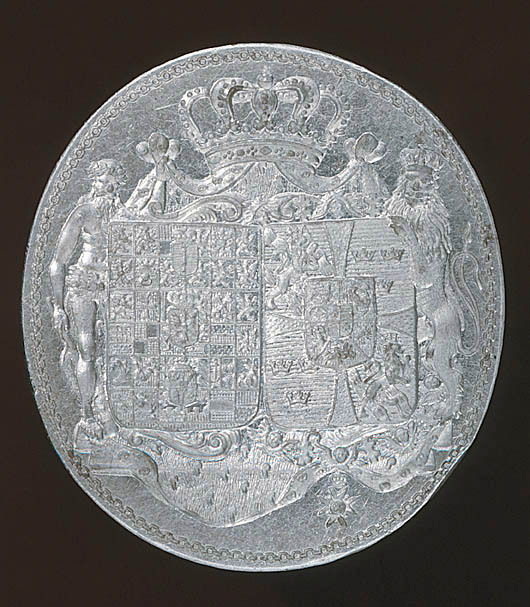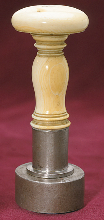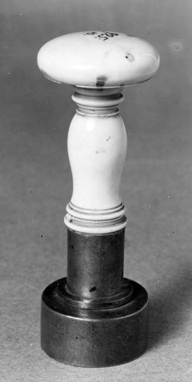 Oval platta av stål, däri graverat alliansvapen, skrafferade färgangivelser. Två sköldar av fransk typ, till höger sköld kvadrerad med ett utböjt kors, tre kronor och folkungalejonet, hjärtsköld Holstein-Gottorp, sköldhållare krönt lejon, fas, skölden omgiven av Serafimerordens kedja och tecken. Till vänster kungariket Preussens stora vapen, fem gånger kluven och delad, tre mittsköldar, sköldhållare vildman. Vapentält krönt av kunglig krona, nertill postament. Kantbård i form av kedja. På plattans ovansida punsat pilformigt märke, rund platta och därpå cylinderformig holk, d: 22 mm, h: 24,5 mm. Svarvat skaft av elfenben, balusterformig nedre del, upptill rund, på ovansidan välvd skiva, d: 45 mm, undersidan skålad.