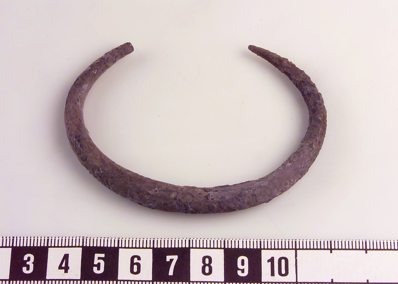 Svagt kantig ten med avsmalnande ändar. Korrossionsskadad. Rester av stämpelornering bestående av motställda trianglar?