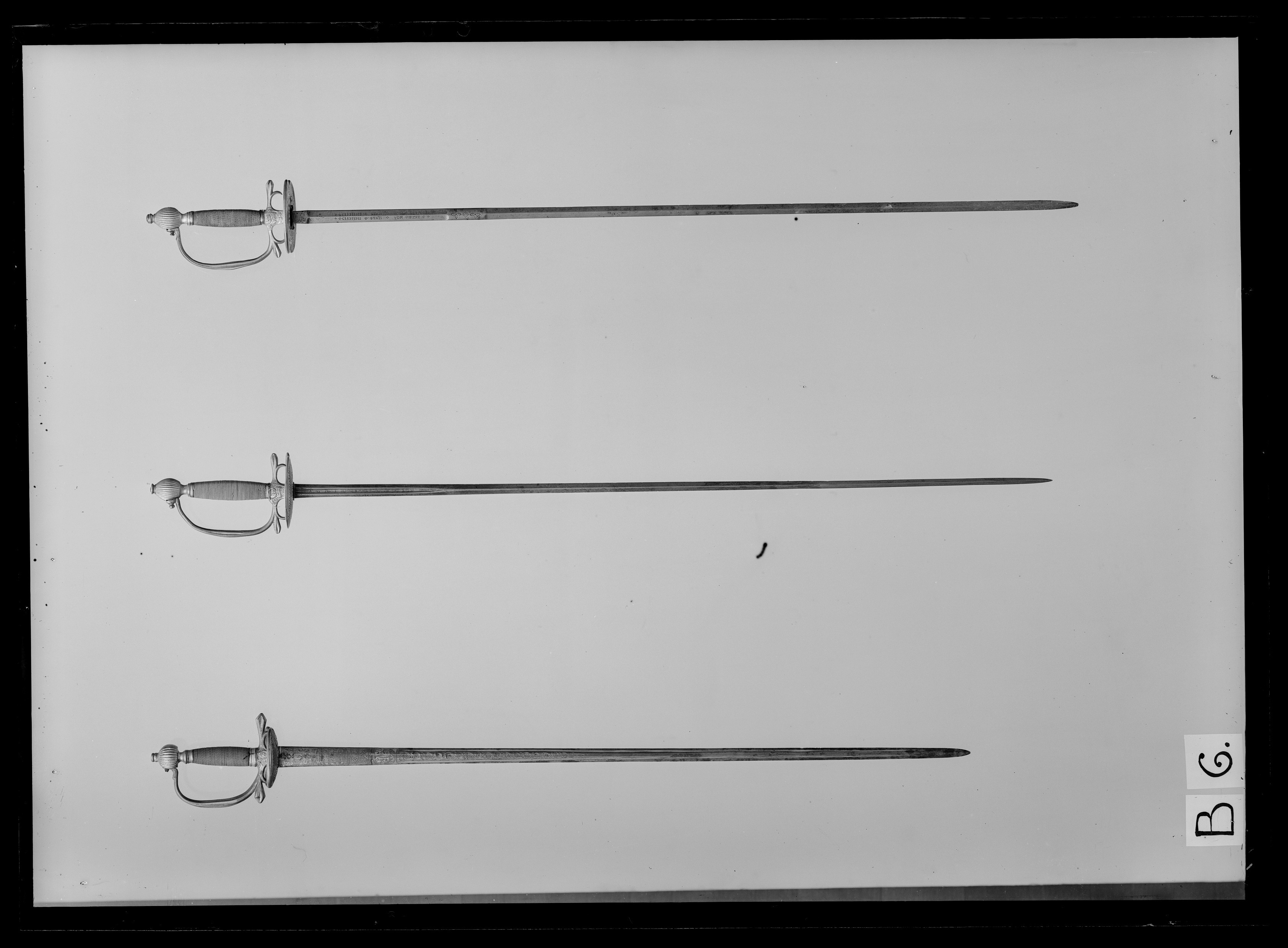 Fäste av förgylld sengustaviansk variant av den efterkarolinska infanteriofficersvärjan. Parerplåtar raka, den inre med scharnér, fällbar uppåt. Klinga smal, med 20 mm lång ricasso, i övrigt slipad med två jämnbreda mötande skär med undantag av ett ca 40 mm långt flackslipat parti som förefinns ca 175 mm från parerplåtarnas utsida. Det flackslipade partiet på båda sidor med punsad ornering i form av två fyrbladiga rosetter, varemellan fyra små fyrsidiga rombiskt ordnade, stjärnliknande ornament. På båda sidor av starka delen klingsmedsmästarens punsade signering: "CLEMENS STAM VON BERG".