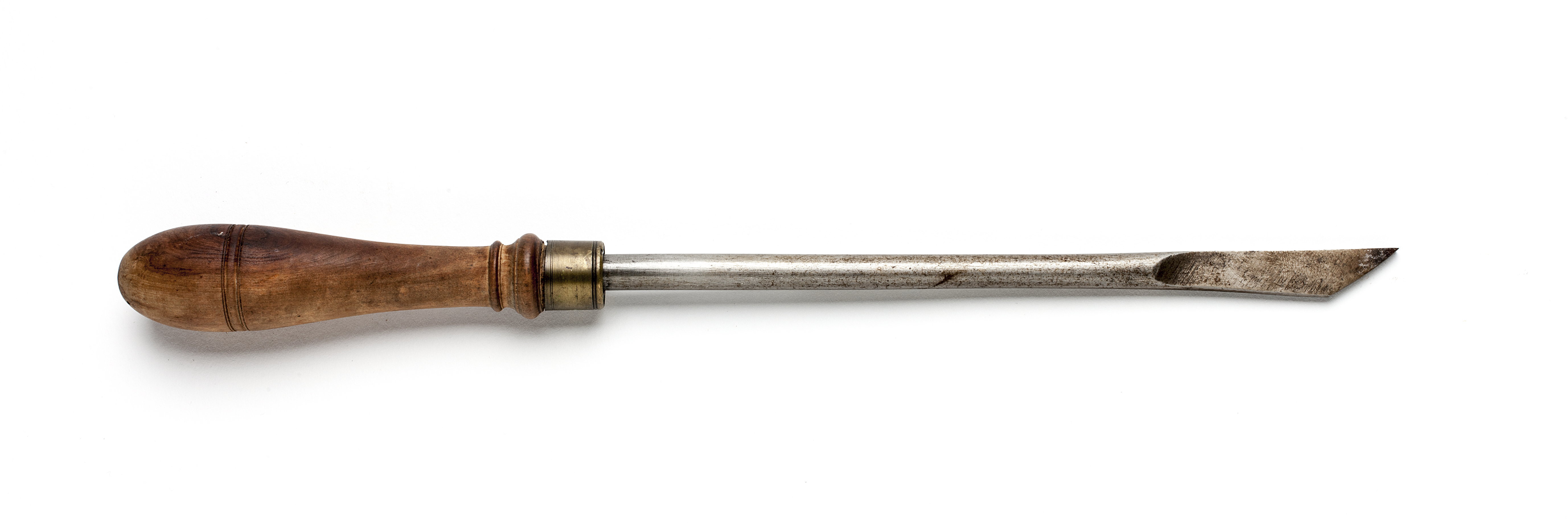 Rund klinga, i änden med rektangulär genomskärning. Svarvat skaft av päronträ med två vulster nedtill ("skoklostertyp"). Mässingsring. Stämpel i skaftets ände vid fästet: "39"? med stansar nr 5375.