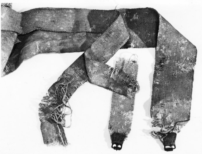 Ett par Steg Läder af oskuret Sammet med Silfvertråd stickade, men Hvalknutarne som därpå sutit, afnötte, Stegböglorne som försilfrade äro behållne.