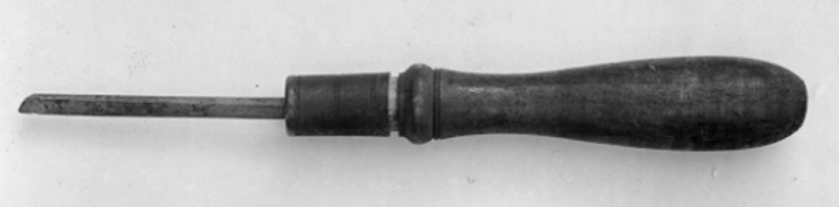 Gravstickel med diagonalslipad egg. Klinga med rombiskt tvärsnitt med ett hörn avskuret. Svarvat, kägelformigt skaft, med fästet dekorerat med en vuslt och skott med em mässingsring dekorerad med 6 svarvade ringar.