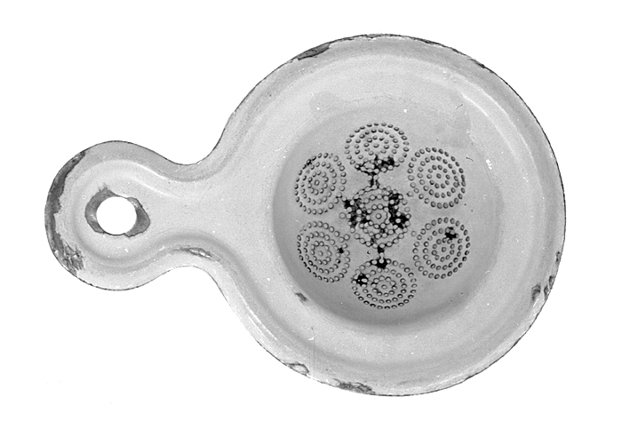 TESILav vitemaljerad stålplåt. Rund, halvsfäriskt skålig, med brett brätte och kort skaft. Silen genombruten med små runda hål, ställda i koncentriska ringar, bildande sju runda grupper; brättet rakt utstående, kring ytterkanten en från undersidan uppdriven grov stav; skaftet platt, brett, med insvängda sidokanter och rundad ytterände, vari ett runt hål, samt med brättets kantstav fortsättande kring ytterkanten. Längd: 13,9 cm.; diameter: 9,6 cm.