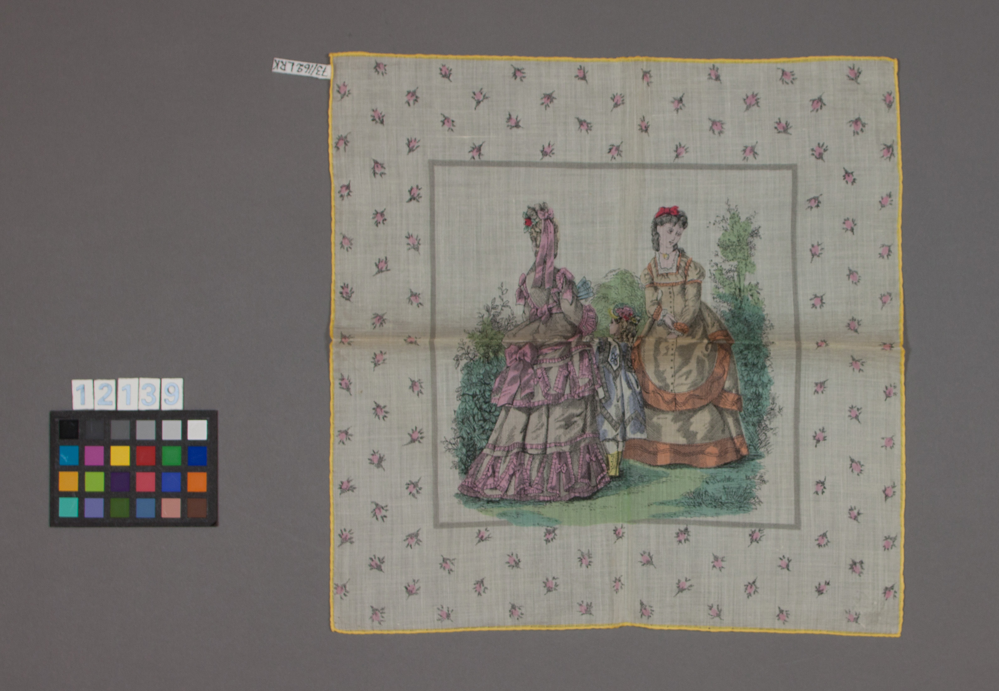 Näsduk av bomullsbatist med tryckt mönster och med snöre insydd i den gulfärgade kanten. I mitten inom en brun ram tre flickor i parklandskap, klädda enligt senare 1800-talsmode i gröna, röda och blå kulörer. I bården spridda små blommor i rosa och brunt.