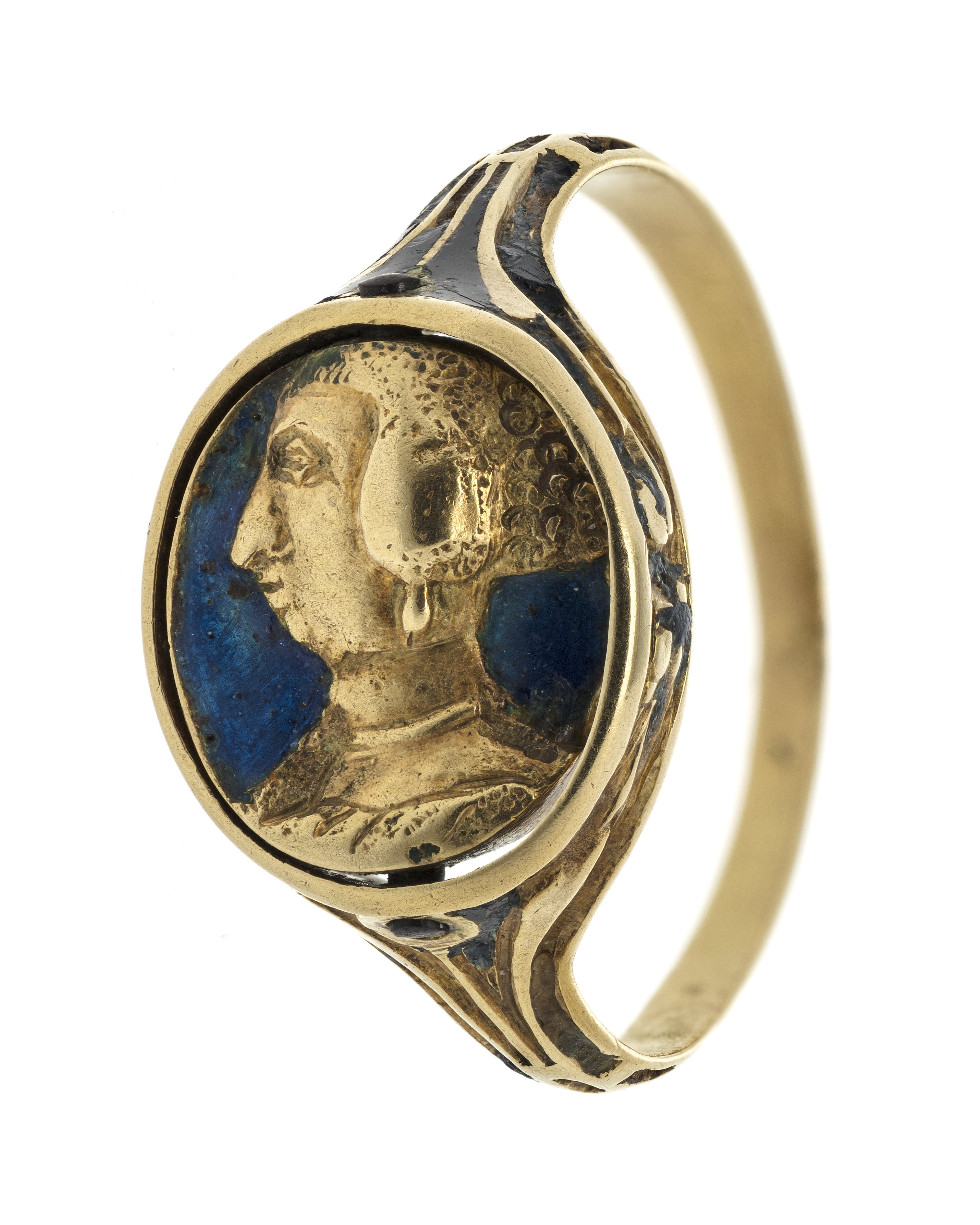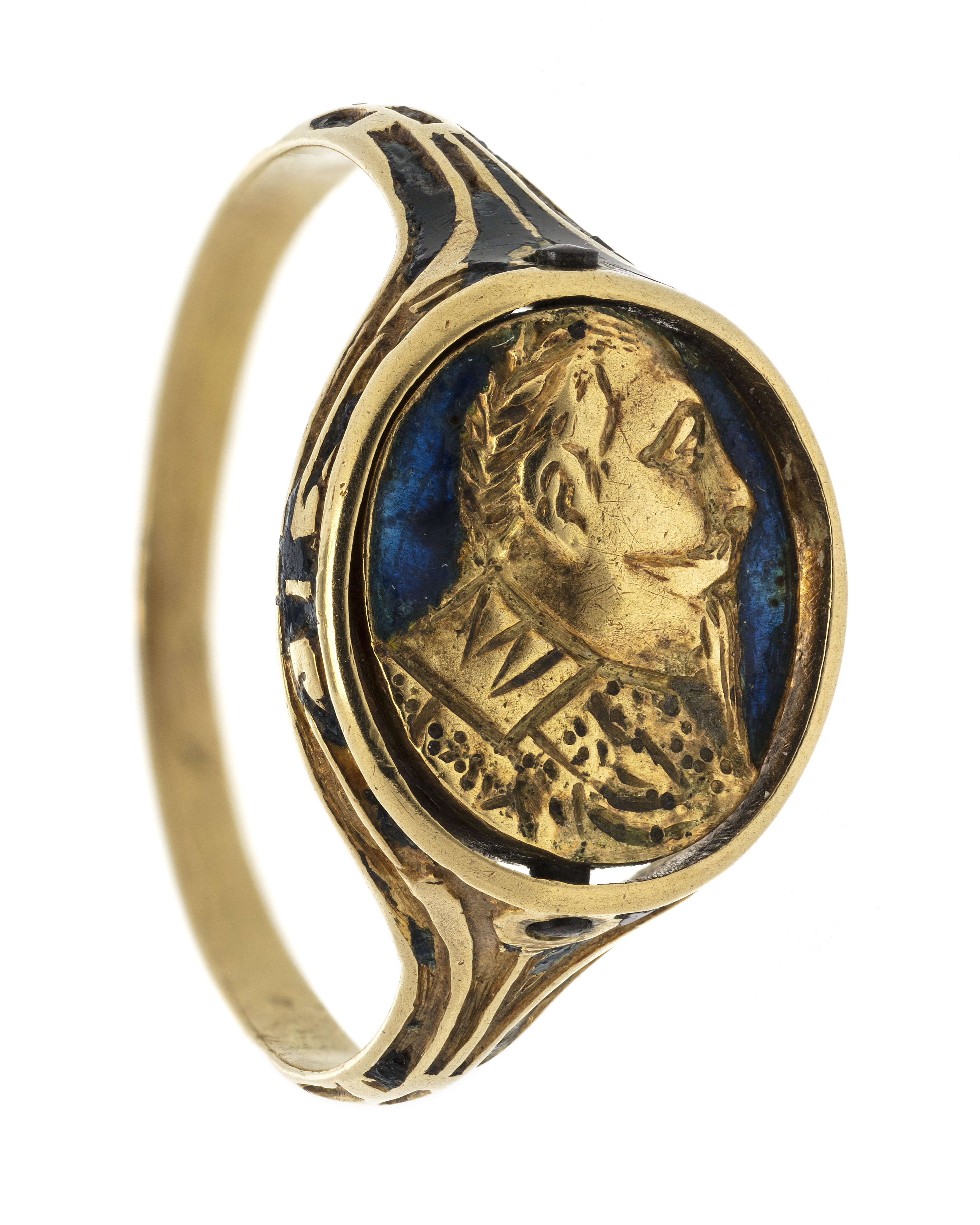 Ring i guld och emalj med rörlig oval del, en klenod, med porträtt av Gustav II Adolf och Maria Eleonora.