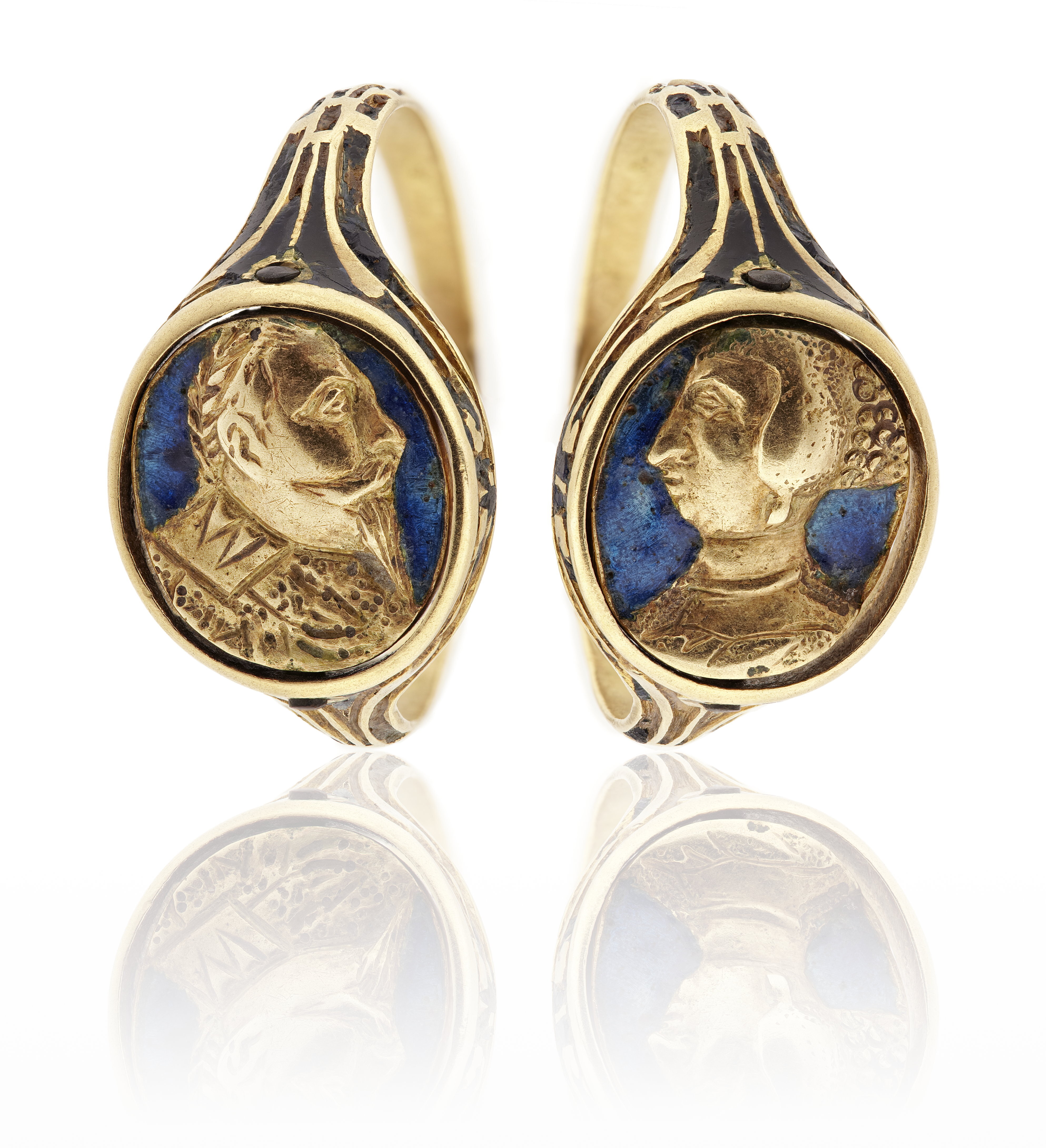 Ring av guld och emalj med framtill infattad rörlig oval (som pärla) med porträtt av Gustav II Adolf och Maria Eleonora.