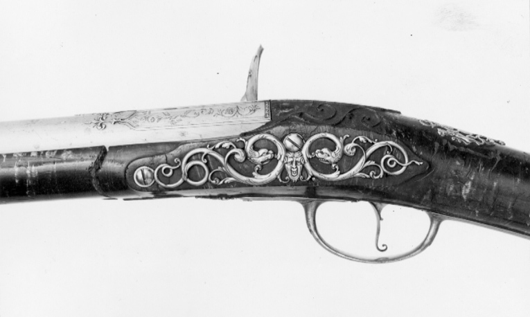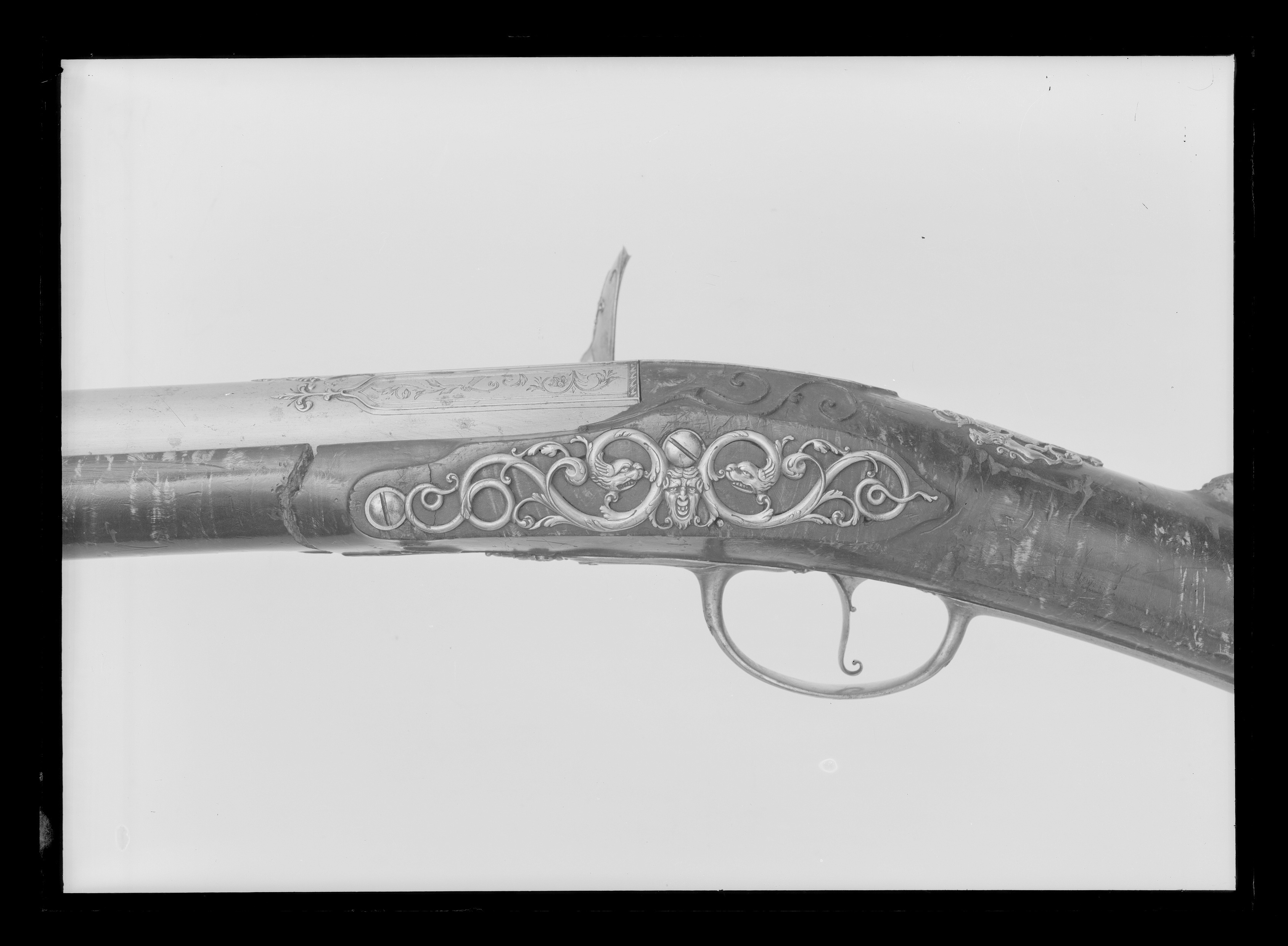 Slätborrad pipa av stål med åttsidig kammare. På svansskruvbladet och de tre övre faserna graverade grotesker och rankor, inramade och framtill avslutade med snidade blad. Mässingstråd i fänghålet. Gördelsikte av silver med masker, litet korn av silver. Under kammaren filat ett X. Rund stämpel M. Fyra häften. Pipan fäst med krysskruv samt tre pipstift av stål. Klassiskt, franskt flintlås med välvt låsbleck och hane, av vilken övre delen fattas. Snidade rankor på hankroppen samt på låsblecket, som även har graverad dekor, ängel med skriftband: "A PARIS", basunblåsande mansfigur och signaturen: "ALEXANDRE MASSON". Rundad fängpanna med små graverade punkter på kanten och falsen. Rundat batteri med snidade bladvoluter och rund klump på gåsbuken. Låg krutskärm. Batterifjädern avbruten. Bladflikiga inre låsdelar, 3-flikig studel med kantlinje. Två låsskruvar. Avtryckare med upprullad ände. Mörkbrun, betsad helstock av valnöt med kolv av fransk typ, snidade båglinjer runt svansskruvblad och spetsrörka. Beslag av stål. Bakplåt vars långa flik följer kolvryggen, graverade kantlinjer, akantus och avslutas med några punkter, två skruvar. 3+1 rörka, 4 rörkstift av stål. Tumplåt i form av svenska riksvapnet. Sidblecket rundat och genombrutet, rankor med mask och två groteska djur i stålsnitt i mitten. Fransk varbygel med graverade kanter, blad, vas och antik byst på bygeln. Kolvlängd 335 mm, sänkning 40 mm. Tillbehör: Brun laddstock med skoning av björk(?), ytterst en rund stålplatta.