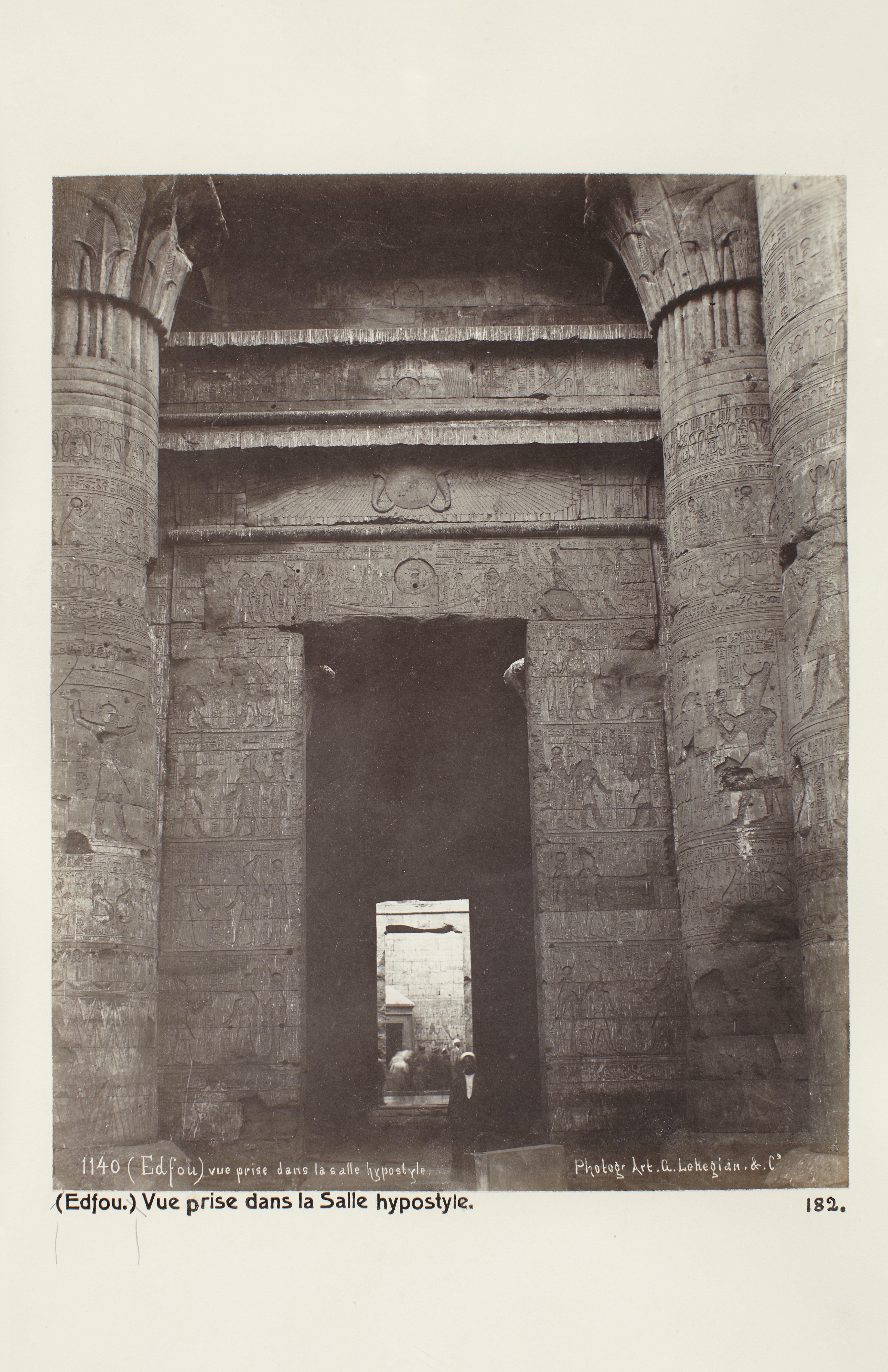Vy från pelarsalen, Edfu, Egypten. Text på fotografiet: Edfou. Vue prise dans la Salle hypostyle Fotografierna LXVI:M.01.- 201. kommer från resan till Egypten och Sudan som Wilhelmina och Walther von Hallwyl gjorde vintern 1900-1901. De lämnade Sverige den 5 november 1900 och fortsatte från Egypten till Palestina den 28 mars 1901. Med på resan var döttrarna Ellen med maken Henric de Maré och Irma med maken Wilhelm von Geijer. Wilhelminas sällskapsdam, fröken Ida Uhse reste också med. Under en del av resan anslöt sig ledamoten av Internationella domstolen i Kairo, assessorn Otto Conrad Waldemar Cedercrantz med makan Anna Elisabeth. Vid resan uppför Nilen hade Walther von Hallwyl hyrt ångfartyget Columbia med besättning. Båtresan startade i Kairo 27 december 1900, gick ända till Wadi Halfa varifrån man reste vidare med tåg till Khartum och tillbaka till Wadi Halfa. Båten vände åter i riktning mot Kairo, men det verkar som att sällskapet tog tåg sista biten, från Luxor. Henric och Ellen de Maré samt fru Cedercrantz lämnade båten redan då de passerade Luxor första gången. Resten av sällskapet återvände till Kairo den 1 mars. Fotografierna LXVI:M.01.-120. togs av resenärerna själva, de största av Ellen de Maré, de mellersta av Wilhelmina von Hallwyl och de minsta av Wilhelm von Geijer. Resten köptes av professionella fotografer i Kairo, de flesta från Studio Photogr. Artistique G. Lekegian & Cie. Alla uppgifter kommer från Ida Uhses reseanteckningar. Inköpt hos studio Photogr. Artistique G. Lekegian & Co.