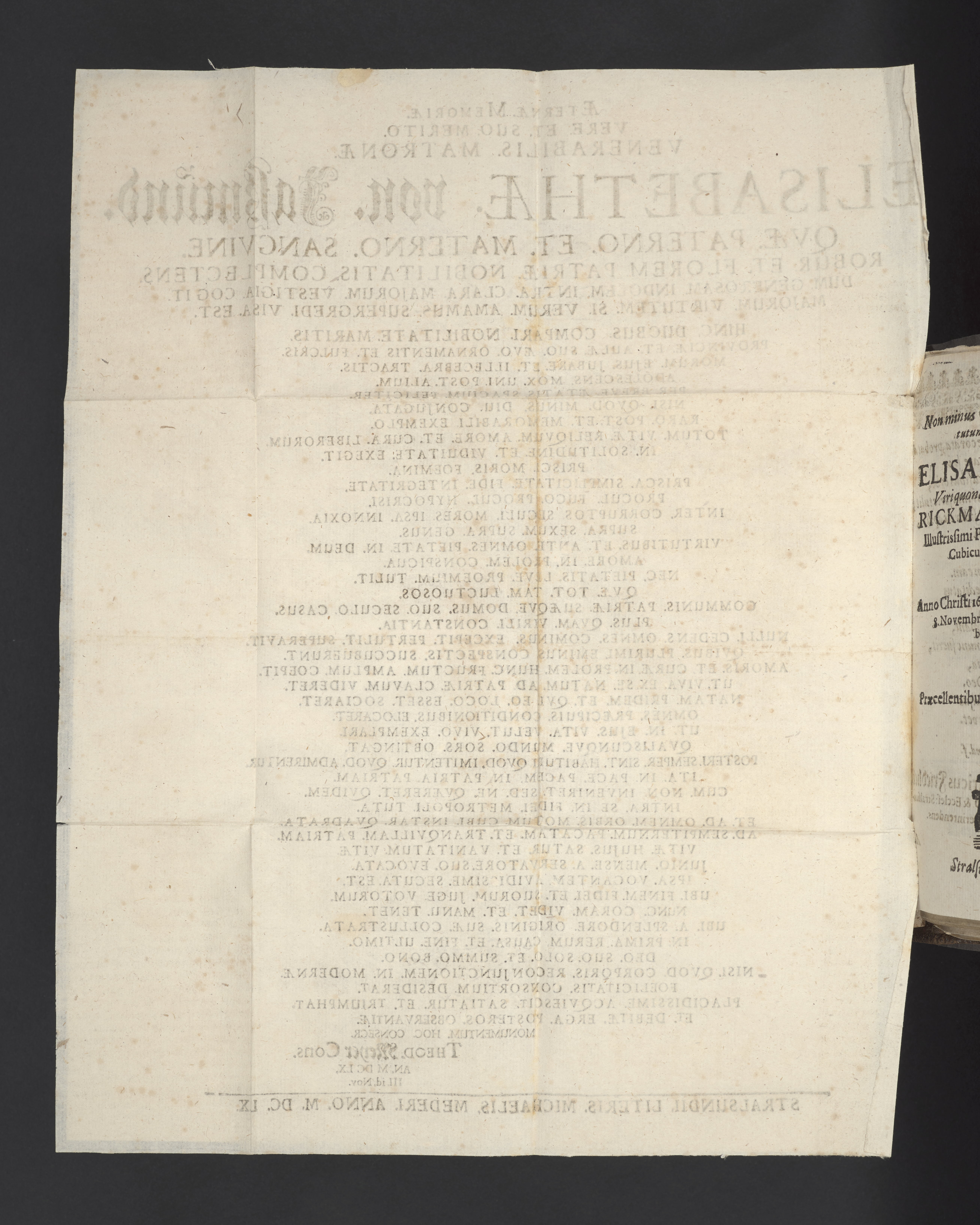 Gratæ memoriæ ultimoq[ue] honori ... Elisabethæ â Jasmund ... Rickmanni von der Lancken ... relictæ viduæ anno Christi 1660 ... 8 Novembr anni prædicti in æde Nicolaitæna ... reconditæ monumentum à ... præstantissimis viris & amicis erectum. Stralsundi, literis Michaelis Mederi.