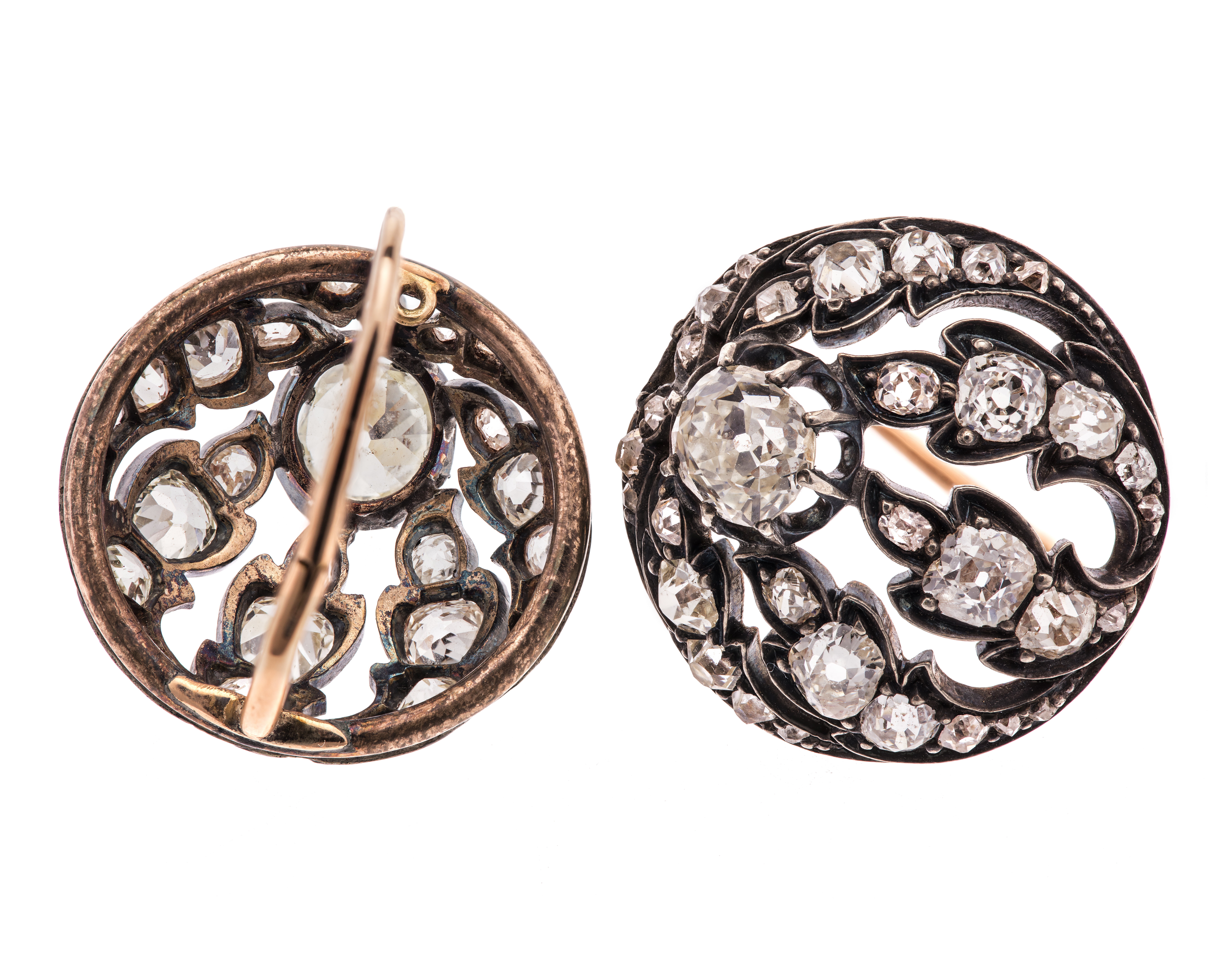 Av guld med brasilianska briljanter. Runda;vardera av en rundstavig, ring, inom valken utgående uppåt mot en stor knopp sju långsträckta flikiga blad, de fem nedre större och femflikiga, de båda övre treflikiga. Gåva till Johanna Kempe, f. Wallis under 1860-talets förra hälft från hennes make Wilhelm Kempe. Inköpt hos juvelerarfirman Gustaf Möllenborg.