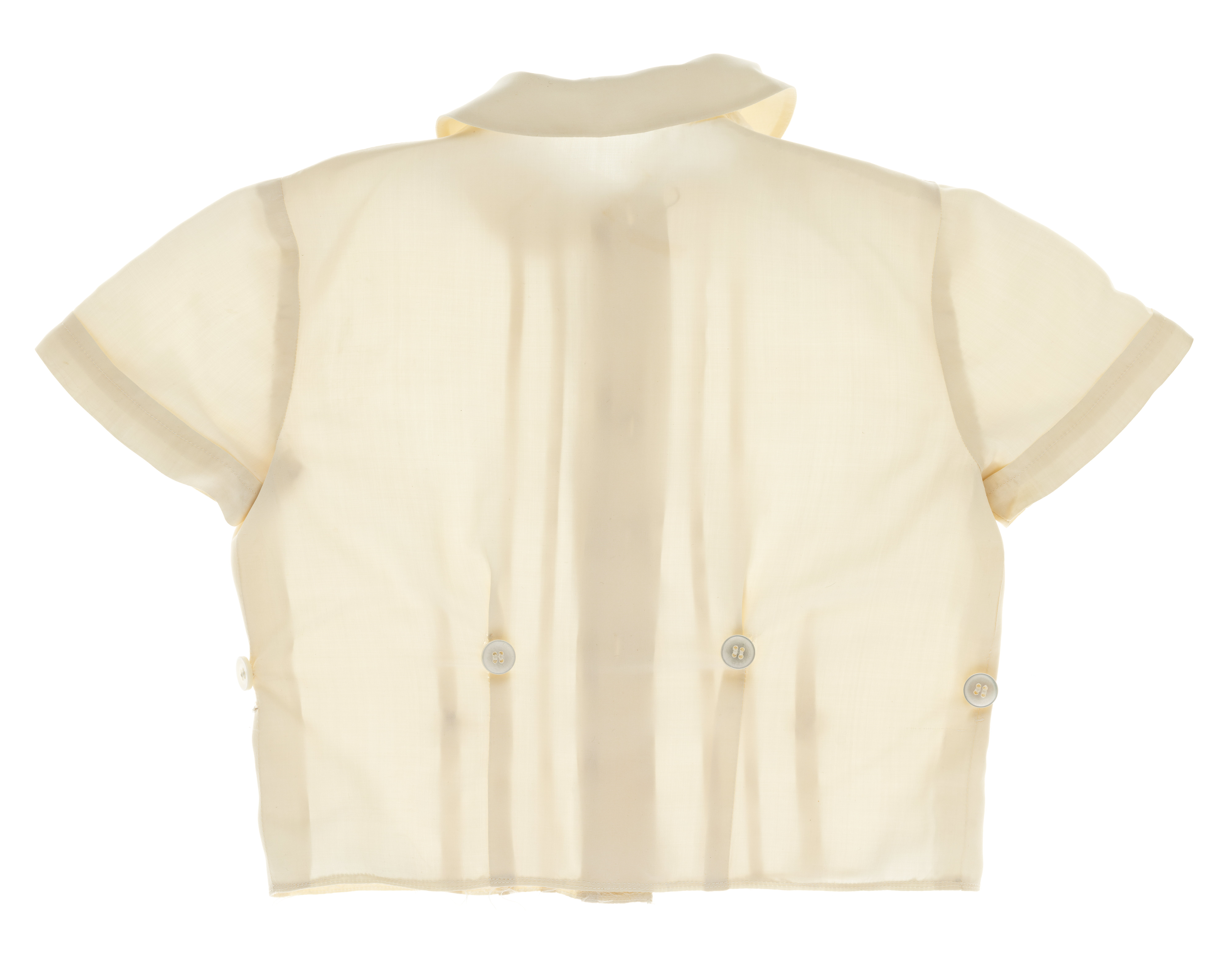 Blus till gosskostym av vitt ylle. använd av Carl XVI Gustaf vid Gustaf V:s 90-årsdagsfirande 1948.