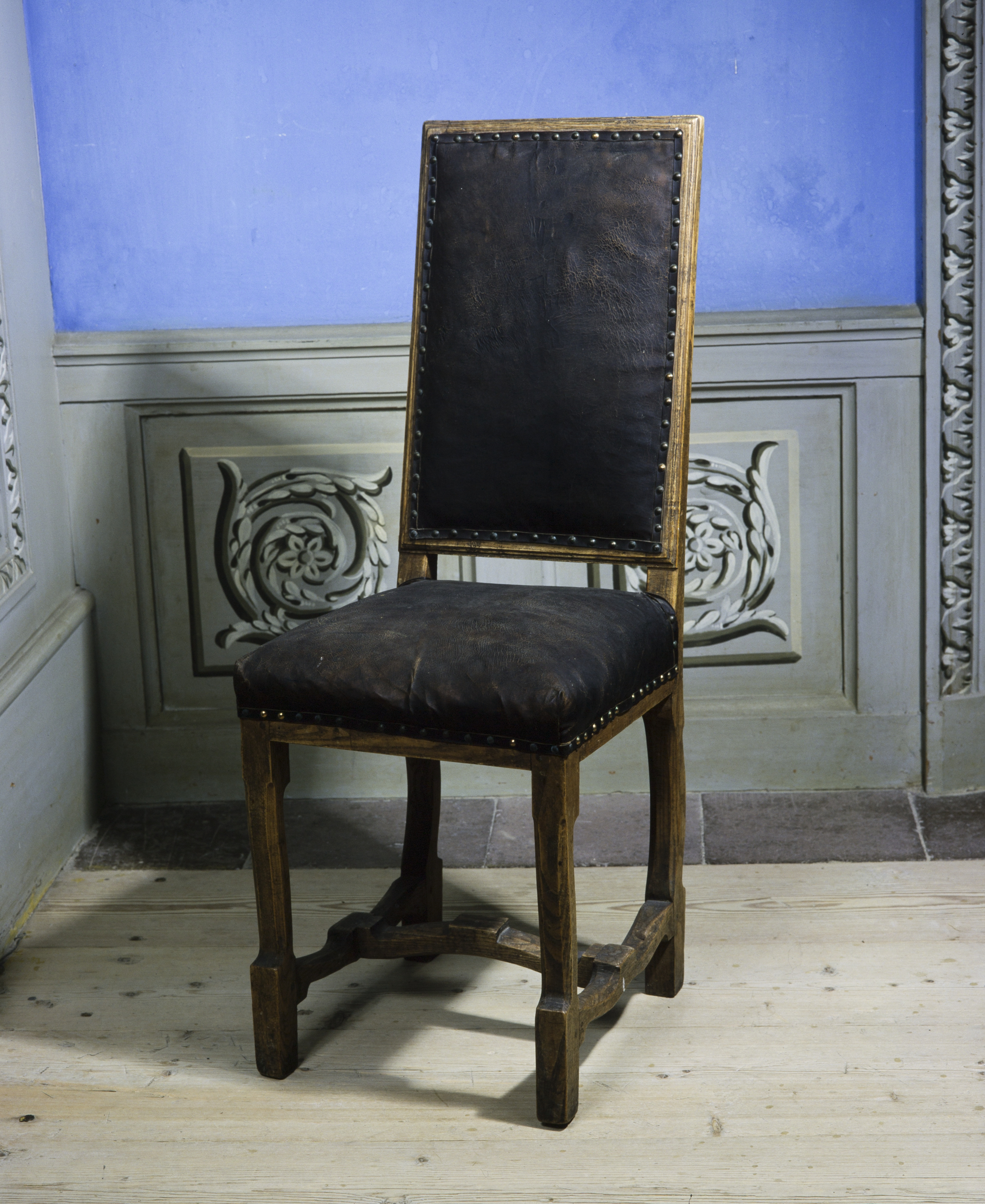 Skuret kryss med svagt välvd mittslå och svagt nedåtböjda sidoslåar. Mitt på slåarna rektangulär platta. Skurna framben med åttsidigt mittparti och fyrkantig över- och nederdel. Bakbenen skurna som frambenen , men mittpartiet är mjukt bakåtdraget , går i ett med ryggstödsramen. Något bakåtböjd , hög , rektangulär rygg. Sits och rygg stoppade och klädda med svart skinn fästat med mässingstännlikor. Under sitsen "A: B: 1708" , skrivet med svart färg. Bakpå ryggstödet "A" skrivet med bläck.