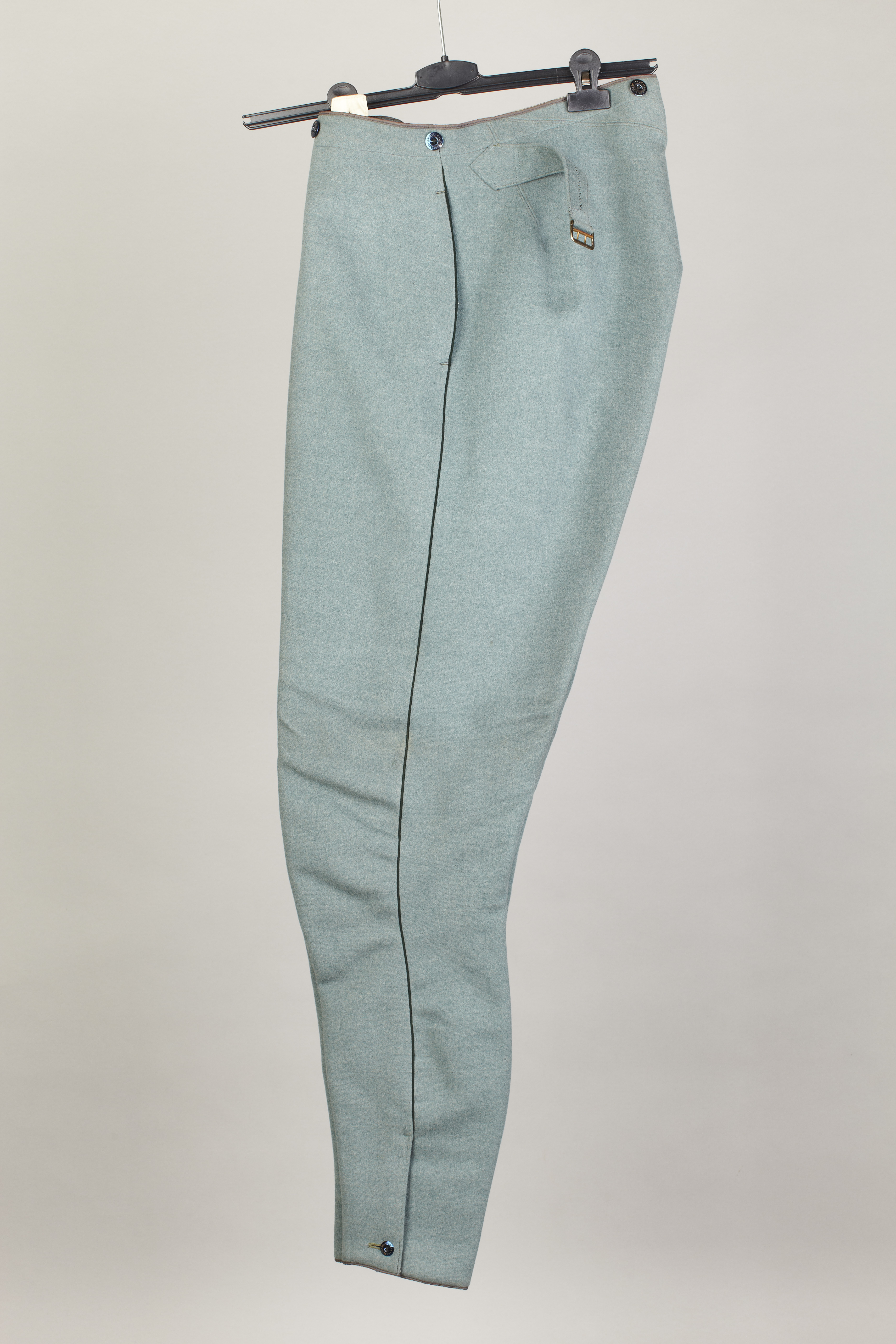 Långbyxor av blågrå yllejersey med svart klädespasspoal i sidsömmen. Gylf med dold knäppning med fem blåemaljerade knappar, d: 15 mm, märkta: "L.H.BERGER, COLLANI & C:O", samt mässingshake och hyska upptill. Utefter limningskanten sex knappar av samma sort som gylfknapparna, d: 17 mm. Baktill spänntampar med mässingssölja märkt: "GERMANY". Nedtill på byxbenen sprund som knäpps med en mindre knapp. Två sidsömsfickor och en liten stolpficka framtill. Helfodrad med grå ylleflanell. Limningsfoder av vitt siden.