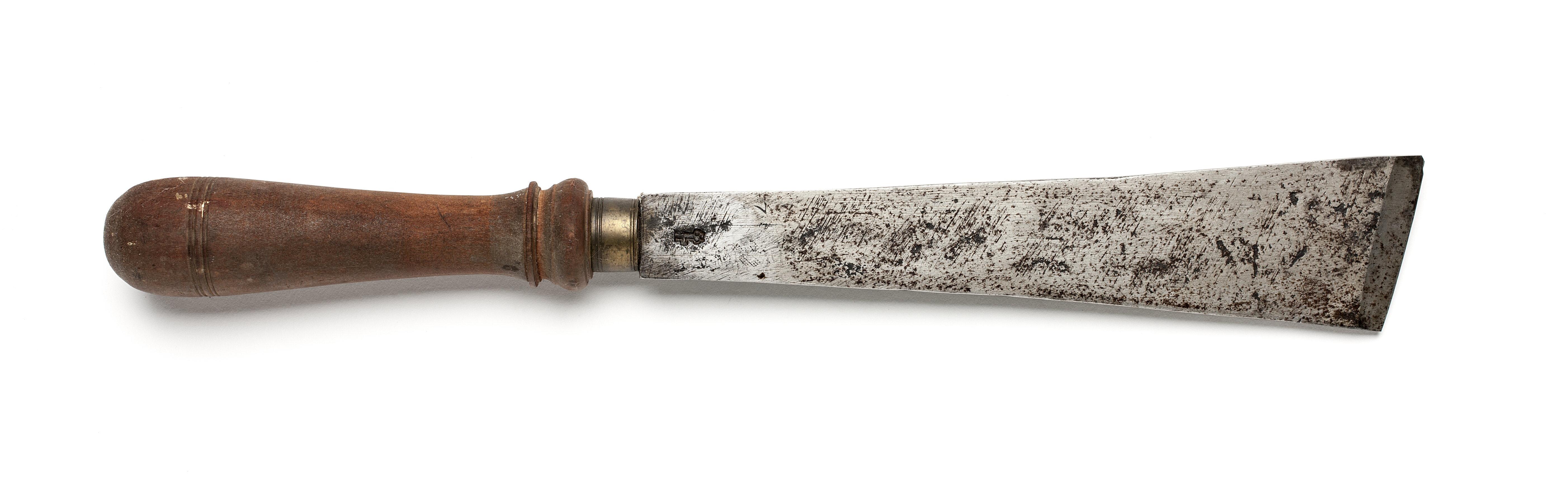 Klinga med rektangulär genomskärning. Sned egg. Stämplat på klingan: nyckel samt "7" (frakturstil). Svarvat skaft av päronträ, med två vulster nedtill ("rydboholmstyp"). Mässingsring.