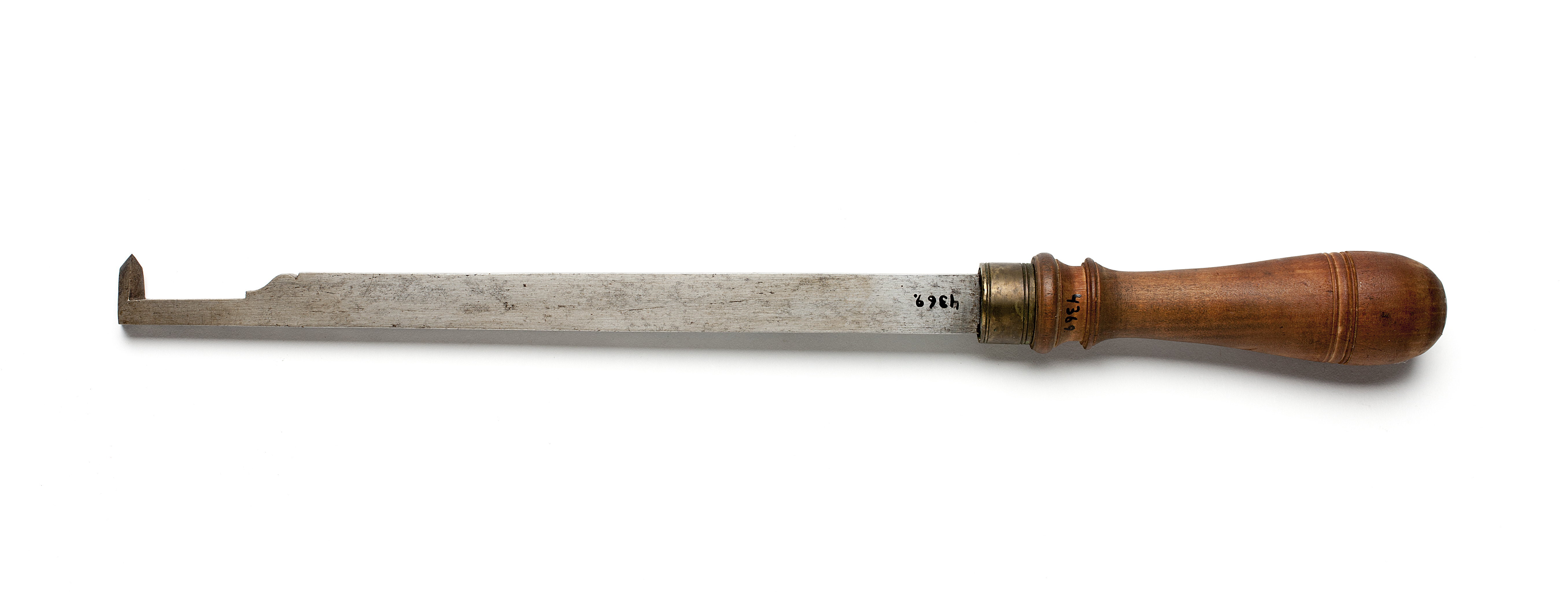 Klinga med rektangulär genomskärning, övergående via profilering på ena sidan i smalare, vinkelböjd ände med spetsig egg. Stämplat på klingan: "IK" under krona, Johan Kesemaker, Stockholm. Svarvat skaft av päronträ, med två vulster nedtill ("rydboholmstyp"). Mässingsring. Stämplat på skaftet: "NB".