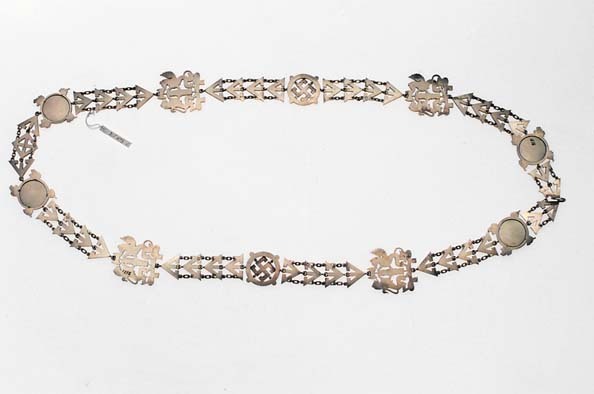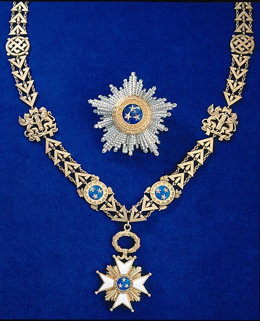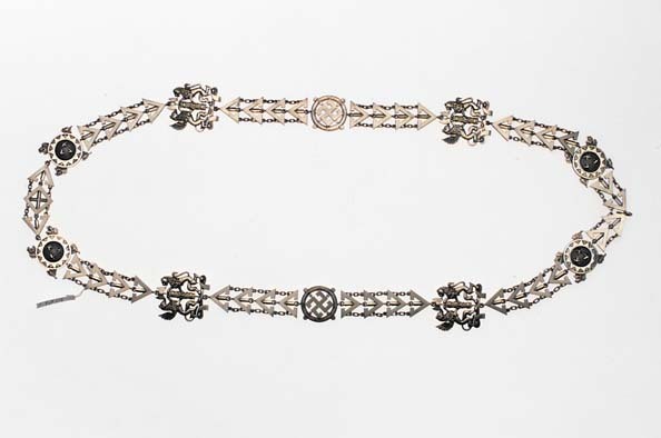 Kedja sammansatt av tio småkedjor av förgyllt silver, bildade av fyra triangulära ornament, förenademed dubbla kedjor samt ring, två av ornamenten något avvikande: framtill ett teckenfäste med de tvåmittersta trianglarna fast förenade med spetsarna motvarandra. Baktill ett ornament sammansatt av två trianglar samt en kvadratisk länk omskrivande kors, påbaksidan stämplar: F.MUELLER, F M, manshuvud(?) 875, manshuvud (?), övriga småkedjor stämplade medmanshuvudet. Dessa två ornament flankeras av länkar med rund, blåemaljerad platta och därpå fäst trefasetterade, femuddiga, förgyllda stjärnor, omgivna av kantring med sicksackdekor. Bakom plattornatvå korslagda, förgyllda ekkvistar (endast spetsarna syns). Fyra länkar i form av bifasces hållen av grip och lejon, stående på band. Mitt på kedjehalvorna tvålänkar i form av svastika med vinklade ändar, inskriven i ring, på ringens utsida fyra små rundlar.