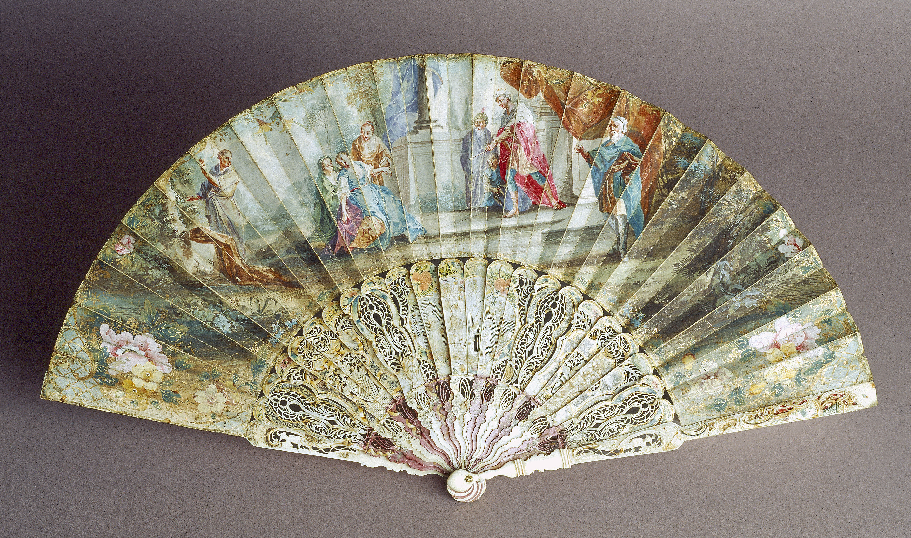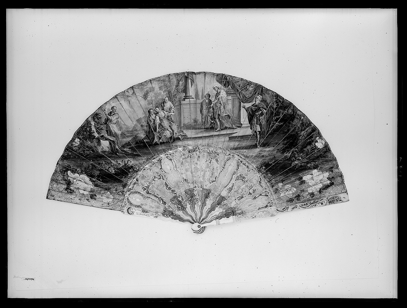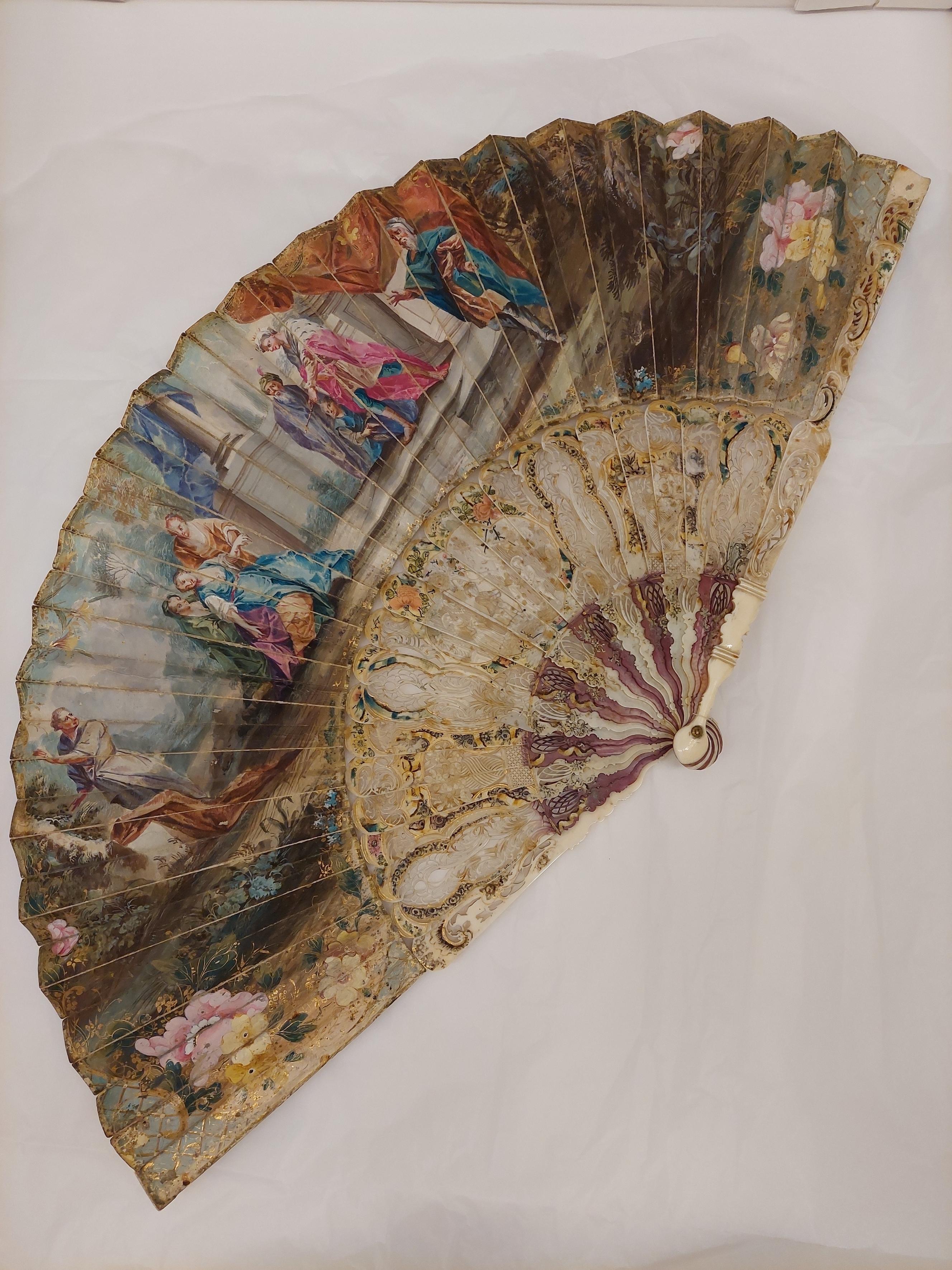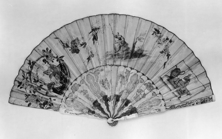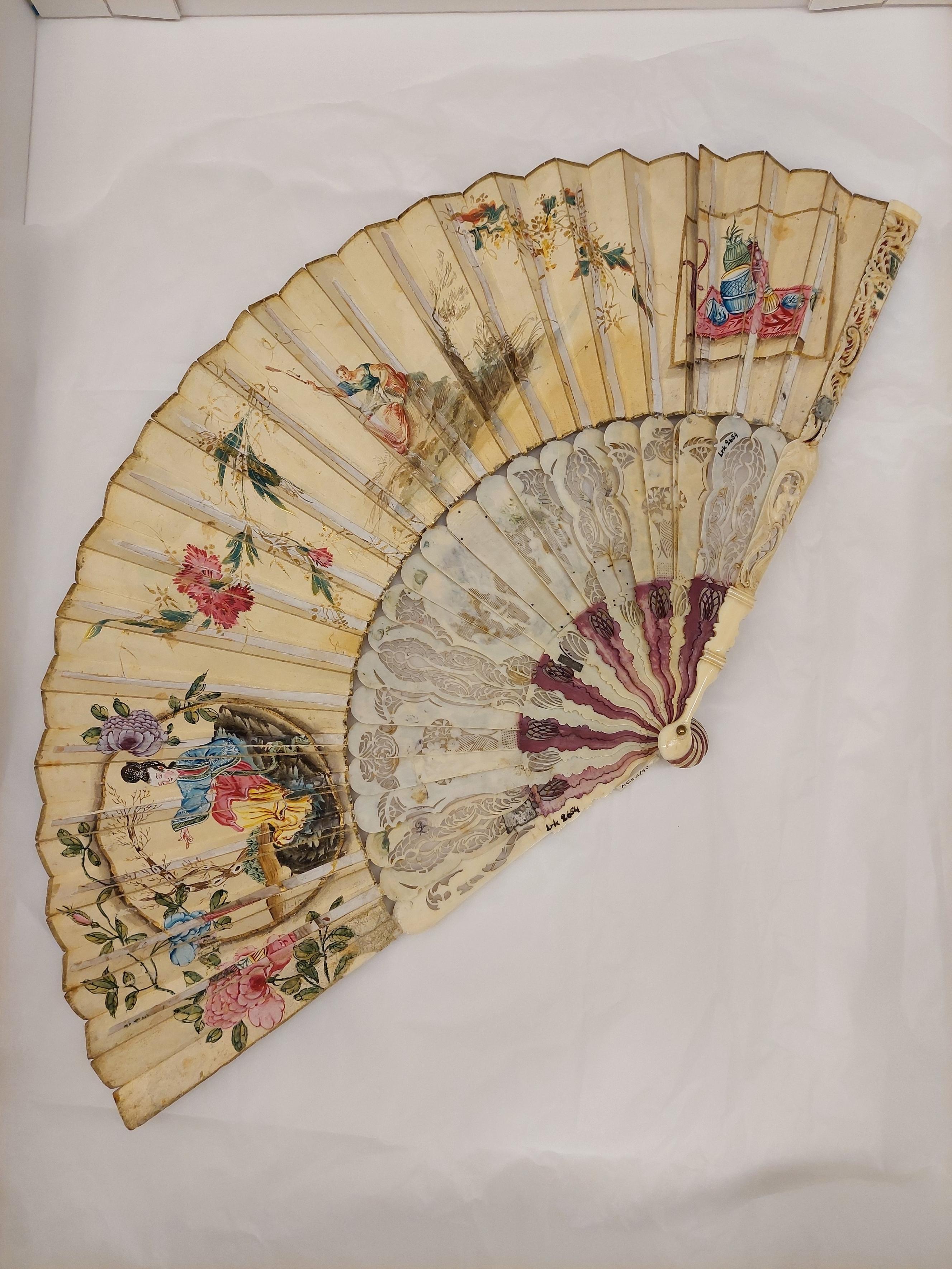 Stomme av ben, 24 delar. Rikt genombrutet arbete. Dekor i två zoner, nertill sockel, tolv röda och tio vita blad, målad dekor i ockra, vitt och brunt, endast delvis genombrutet. Övre zonen i delvis mycket genombrutet arbete, tre fält med reliefdekor, i mitten figurscen, kvinna, man, pojke och hund. De yttre visar blomsterurnor. Målad dekor i flera färger och guldbrons, blommor m.m.. De yttre bladen går över solfjäderns hela bredd, snidad, delvis genombruten dekor, bl.a. kines. På stommen fäst 130 mm bred skärm av pergament med målad dekor. På utsidan figurscen i gouache, Ester inför Ahasverus, till höger A. I hermelinsbrämad röd mantel, turban med antik krona, spira, bakom honom page och gammal man med turban, till höger vitskäggig man i brun dräkt och blå mantel. Till vänster tre kvinnor, Ester i blå klänning och gulbrun underkjol, kvinnan till vänster i grön klänning, till höger i brunt. Längst till vänster man i grå dräkt. I ytterkanterna kinesiserande blommor i rosa och gult med guldinslag. På insidan dekor i gouache med guldbronseffekter, spridda blommor. I mitten sittande kvinna med stav (herdinna), dräkt i blått och brunt, till vänster oval medaljong med sittande kinesisk kvinna, dräkt i blått, rött och gult, till höger rektangulärt fält med olika kärl i blått, rött och gult, till höger rektangulärt fält med olika kärl i blått, grönt, rosa och lila, stående på rosa matta. Bladen nertill ihopfästade med silverstift(?).