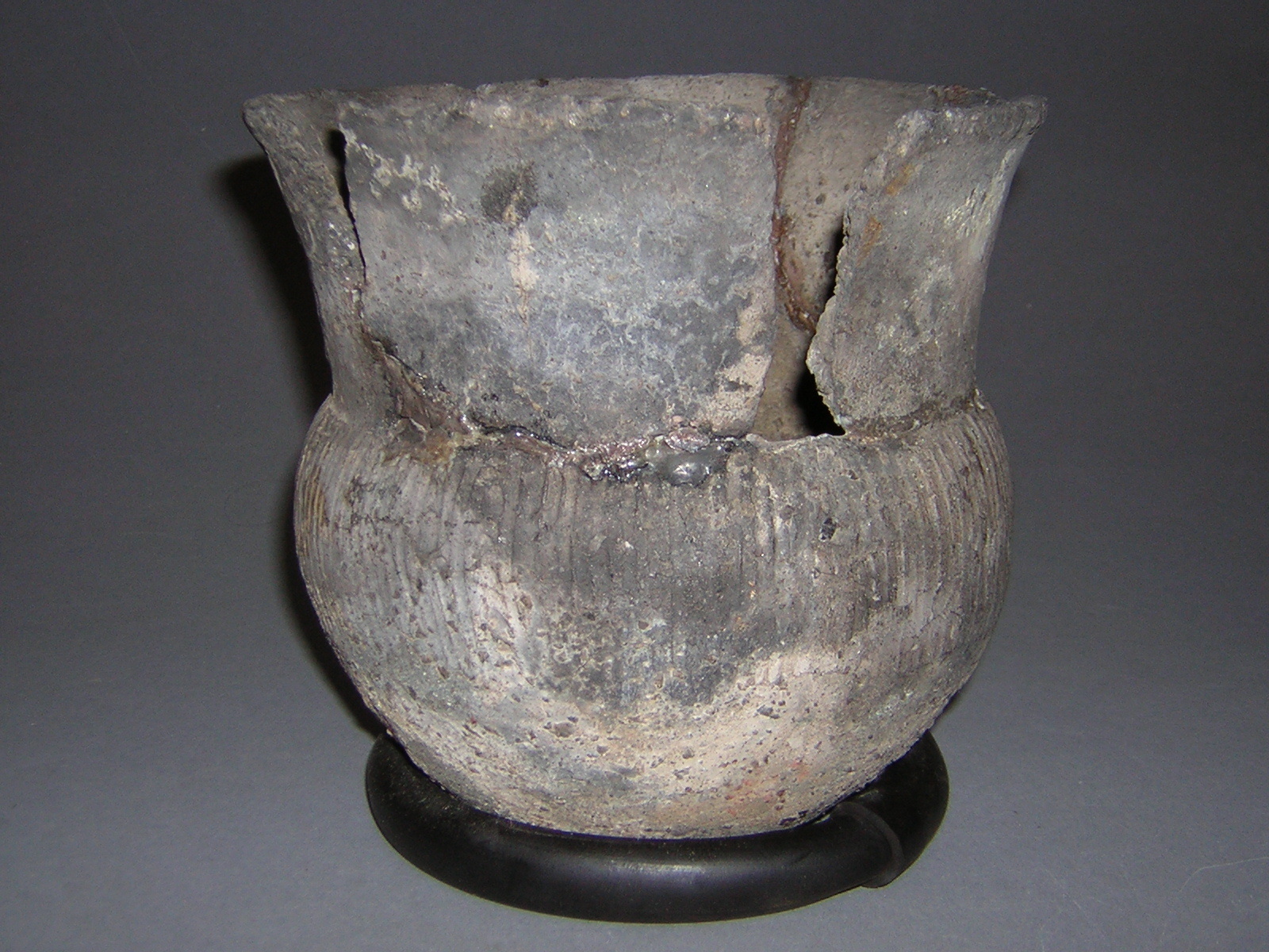 Trattbägare av keramik, ornerad med lodräta linjer från buken och ned till botten.