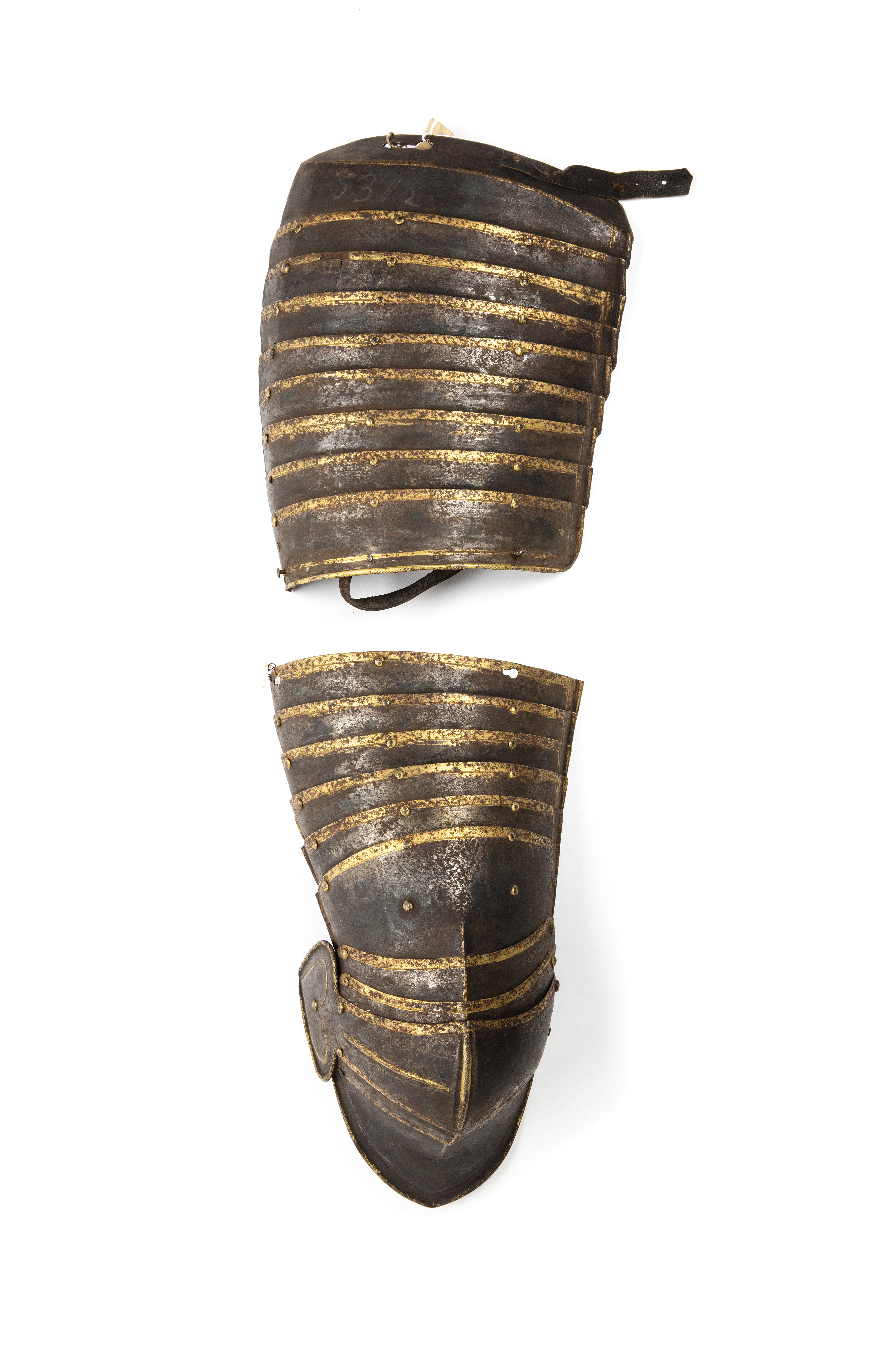 Av svärtad järnplåt med förgyllda kanter, 20 skenor på insidan förstärkt med läderremmar. Spänne och läderrem för fästande kring benet. Ursprungligen ytterligare rempar längre ner för fastspännande. På höftskena förgyllt spänne. På höftskenan fäst läderrem, till spännet på vänster lårskena. Övre delen, nio lameller, kan användas som separat del och är därför avslutad med en kant, ca 5 mm, som imiterar rep. Nedre delen av lårpansaret inbegriper knäskyddet.