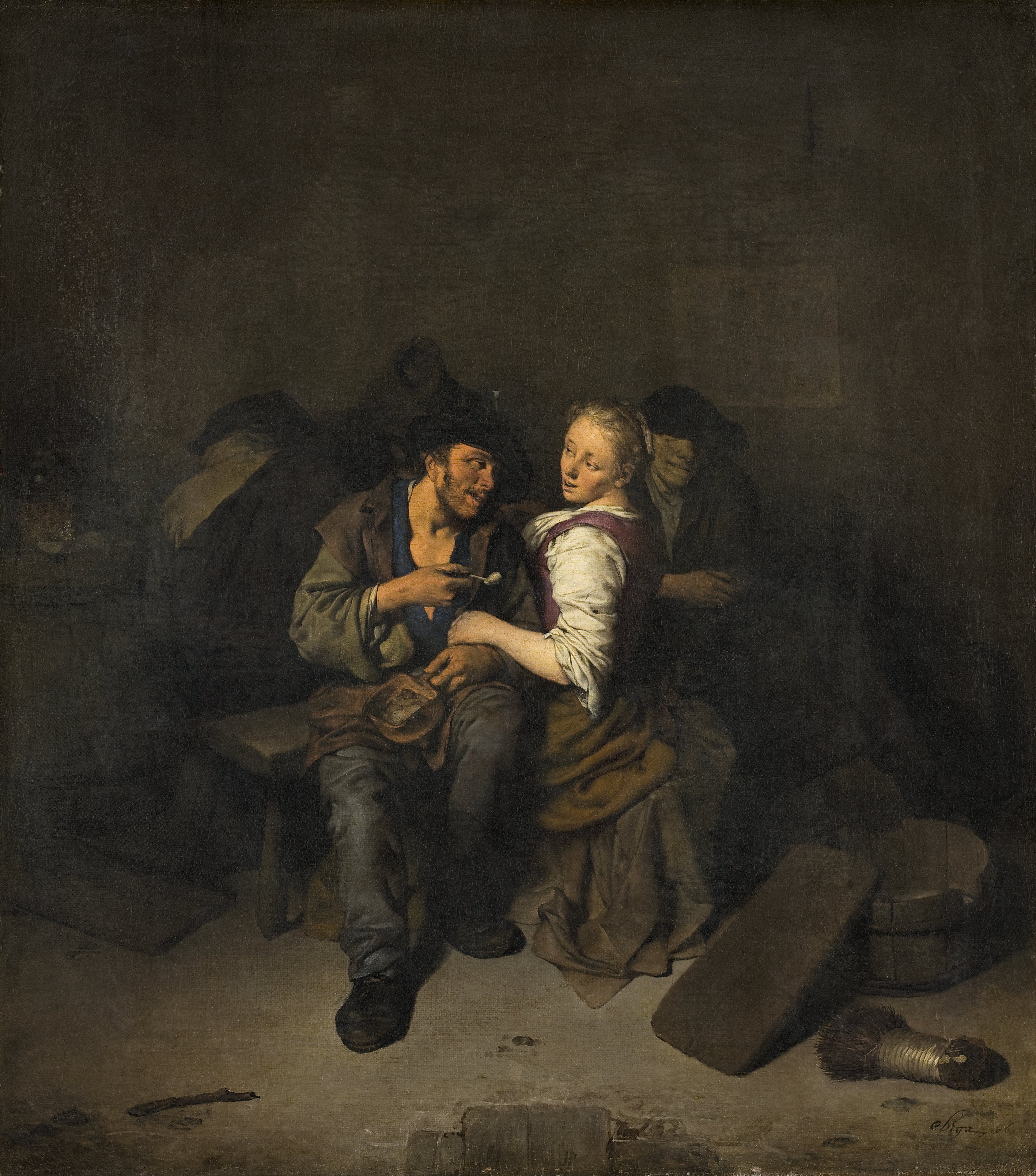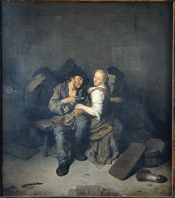 MÅLNING. Värdshusscen med kärlekspar. Cornelis Bega, Holland. Cornelis Pietersz. Bega, född 1631 eller 1632 i Haarlem död 27 augusti 1664, . Bega var huvudsakligen verksam i Haarlem, men besökte även Tyskland och Italien. Han är mest känd för att ha målat krogscener och interiörer med musikanter. Den proveniens till samling de Pret de Rose Calesberg (Muller & C:ie 1902, nr 45) som uppgivits i Hallwylska museets katalog 1930 rör en helt annan målning, nämligen en version av samma tema som såldes i New York hos Park & Bernet 1947. Målningen är graverad i mezzotint av Wallerant Vaillant. En andra version, signerad och daterad 1662 (på trä, 39x34) finns i samlingen på Schloss Ehrenberg, Coburg (Grohn 1961, s. 1961. s. 161). The provenance from the de Pret de Rose de Calesberg collection (Muller & C:ie 1902, no. 45) stated in the 1930 Hallwyl Museum catalogue relates to a completely different painting, namely a version of the same theme sold in New York by Parker & Bernet in 1947. That painting is mezzotint-engraved by Wallerant Valliant. Another version, signed and dated 1662 (on wood, 39x34) is in the Schloss Ehrenberg collection in Coburg (Grohn 1961, p. 161). 2012. Eleganz und Raue Sitten, s.183-184. Staatlische Museen zu Berlin.