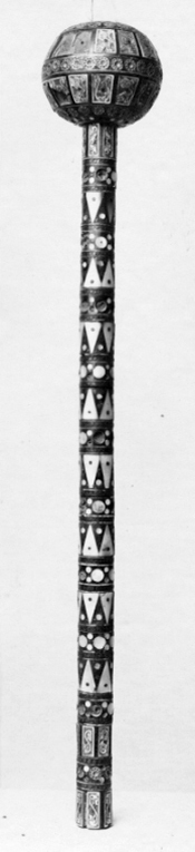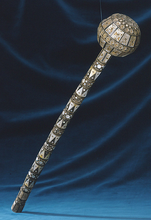 Runt något kantigt slaghuvud av trä, fullständigt täckt av beläggning av horn och pärlemorplattor i horisontella rader runt om. Överst rund platta bortfallen (pärlemorfragment). Tre rader med runda graverade och förgyllda pärlemorplattor och mässingsstift, däremellan två rader med rektangulära, svagt trapetsoida pärlemorplattor med graverade fåglar och vingar med förgylld botten. Överst och nederst små runda pärlemorplattor och mässingsstift. Runt skaft av trä, helt täckt med beläggning av horn och pärlemorplattor. Pärlemorplattorna i rader runt skaftet, omväxlande trekantiga och runda. I bårderna och mellan dem mässingsstift. Överst en rad rektangulära pärlemorplattor med graverade drakar med förgylld botten. Nederst två rader likadana plattor och mellan dem bård i med runda graverade och förgyllda pärlemorplattor.