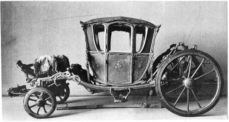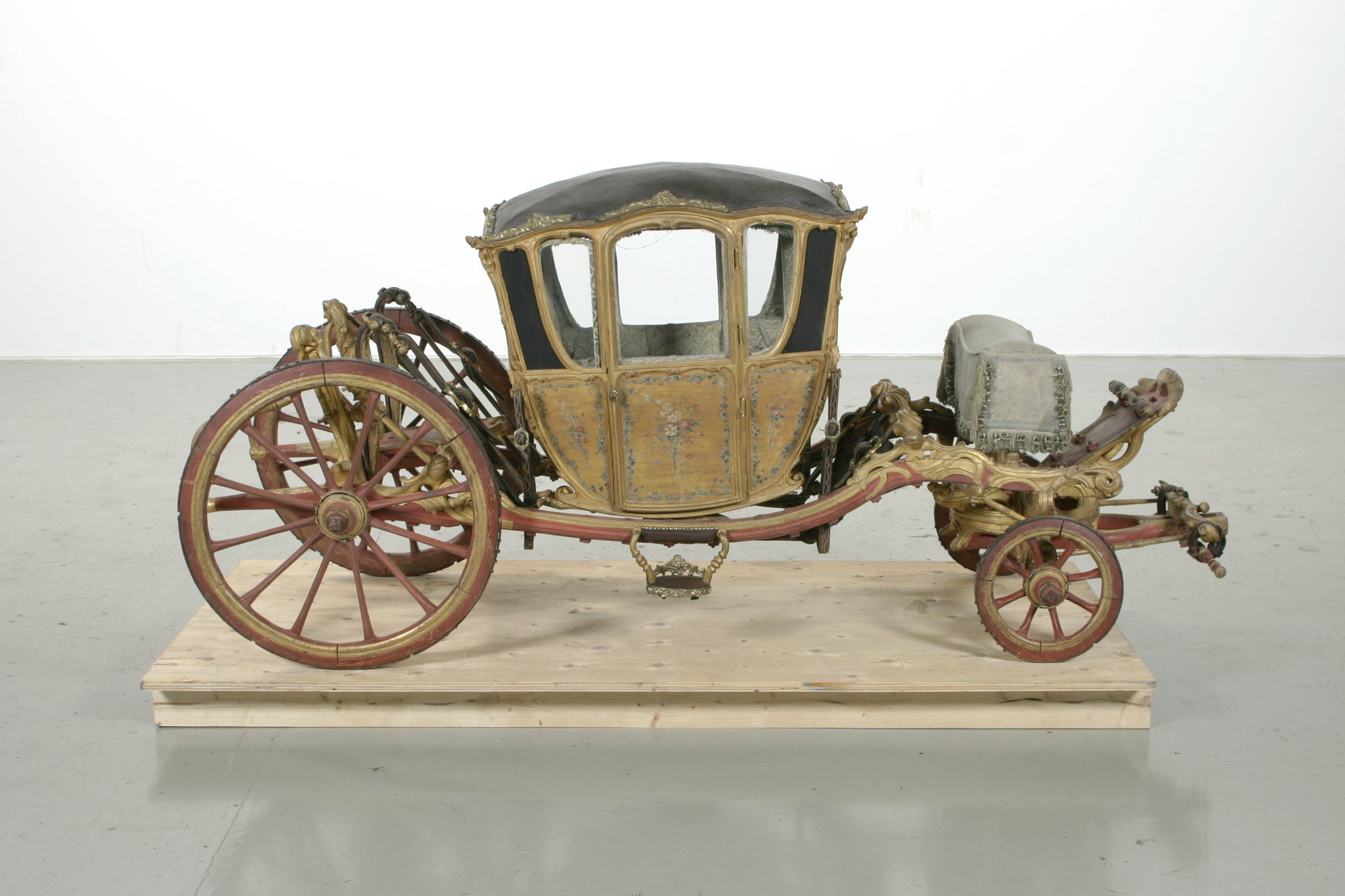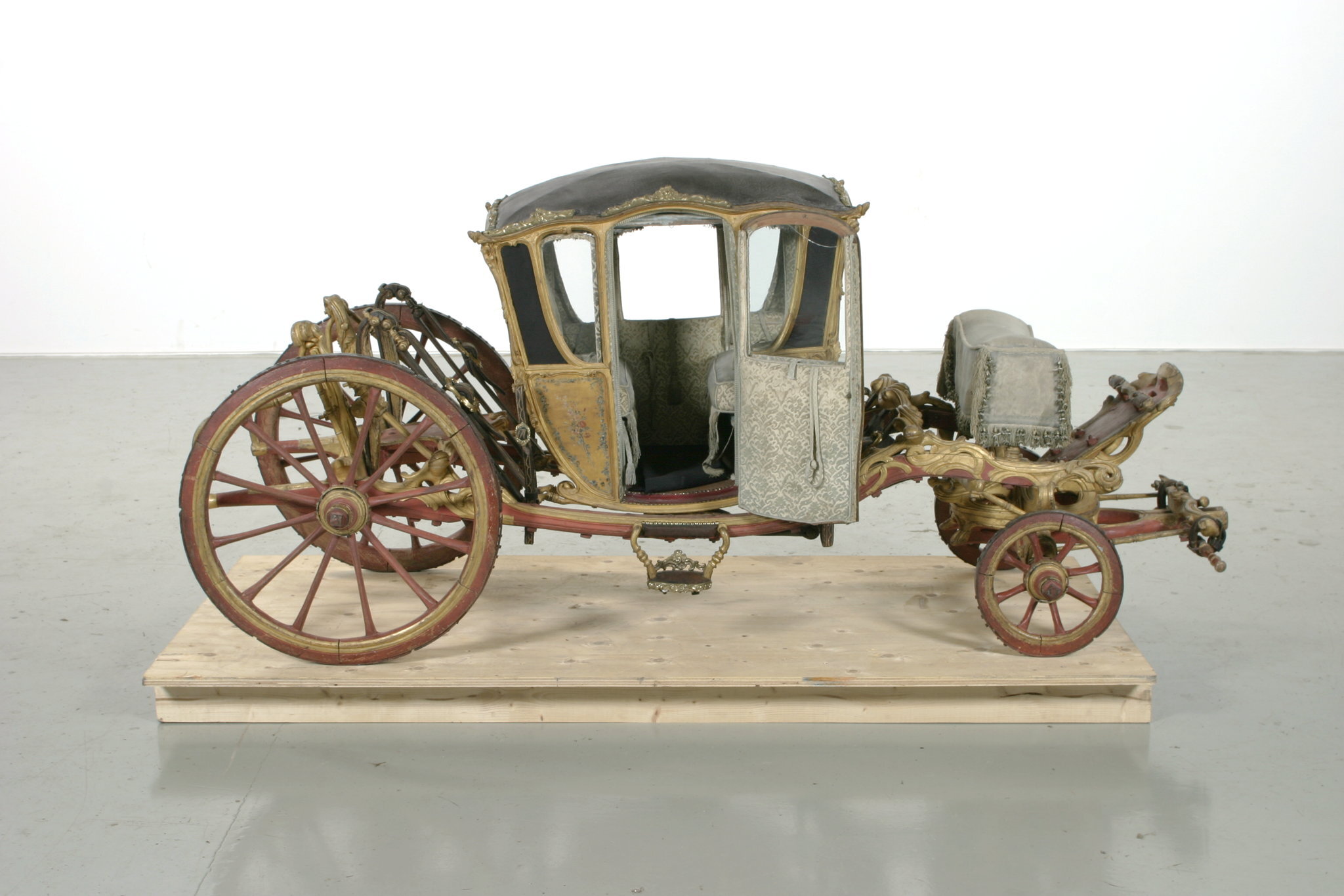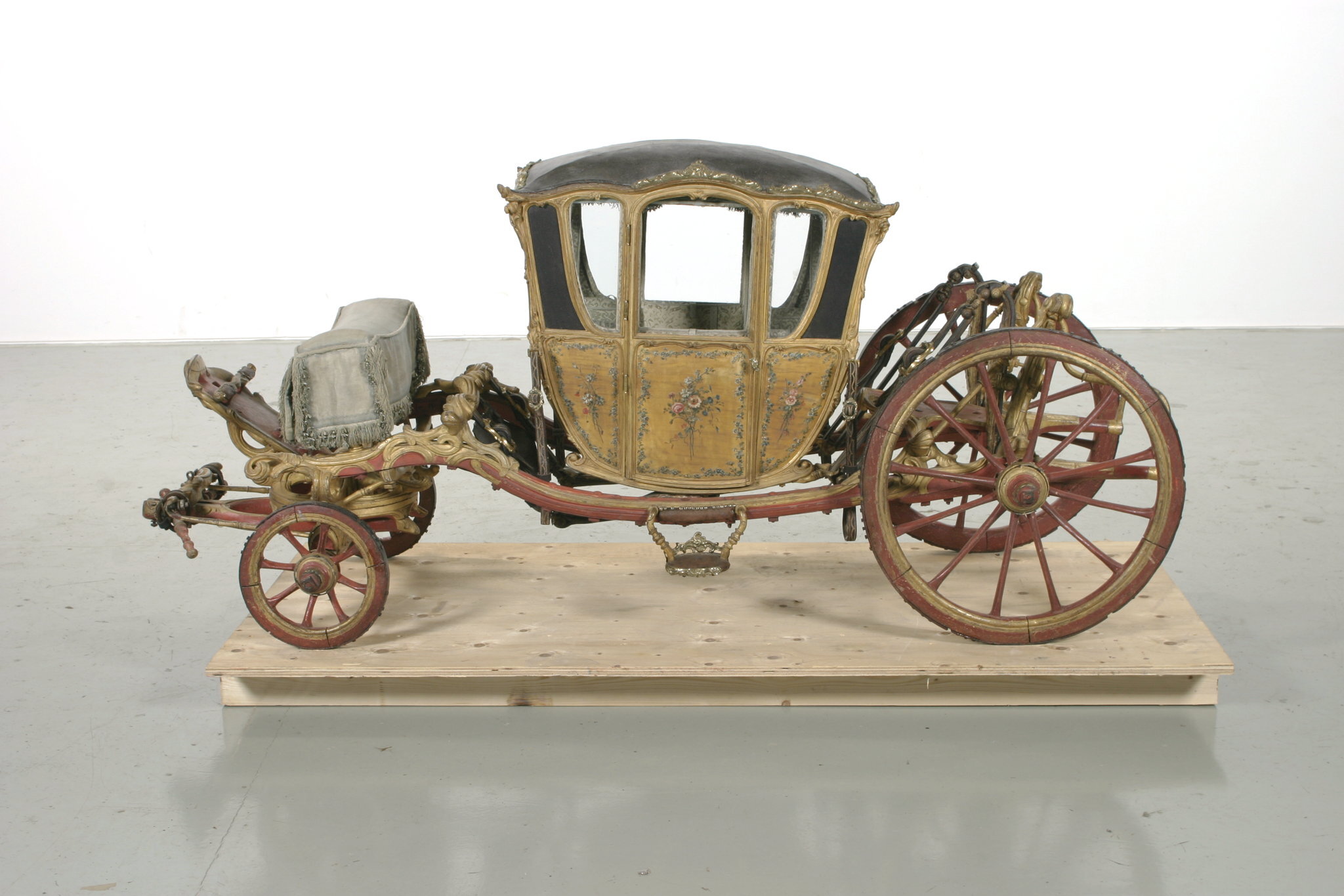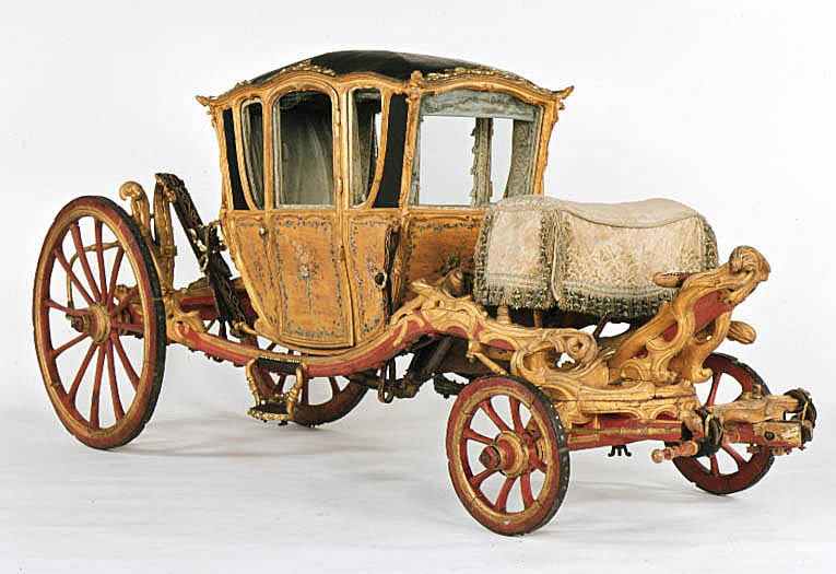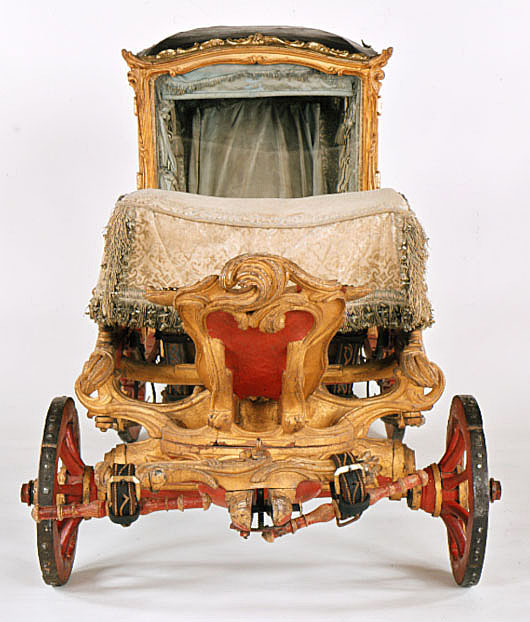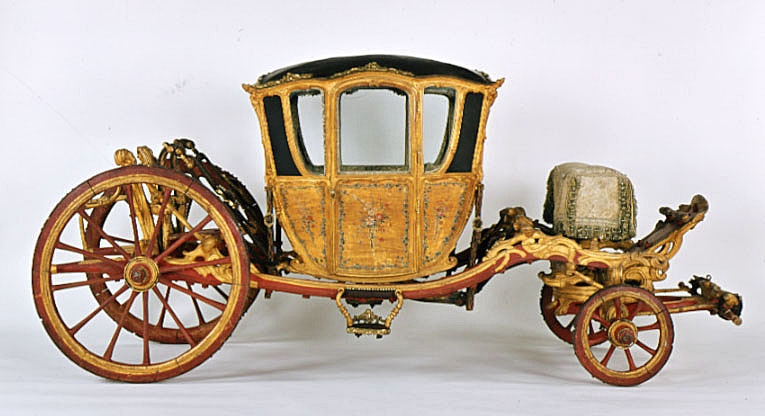 Vagnsmodell, sjuglasvagn, typ berlinare med korgen upphängd mellan brankarderna. Korgen fyrsitsig, tre fönsterglas i vardera långsidan och ett stort glas framtill. Vagnen helt skuren i trä med profileringar och rokokoornament. De mindre sidofönstren avrundade mot hörnet. Lätt välvt tak klätt med läder, runt kanten ornamentlister av förgylld mässing (delar saknas). Bakspegeln och långsidornas små övre väggfält svartmålade. Ramverk och fyllningar förgyllda. På fyllningarna målade blomsterbuketter och runt kanten blomsterrankor. Dörrvred av förgylld mässing. Invändigt klädsel av mönstrad oskuren silkessammet. Kring takkanten klädd rundstav och 4 cm hög silkesfrans. Rullgardiner för fönstren av blått siden och sidengardin vid bakväggen. Fönsterband och handtag av snörmakeriarbete. Fotbottnen läderklädd med mässingstennlickor runt kanten. Skulpterat underrede i rött och guld med två brankarder, fyra stålskodda hjul, bakaxel med lakejbräda och S-fjädrar, á la Dalemfjädring, vid vilka hängremmarna av läder med vita stickningar och förgyllda söljor är fästade. Framtill hänger korgen i remmar från tvärträdet fästade vid fjädrar under korgen. remmarna är av läder med vita stickningar och förg. mässingssöljor. Framaxel med vändkrans, kuskbock med stoppad läderdyna, fotbräda med förhöjt fotstöd. Bakom kuskbocken ett tvärträd med stänkskydd. Framtill fast förvåg och två svänglar med svängelremmar. På bankarderna mitt för dörrarna läderskoning fäst med mässingstennlickor och fotsteg av förgylld stål och mässingsornament. Själva steget klätt med läder.