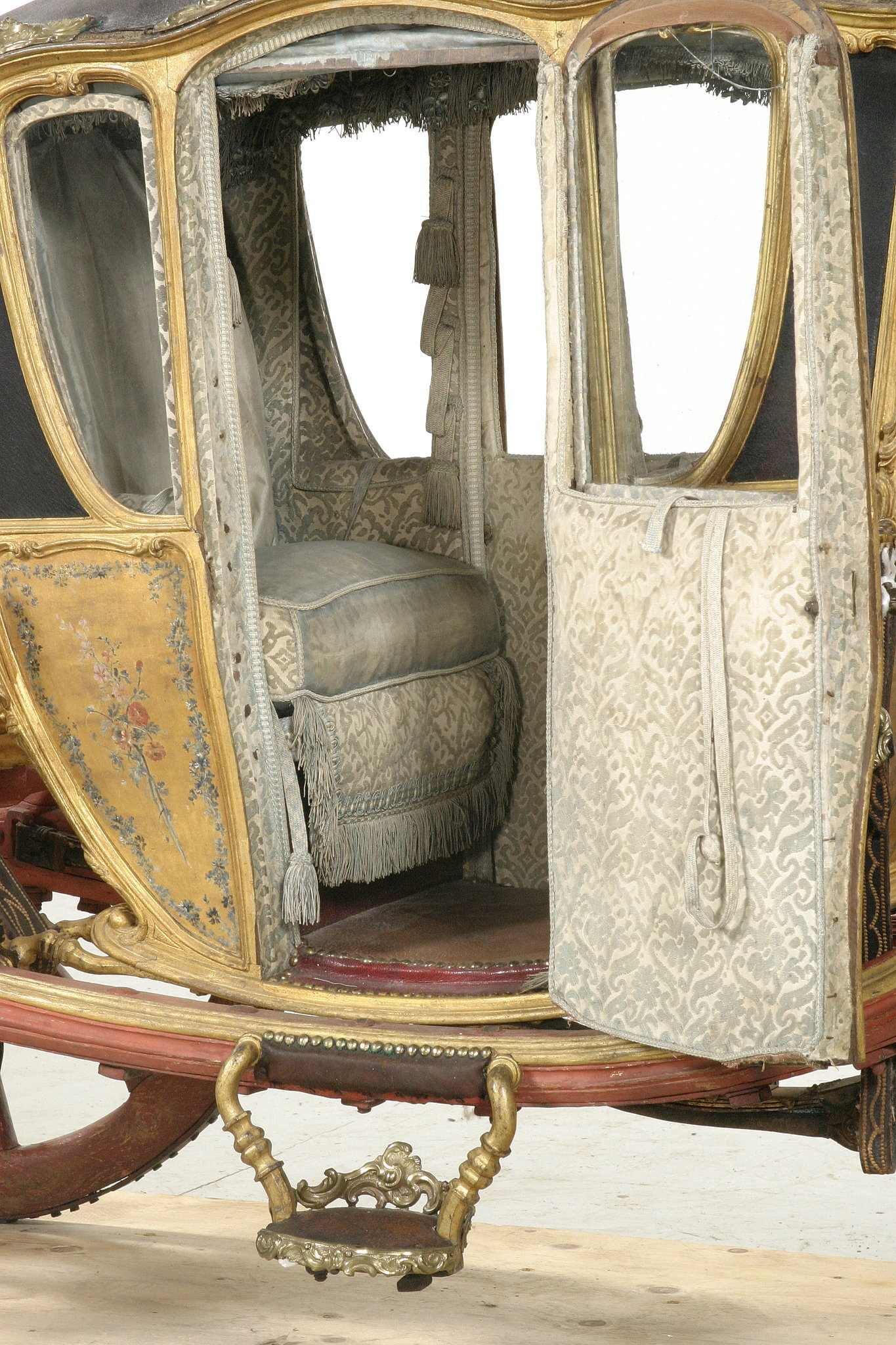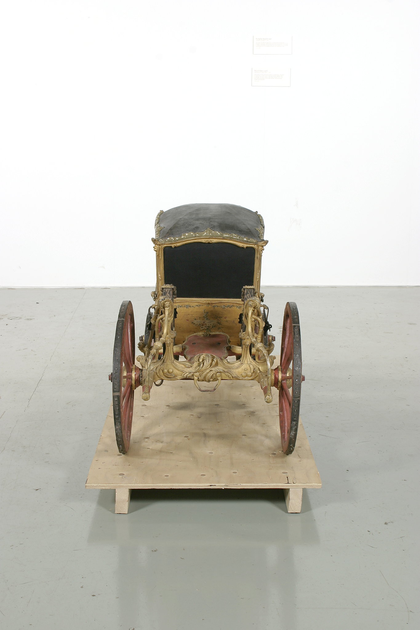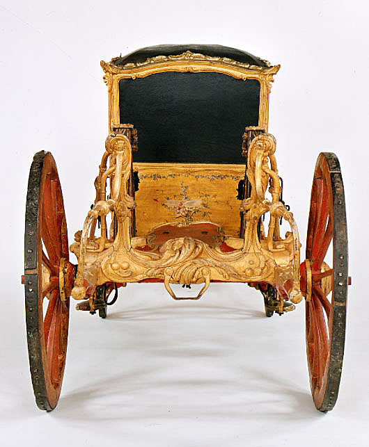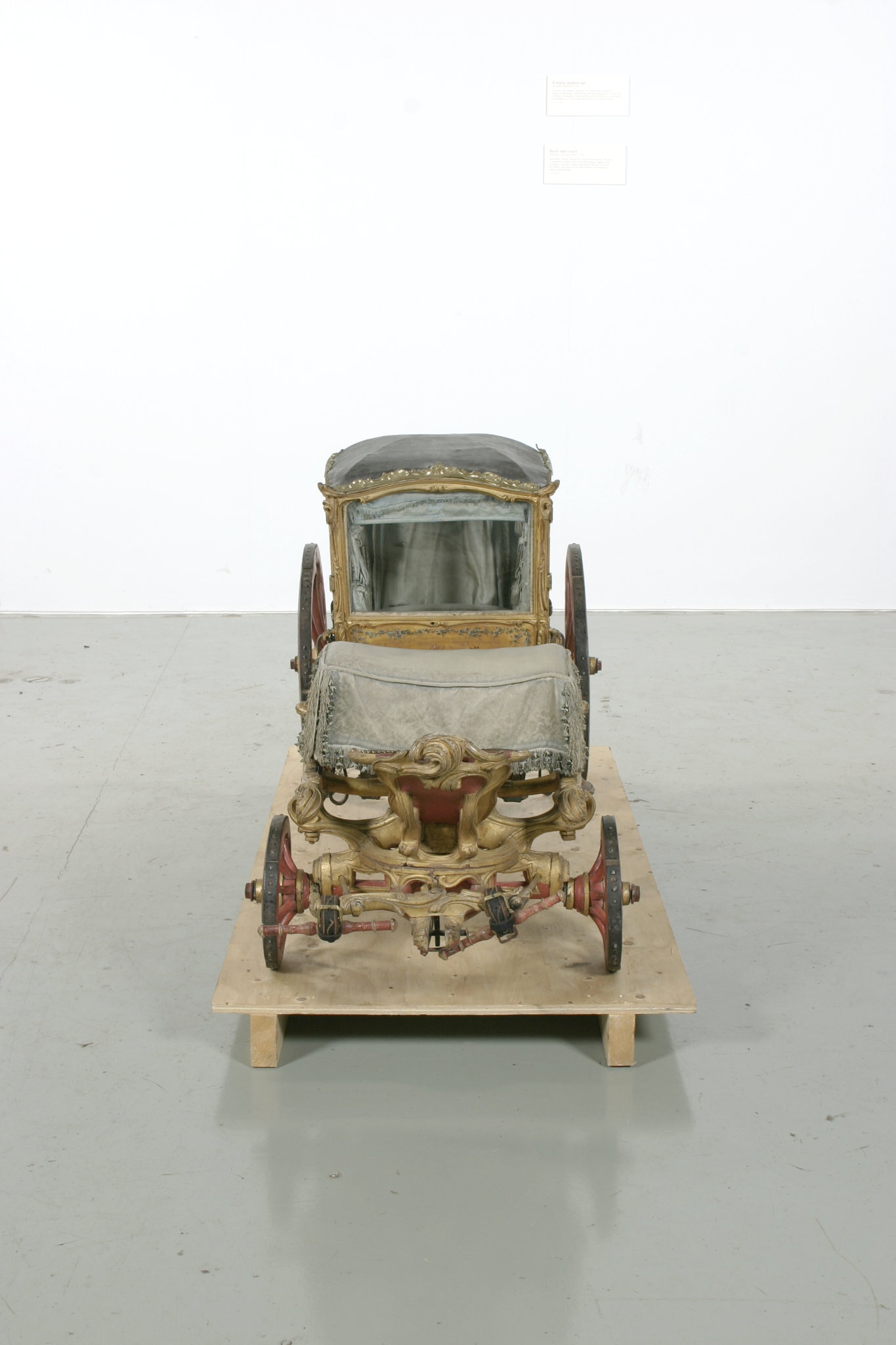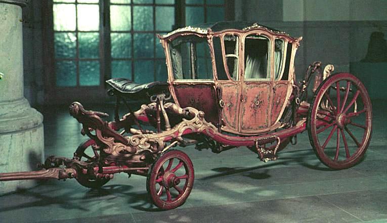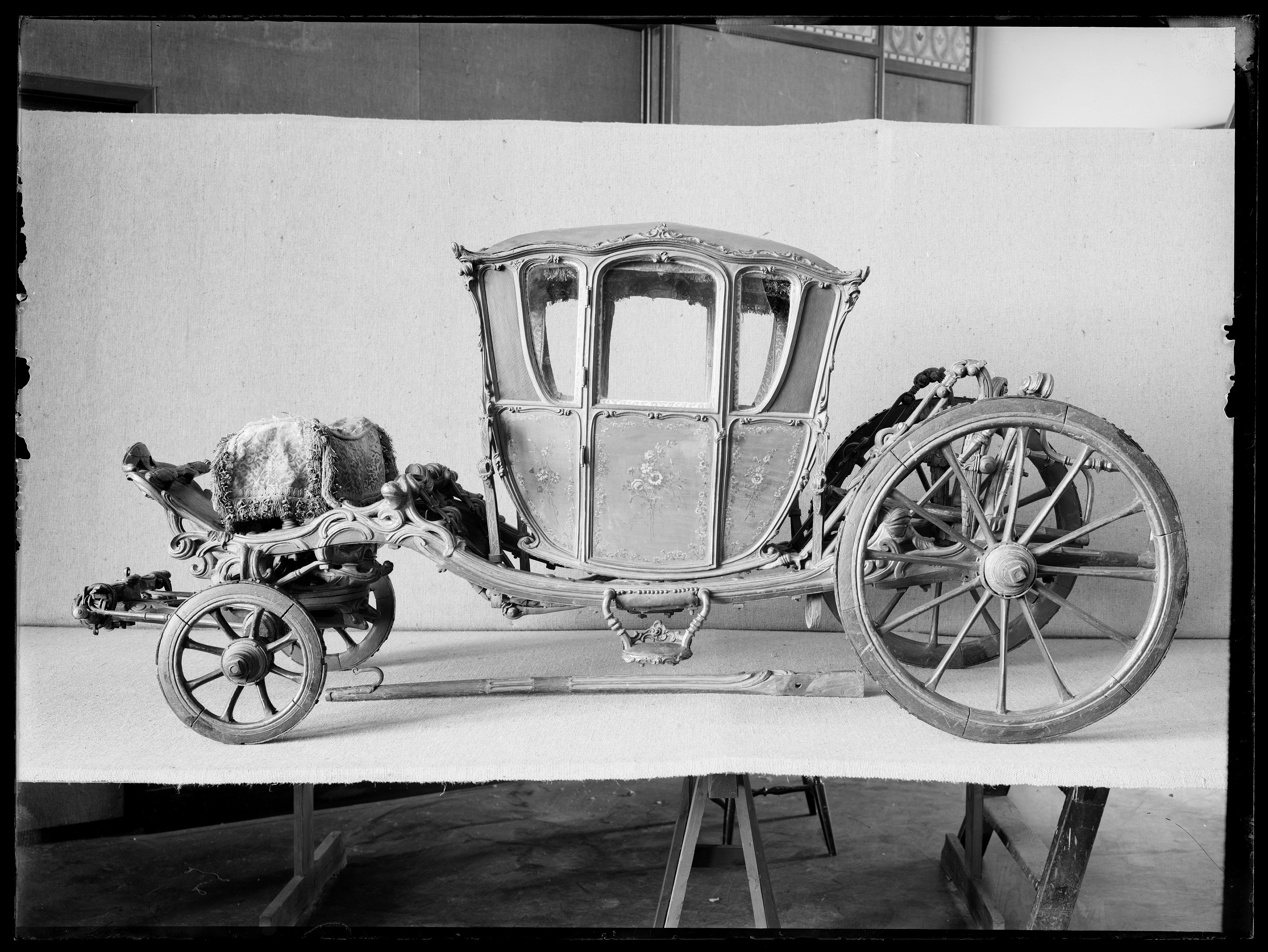 Vagnsmodell, sjuglasvagn, typ berlinare med korgen upphängd mellan brankarderna. Korgen fyrsitsig, tre fönsterglas i vardera långsidan och ett stort glas framtill. Vagnen helt skuren i trä med profileringar och rokokoornament. De mindre sidofönstren avrundade mot hörnet. Lätt välvt tak klätt med läder, runt kanten ornamentlister av förgylld mässing (delar saknas). Bakspegeln och långsidornas små övre väggfält svartmålade. Ramverk och fyllningar förgyllda. På fyllningarna målade blomsterbuketter och runt kanten blomsterrankor. Dörrvred av förgylld mässing. Invändigt klädsel av mönstrad oskuren silkessammet. Kring takkanten klädd rundstav och 4 cm hög silkesfrans. Rullgardiner för fönstren av blått siden och sidengardin vid bakväggen. Fönsterband och handtag av snörmakeriarbete. Fotbottnen läderklädd med mässingstennlickor runt kanten. Skulpterat underrede i rött och guld med två brankarder, fyra stålskodda hjul, bakaxel med lakejbräda och S-fjädrar, á la Dalemfjädring, vid vilka hängremmarna av läder med vita stickningar och förgyllda söljor är fästade. Framtill hänger korgen i remmar från tvärträdet fästade vid fjädrar under korgen. remmarna är av läder med vita stickningar och förg. mässingssöljor. Framaxel med vändkrans, kuskbock med stoppad läderdyna, fotbräda med förhöjt fotstöd. Bakom kuskbocken ett tvärträd med stänkskydd. Framtill fast förvåg och två svänglar med svängelremmar. På bankarderna mitt för dörrarna läderskoning fäst med mässingstennlickor och fotsteg av förgylld stål och mässingsornament. Själva steget klätt med läder.