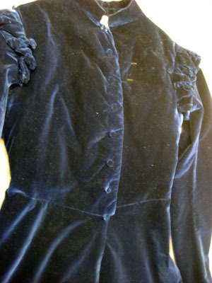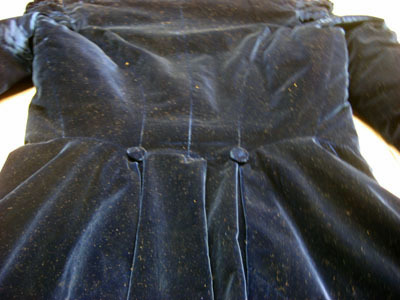 Jacka, i samma modell som ordensdräkterna vid tiden, av mellanblå silkessammet med knäppning mitt fram, långa ärmar och axelkarmar samt med en 40 mm hög ståndkrage. Jackan är sydd av åtta stycken, två fram- och två bakstycken samt två större skörtkappor och två smala ryggstycken. Livet är svagt rundat över bröstet med vadderade framstycken. Jackan knäpps mitt fram på livet med en rad av åtta överklädda knappar, diam 15 mm med motsvarande knapphål på vänster framstycke. Knäppningen sitter på en utskjutande knappslå. Skörten har en rak framkant. Vidden ökar med triangulära stycken baktill. Ett 420 mm högt sprund mitt bak. Skörten är veckad bak. Två djupa ficksprund med ficksäckar av vit bomull. Två större klädda knappar, diam 60 mm, sitter mitt bak vid midjan. Långa smala ärmar av två stycken med rundade ärmuppslag, 65 mm breda. Över axelsömmarna vadderade uppskurna axelkarmar med fem insydda puffar. På vänster framstycke intill axelkarmen en liten klädd knapp, diam 13 mm. På höger framstycke en klädd knapp, diam 13 mm. På ryggstycket en svart träns 30 mm från ryggsömmen och 93 mm nedanför kragsömmen. Knapparna och tränsen är för fäste av manteln. Fodrad i liv och ärmar med vit taft och i skörten med blå taft. Kragen fodrad med blå taft. Oscar I kröntes i Stockholm den 28 september 1844. Traditionen att bära vit eller silverskimrande dräkt bröts då Oscar I istället valde att bära en blå sammetsdräkt. Axelkarmarna är ett lån från gustaviansk teaterdräkt som i sin tur är ett lån från Gustav-Adolftidens dräkter. Oscar I ville därmed befästa och legitimera den unga dynastiens förbindelse med det gamla kungahuset. Räkenskaper talar om uppgifter som skräddarens namn, sannolikt Kaeding & Schultze samt leverantör av silkessamet, handelsman Mendelson.