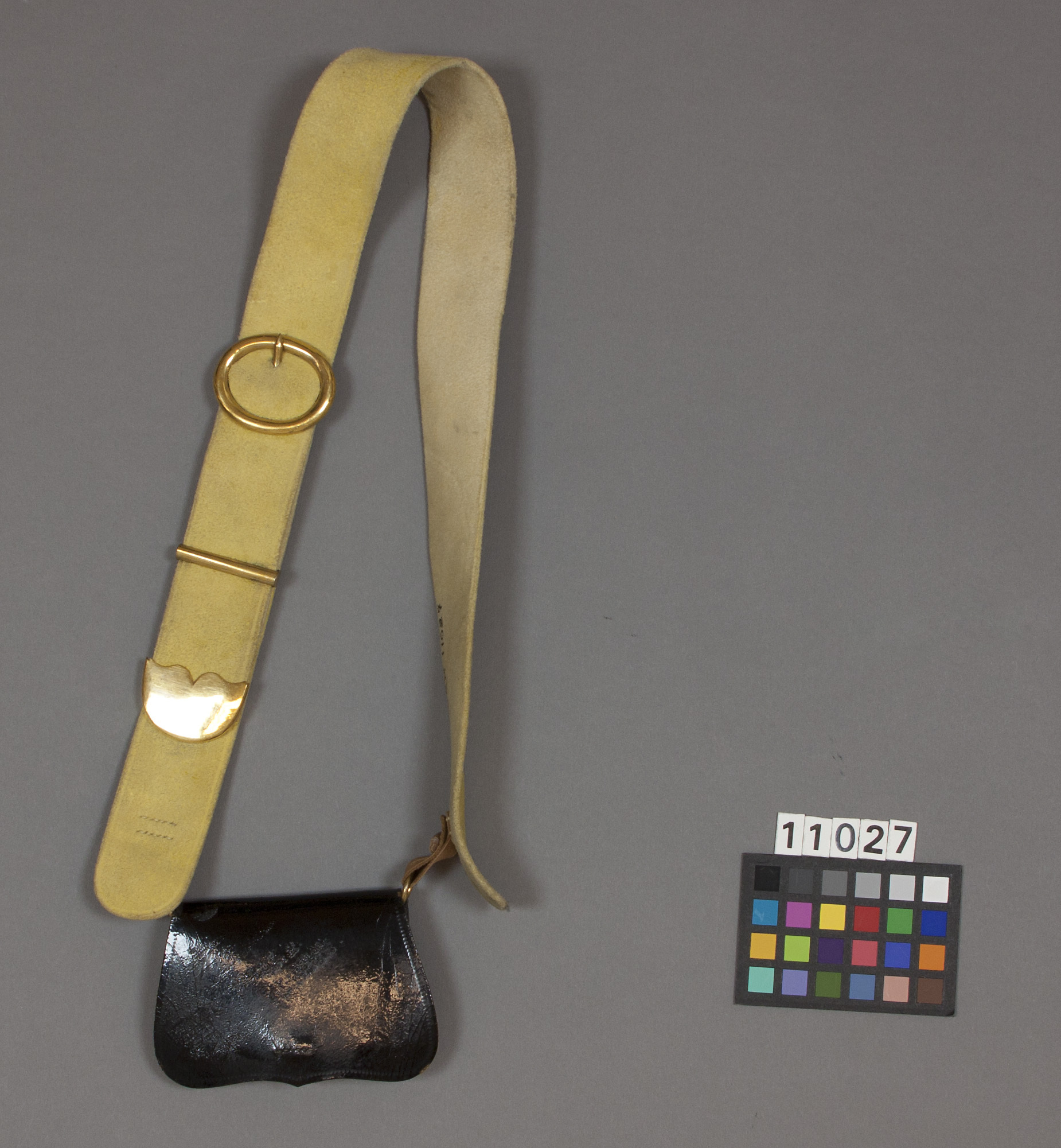 Kartuschlåda med stomme av tunt stål överklädd med svartlackat skinn med kulformig mässingsknopp på undersidan. På lockets insida stopp för låsning. Vid sidorna stora mässingsringar, vid vilka remmen är fästad medelst ...? ljusbruna läderstroppar. Rem av gult sämskat skinn 32 mm bred med rundade ändar. Låses med oval sölja, hälla och konturerat ändbeslag, alla av förgylld slät mässing.