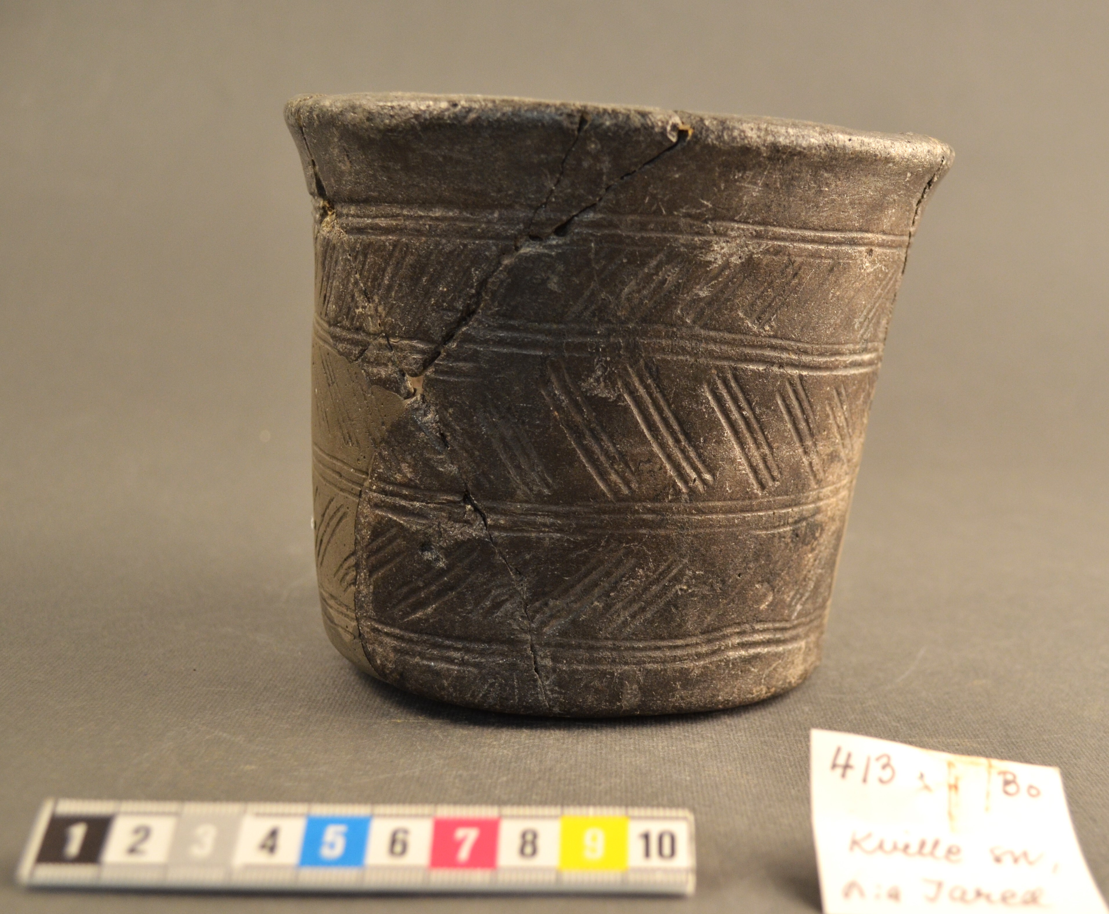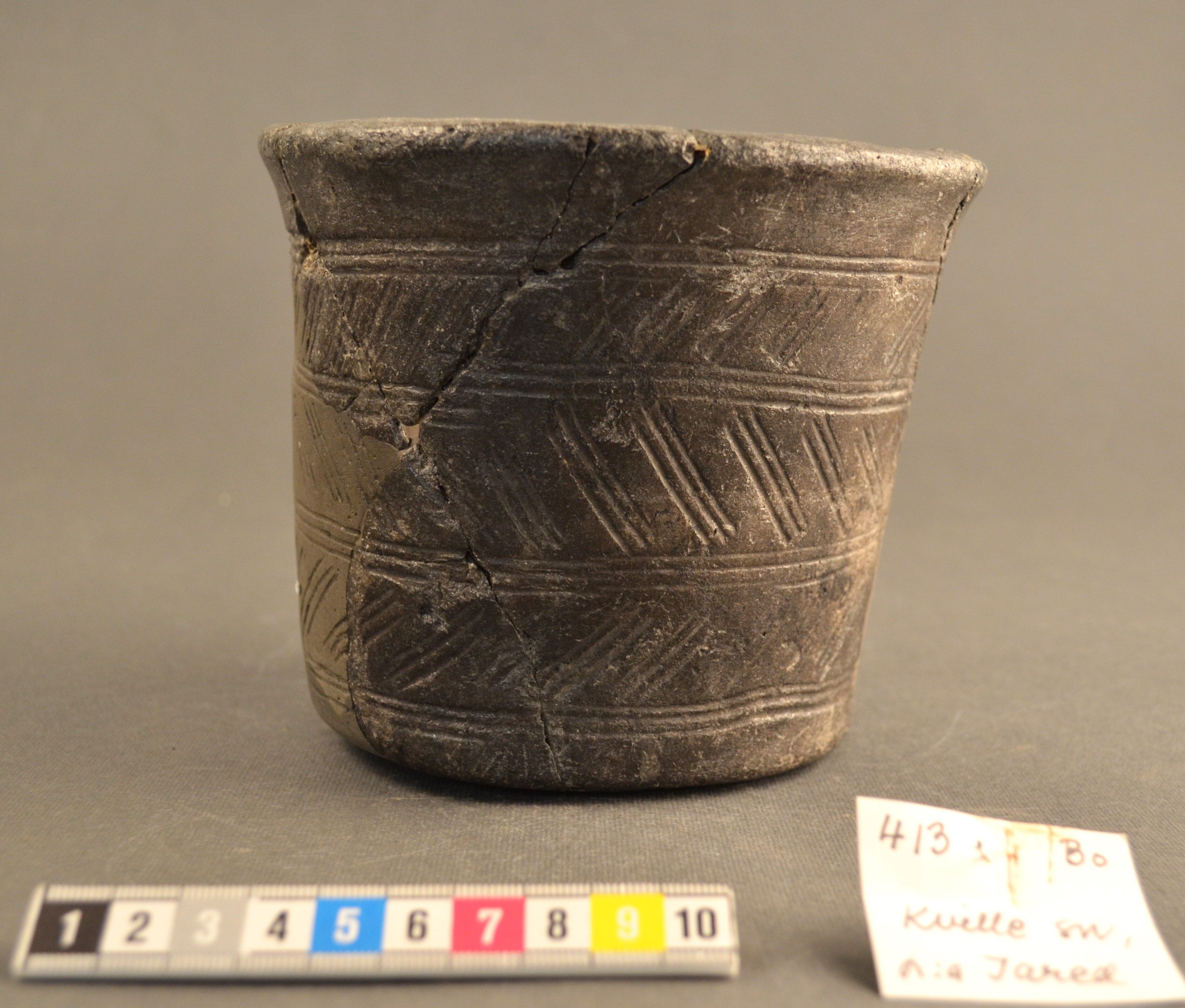Kärl med ristad dekor av horisontella band med snedstreck. Asbest eller täljstensmagrat?. 15,2 cm mynningsdiameter, 12,3 cm h och 11,1 cm bottendiameter