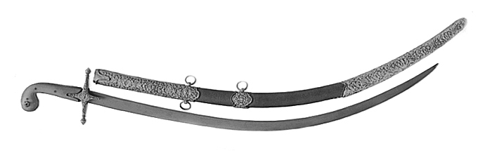 SABEL med fäste av horn samt balja. Klinga: Med imiterad damaskering, stark böjd, eneggad med knivsbak, jämnt avsmalnande mot udden med plana sidor och långspetsig udd, avspetsad från eggen. Fäste: Parerstång av silver, förgylld, rak, fyrsidig, avsmalnande åt ändarna med svagt rundade sidor och plana över- och undersidor, ändarna avslutade i knoppar. Från mitten utgår uppåt och nedåt vid vardera sidan en kort stolpe. På sidor och stolpar rankornering i relief, i korspunkten en blomma. På över- och undersidan graverad ornering, på den förra en bladfläta, på den senare ett rutmönster. Vardera knoppen med ett band mellan två mot varandra vända bladrosetter i relief. Kavel av två på en grov, tjock tunga lagda grågula hornskivor med rundad utsida samt fästa med fyra genomgående nitar av järn. Överändan böjd framåt i tvär vinkel i form av en stor knopp, tvärs igenom denna ett runt hål med ändbeslag av en pålagd rosett av förgyllt silver. Tungarns ytterkant belagd med en tunn plåt av silver, varpå i relief en rad av sexflikade blommor och treflikade blad. Balja av trä, klädd med pressat svart skinn samt med drivna och ciselerade beslag av förgyllt silver. Munbleck långt, med blomornering. Släpsko i samma form och dekor som munblecket. Vikt 0,300 kg; L 82 cm; B 3,3 cm; Munbleck L 23 cm; Släpsko L 32,5 cm.