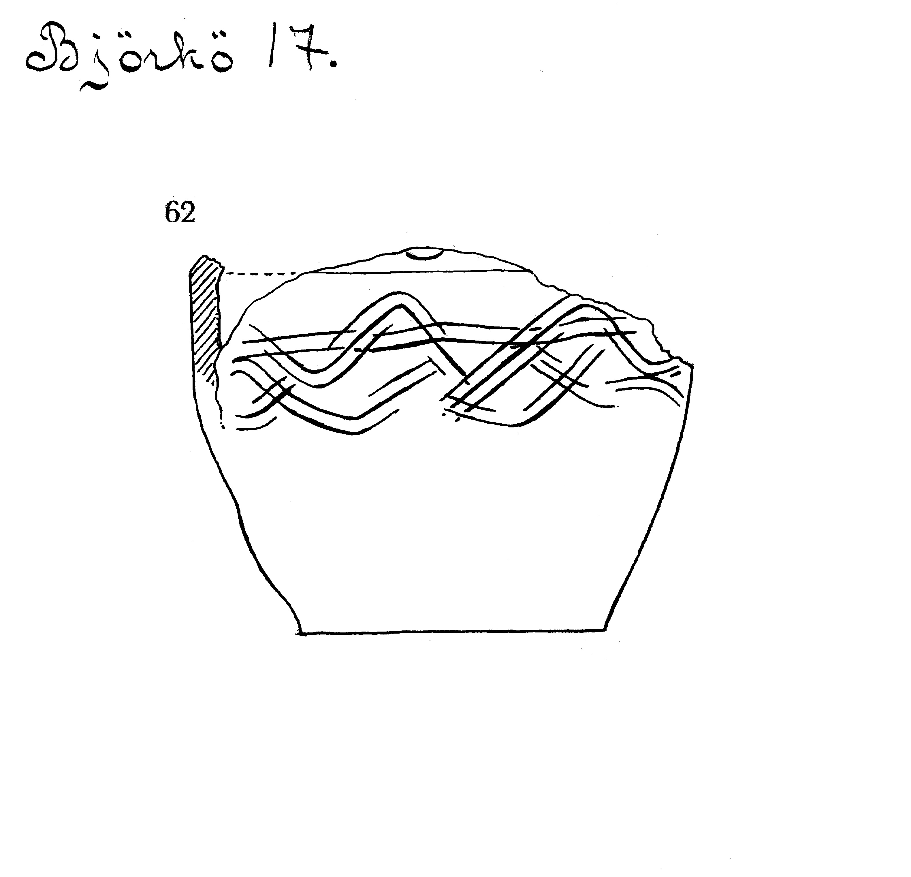 Kärl av dåligt bränd gods, utvändigt, gult, massan svart. Kanten ej kvar. Ornerad med grovt inskurna linier. C:a 13 ihoplimmade fragment.