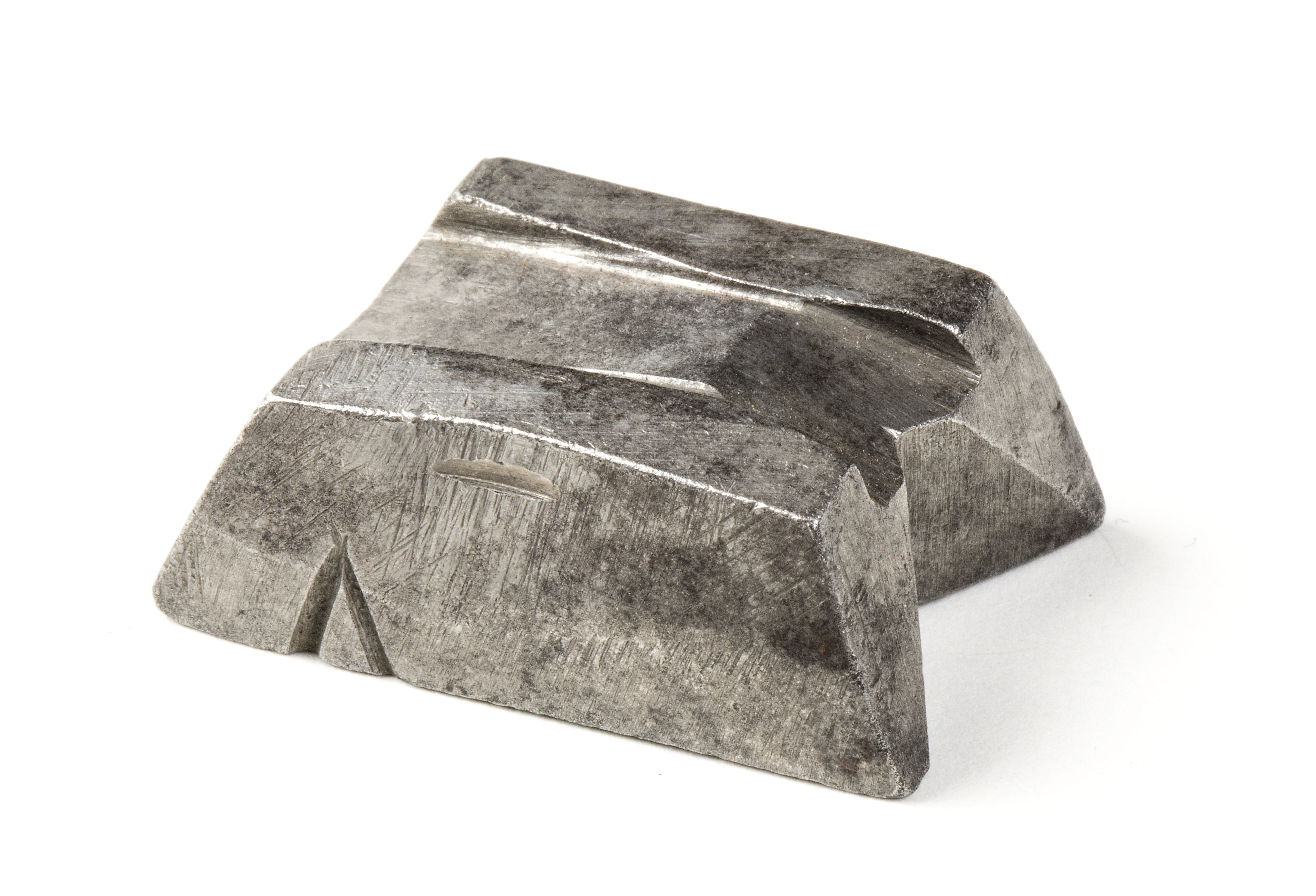 Profileringsstål, bråde, till en maskin för dragning av blylister till fönster. Prismaform. V-formigt urtag i ena änden, bågformigt i den andra. Undersidan är märkt med en punkt och ena långsidan med V. På ovansidan prismaformigt urtag från båda kortsidan mot en ås- - år.Ett spår på var sida av profilen.