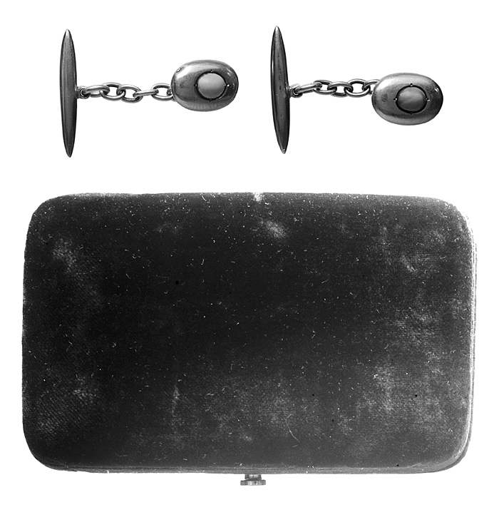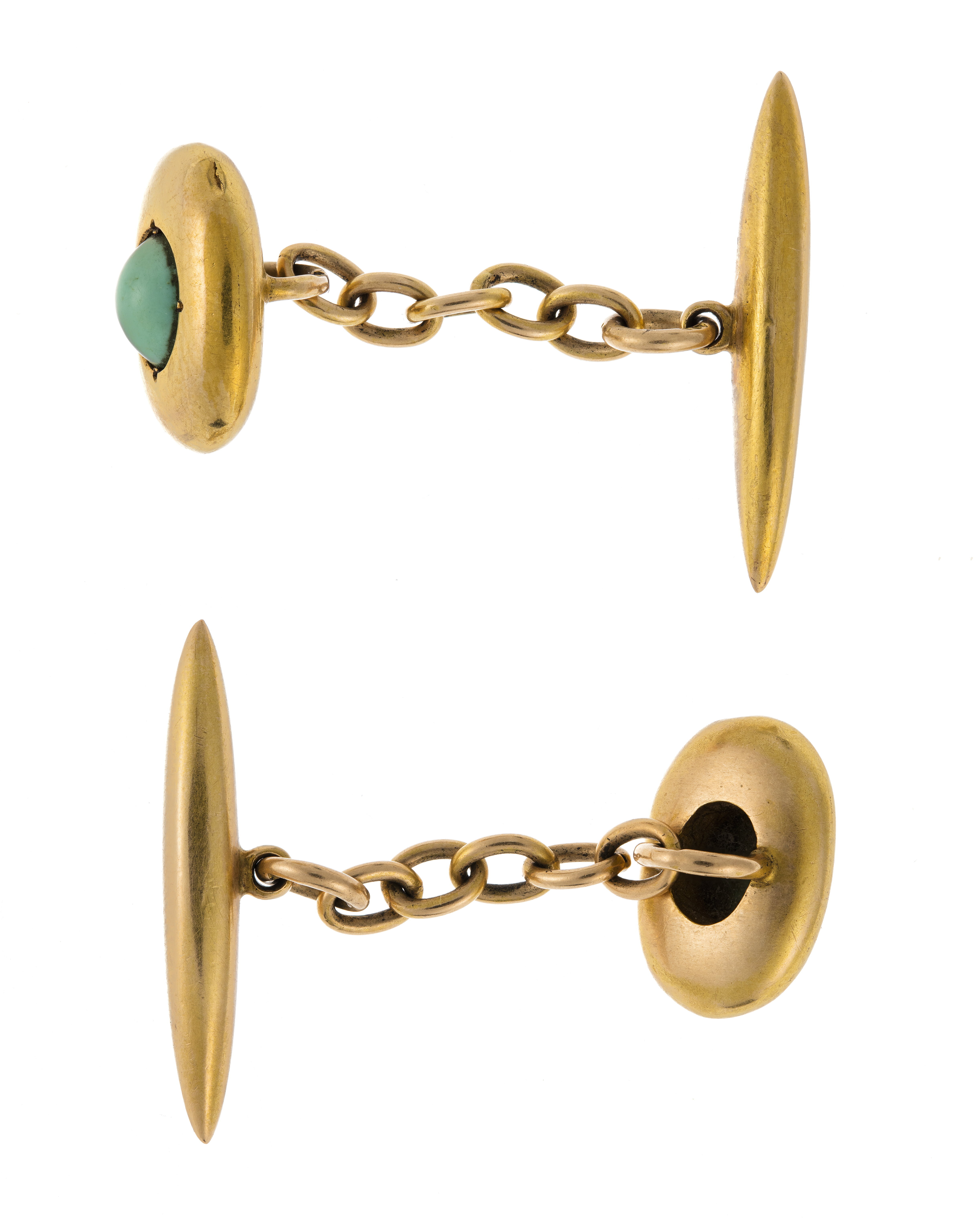 MANSCHETTKNAPPAR (länk-), ett par, med etui Av guld med fläckiga gröna turkoser. Vardera bestående av två delar; ena delen oval, med konvexa sidor och rundad ytterkant, på utsidan en infälld oval rundslipad (en cabochon) turkos, på insidan ett ovalt hål, över detta en rundstavig ögla; andra delen spolformig, slät, på insidan en ögla, vari en rörlig ring. Mellan delarna en kort kedja med ovala rundstaviga länkar. På båda knapparna på ögla och ring en stämpel. Vikt: 3,7 g/st. Ena delen L: 1,4 B: 1 cm. Andra delen L: 2,4 B: 0,5 cm. Från 1800-talets slut. Etui (original): Av trä, rektangulärt, med platt fällock med fasade kanter samt helt och hållet klätt med mörkt brunröd silkessammet; foder av svart silkessammet och vitt siden (atlas). På framsidan tryckknäppe av vitkokad mässing. H 3,2 L 8 B 5 cm. Gåva till Walther von Hallwyl, julaftonen 1900, från hans maka Wilhelmina vid hans vistelse i Kairo 1900. Inköpta av Wilhelmina von Hallwyl december 1900 hos juveleraren J. Lattes i Kairo.