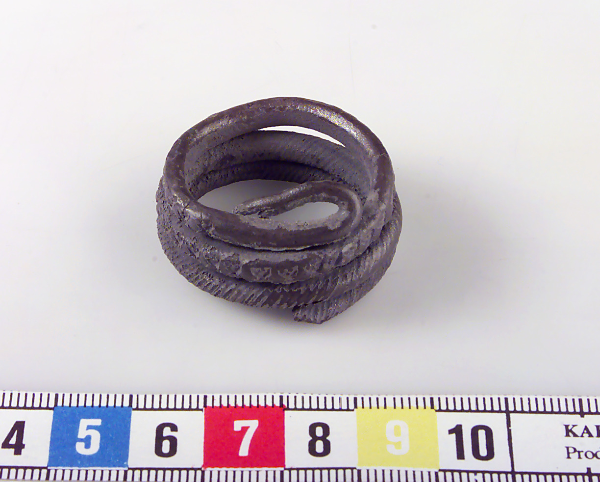 Rundad ten rullad i tre varv. Ena änden tillbakaböjd till ögla, den andra avbruten. Spiralornerad samt stämpelornerad med motställda trianglar.