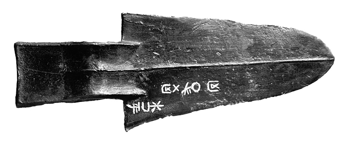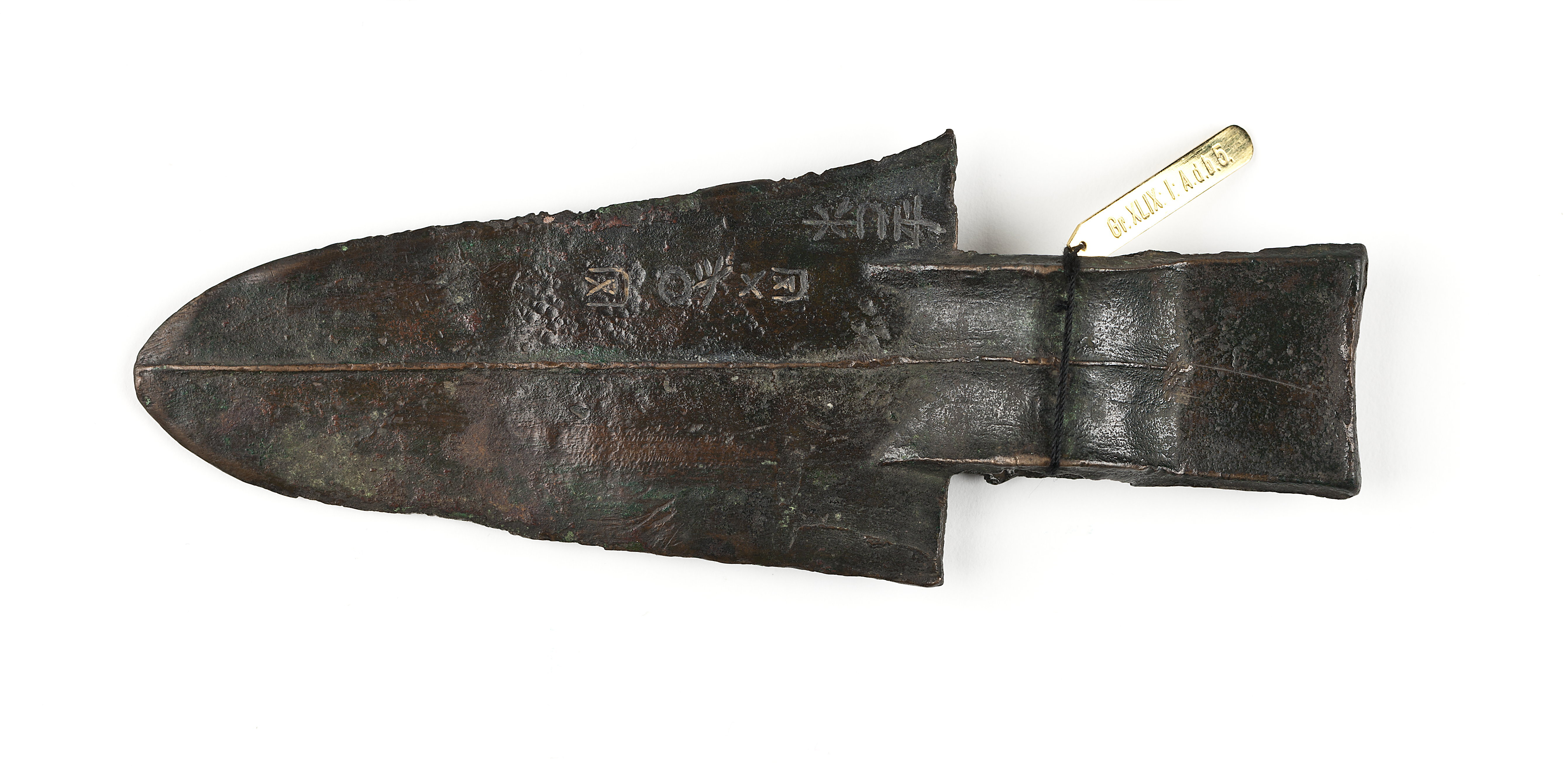 TILLÄGG: Dolkyxa (ge) daterad till Shang dynastin (c. 1700-1050 f.v.t.). Fyndplats Shandong provinsen. Bladet har försetts med en inskription, som sannolikt tillkommit efter att föremålets grävts upp. I Östasiatiska museets samlingar finns en dolkyxa av ge-typ i jade med dekor typisk för Jinxu-fasen av Shang dynastin.