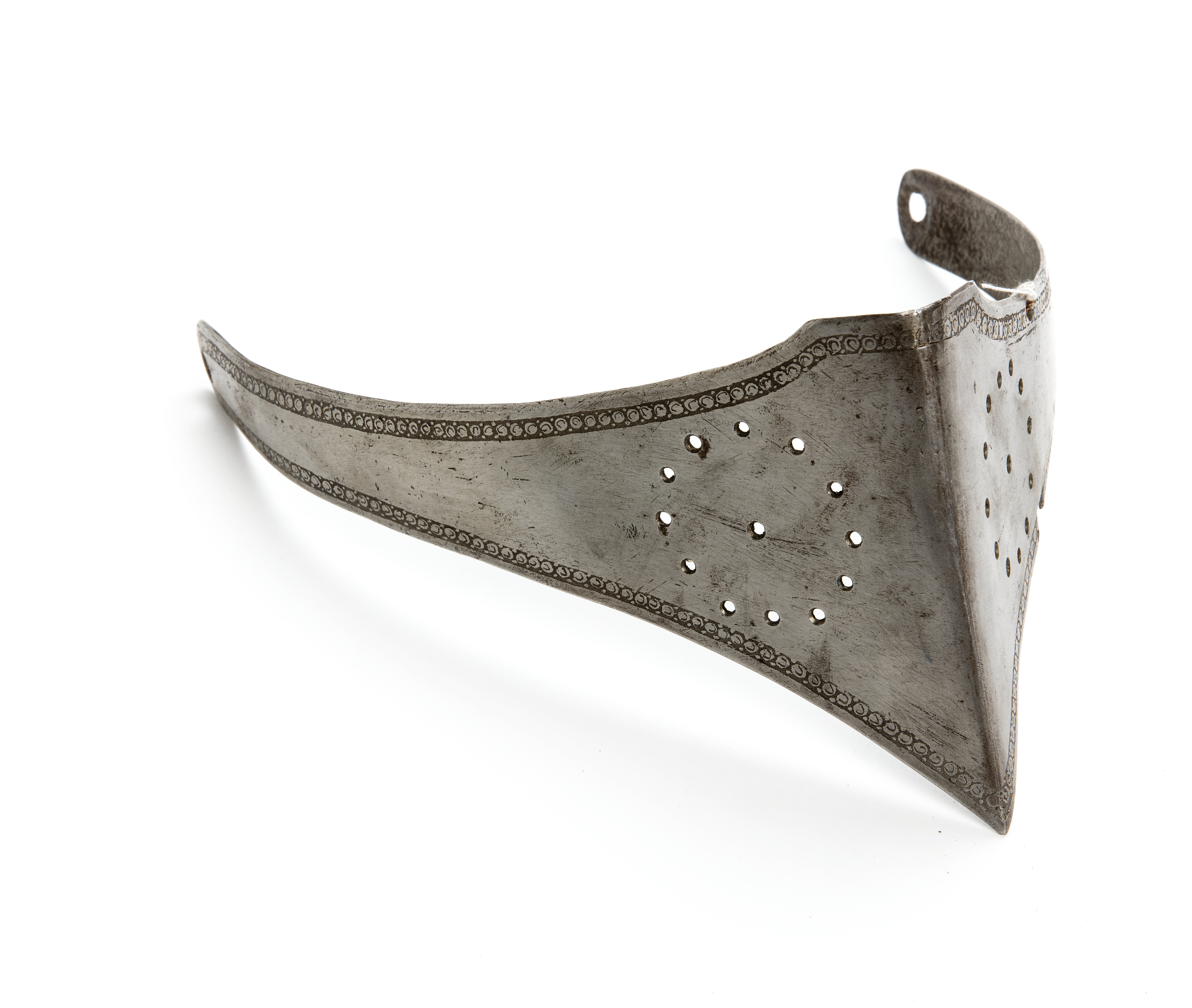 Visir i ett stycke av etsat stål. Längs med ytterkanterna etsad pärlstavs dekor. Markant mittås med på ömse sidor 13 slagna ventilations form i cirkelform. På höger sida urtag för pannklaffens låsning. I nederkant slaget hål för låsning i höger kindstycke. På ömse sidor hål för visirnitar. Insidan ytbearbetning indikerar att delen är en sentida komplettering från 1800-talet. Passar väl med hjälm inv. nr. 22977_lrk