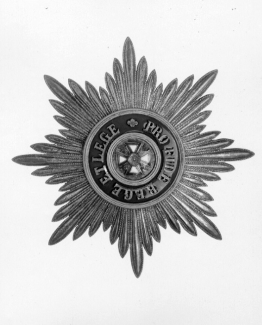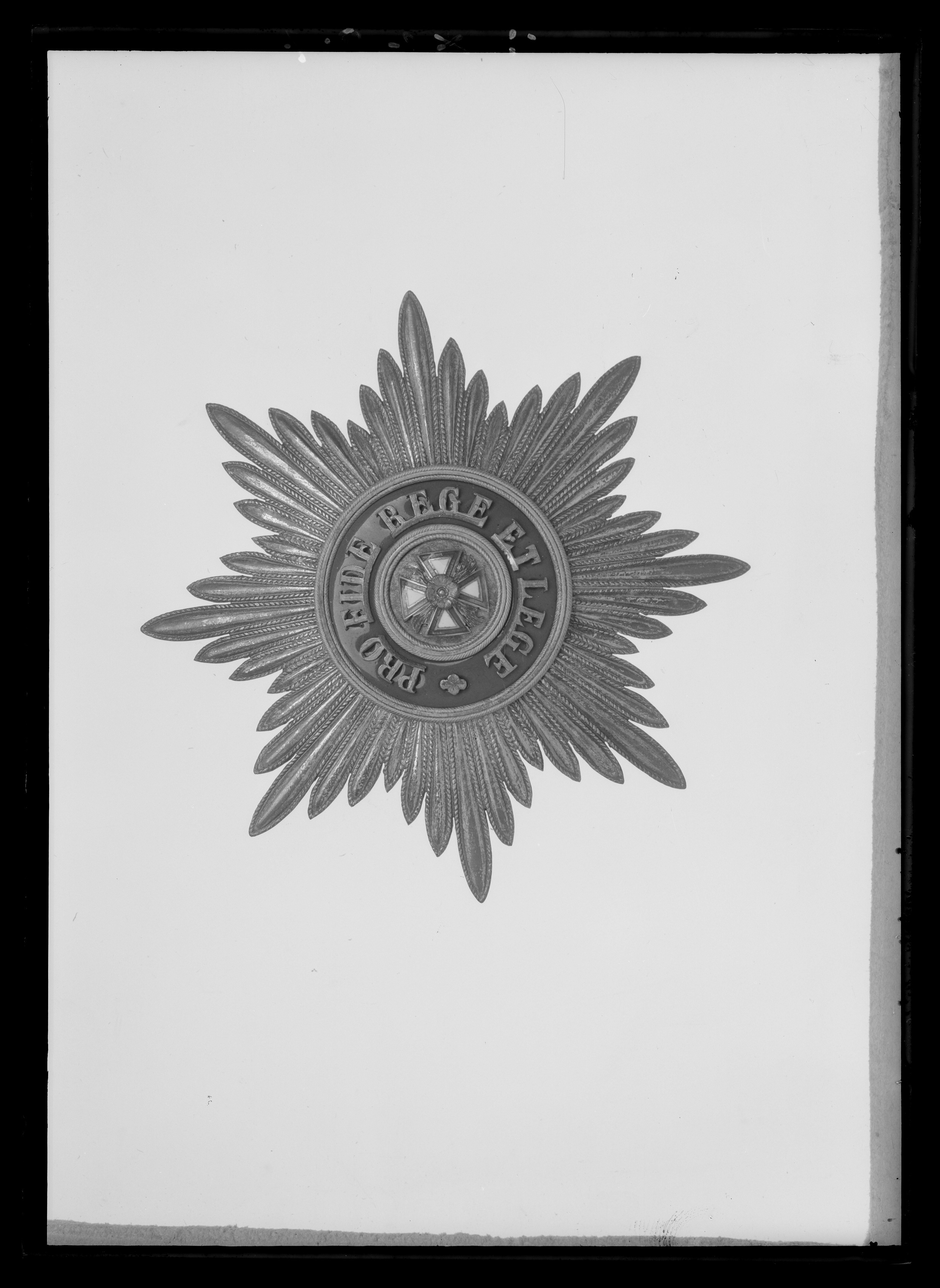 Åttauddig strålstjärna av förgyllt silver, sammansatt av 48 bladformiga strålar med repstavkant. Välvd medaljong av förgyllt silver, punsad yta, därpå fäst vitemaljerat georgskors med röda kanter, mellan korsarmarna flammor, över korsmitten en förgylld heraldisk ros. Runtom en välvd, blåemaljerad ring, därpå fäst förgylld text: "PRO FIDE REGE ET LEGE" samt fyrpassformig blomma. Förgyllda kantringar med slät ring i mitten och repstavskanter. Baksidan förgylld, stämplar på medaljongens baksida samt på nålens insida: ryskadubbelörnen, oval stämpel med stjärna och 84, "Keibel".