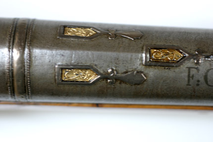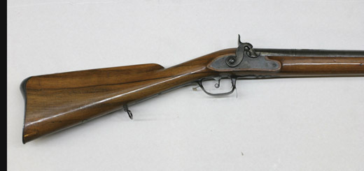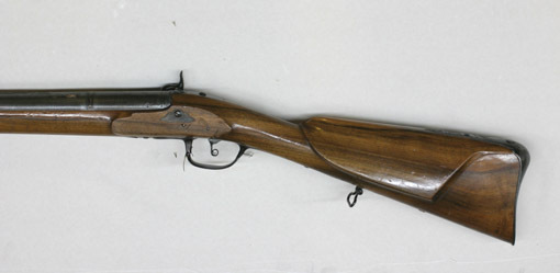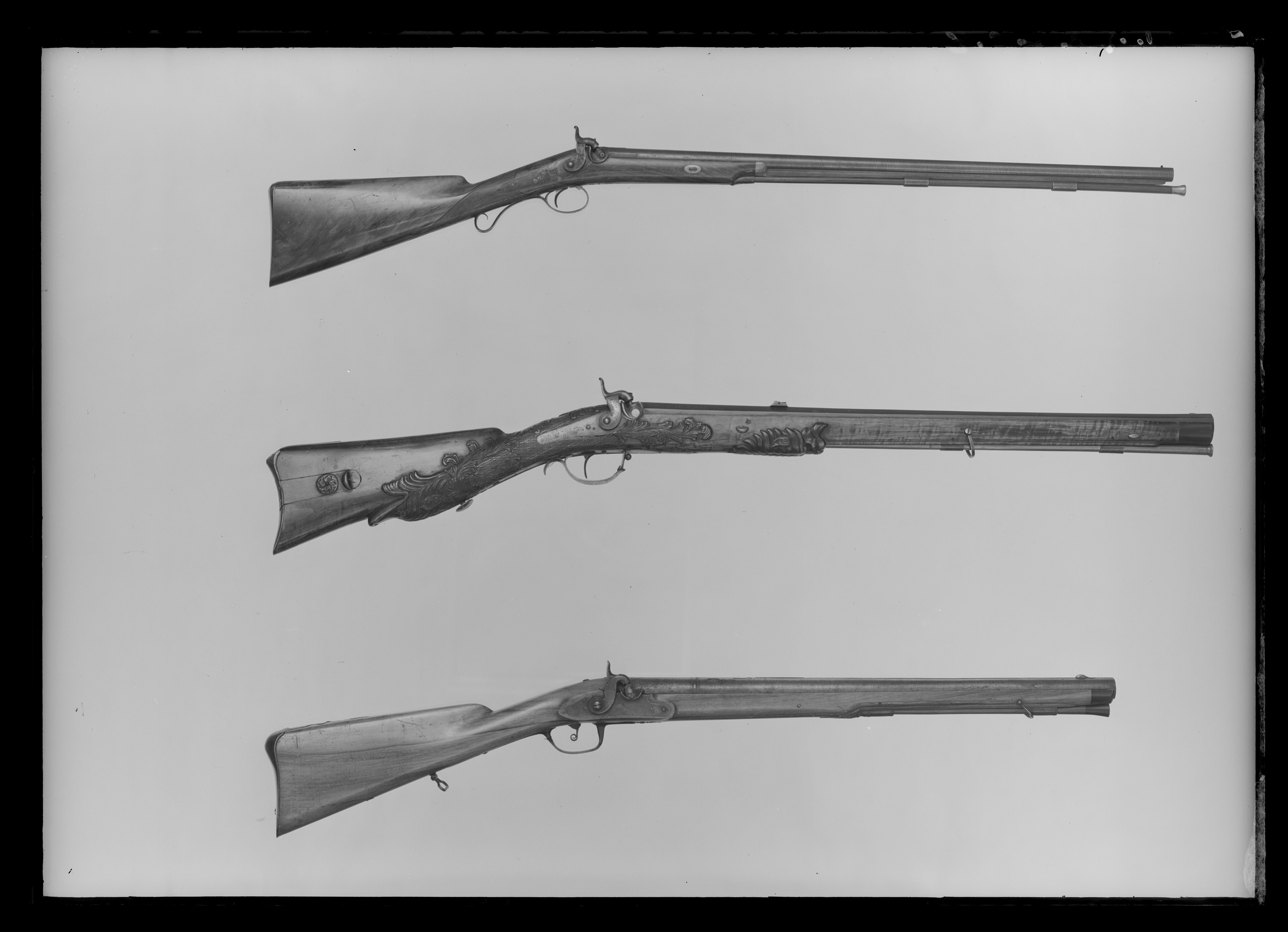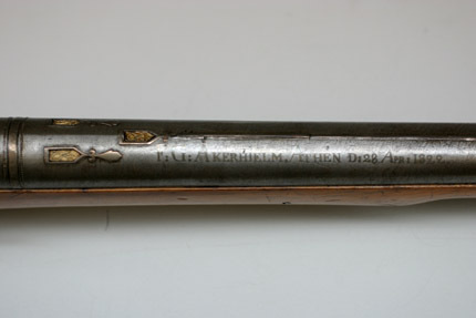Rund, damaskerad pipa med svinrygg, 9 raka räfflor. Dekor av pärlstav och vulst vid pipbasen, på kammaren inslagen linjedekor likt en trappgavel och hjärta, ring av silver mellan pärlstavar. Tre rektangulära guldmärken med spets framåt, pålagt silverband runtom med kantig form framför spetsen, märkena placerade 1och 2, från det främre fortsätter en på svinryggen påslagen silverlist fram till kornet, blad framtill. Utmed h. sida inlagt med koppar: "F:G:ÅKERHIELM. ATHEN D:28 APR:1822". Snäcka på kammarens h. sida. Svansskruvblad med rundad ände, vid skarven en upphöjd flik. Riktmedel: Filad siktskåra vid pipbasen, spolformigt korn av silver. Fästning: Två häften. Pipan fäst med krysskruv, ett pipstift av stål samt främre rembygelns skruv. Slaglås av stål med plant låsbleck. S-formig, platt hane med motstöd, tumgrepp och hålkäl runt nötskruven. Fästning: En låsskruv samt med hake på låsbleckets insida under skruv i låsurtaget. Avtryckare med upprullad ände. Brun, blankpolerad helstock av ljusbrunt trä med längsgående ådring, kolv av fransk typ, kantigt kindläge som når till kolvnäsan. Beslag: Näsband av svart horn, övriga beslag av blånerat stål. Slät bakplåt med utskjutande häl, tre skruvar, konturerad tunga med palmettspets på kolvryggen. Liten, plan låsskruvbricka. Två kantiga rörkor, två avlånga rembyglar. Avtryckarbleck och varbygel med konturerad främre arm, bladspets, fasade kanter, lång bakre arm. På kolvens undersida en liten mässingsoval med graverat nr 20. Tillbehör: Laddstock av trä med svart, vidgad skoning av horn, l: 572 mm. Fabian Gustaf Åkerhielm (1792-1869) blev 1808 fänrik vid Närke-Värmlands regemente. 1821 reste han till Grekland för att deltaga i frihetskriget.
