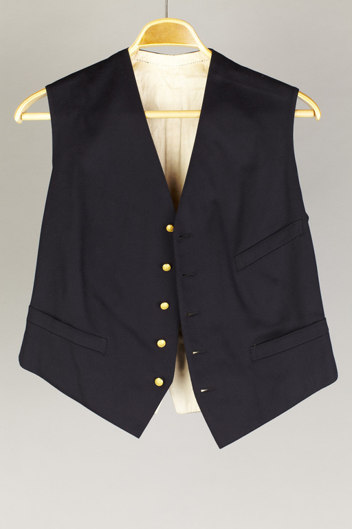 Väst av mörkblått kläde med frm knappar, 14 mm i diameter, välvda med kungl. krona med firmanamn påinsidan: "C.C. SPORRONG & CO, STOCKHOLM". 1 bröstficka, två fickor. Ryggstycke av svart siden medtill i ryggsömmen litet sprund samt slejf med svartlackerad sölja medbokstäver: "P.W.&S.". Västen i övrigt fodrad med vitt siden.