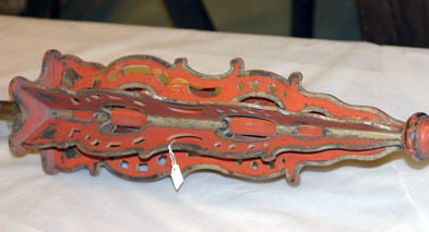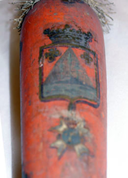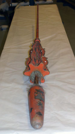 Rödmålad lans av trä bestående av kolv, handtag, stödskiva, vingar, holk och spjut. Bakåt avsmalnande, cylindrisk kolv med rundade ändar. Dekor i form av friherrliga ätten Cederströms hjärtvapen samt svärdsorden. Sköld med rött fält med en spets av silver. Tre gröna cederträd på ett berg i havet, åtföljd av två fyrbladiga rosor. Skölden krönt av friherrlig krona. Nio blommor i silver spridda över kolven. I båda ändar av handtaget fransar av guldtråd. En spik i handtaget. Stödskiva av trä i form av sexuddig stjärna med rundade spetsar, röd färg med fragment av silverfärg på kanterna. I skivan och stången intappat sex tunna bräder. Vingarna kontursågade i runda bågar, genombrutna. Dekor i form av en lilja i silver vid ovansidan av vingen. Svarvad, balusterformig holk, målad i rött med silverkant. Rödmålat, framåt avsmalnande spjut av trä.
