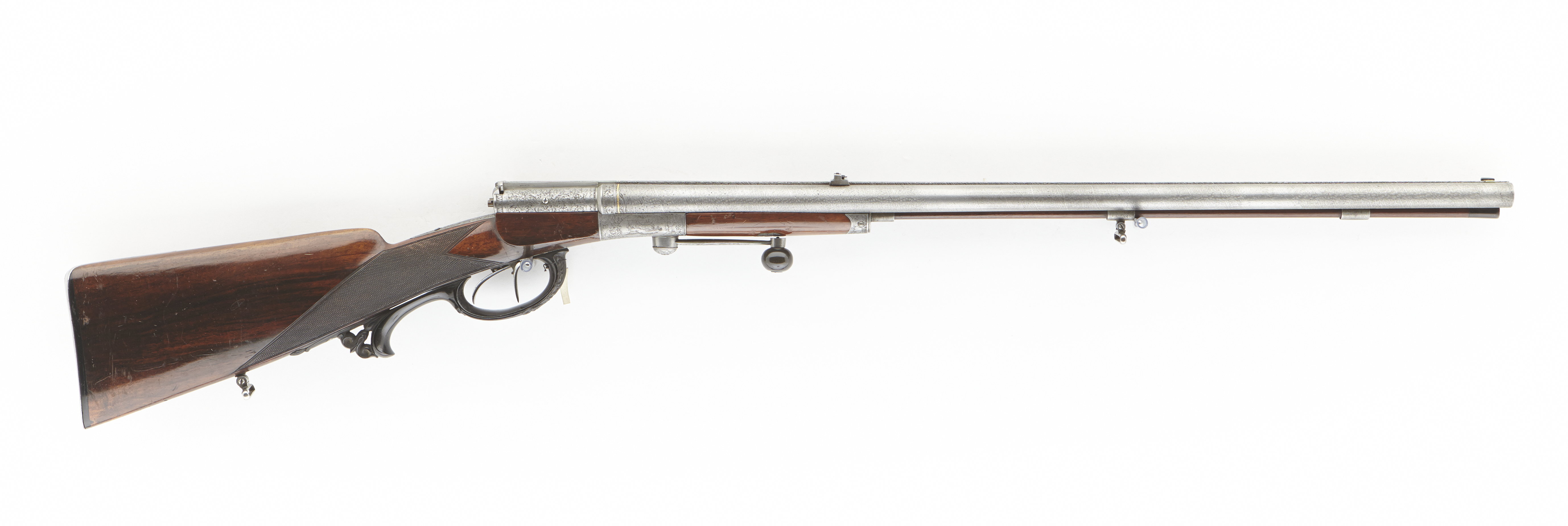 Dubbelpipa av damaskerat stål, hästskosömsdamask, h. pipa räfflad, 8 breda, plana räfflor, v pipa slätborrad. Piporna förenade med över- och underspänger, överspången täckt av graverad (?) damaskering, stämplad signatur: " MORGENROTH IN GERNRODE ". På pipbasen på spång och pipor inslagen guldlinje. Riktmedel: Inlaxat, blånerat sikte med höjbar mittskärm, justerskruv på framsidan. Inlaxat, spolformigt korn av silver. Slutning med vred på framstockens undersida, graverad band- och bladdekor, kulformigt handtag av mörkt trä. På vredet excentrisk skiva som driver piporna framåt när vredet virds åt sidan. Samtidigt spänns slagstiften. Piporna fällbara vid näsbandet, charnirskruv med ovalt, vinghuvud, stämplat: 1. Mekanism med två stålcylindrar, l: 185 mm, graverad blom- och bladdekor. Däri löper två stålcylidrar med fjädrande spärrar och med spiralfjädrar belastade tändnålar, själva nålens l: 62 mm, andra änden av mässing. Underdelen med graverad dekor, på sidorna ovala fält med landskap, på h. sida en hjort, på v. sida en räv. Bakom vredet textband: " MORGENROTH // IN // GERNRODE ". Underbeslaget framåt utdraget och bildar näsband med graverad dekor. Bakom låshuset på kolvens ovansida rundat, välvt blad med graverad band- och bladdekor. Underdelen bakåt utdragen till avtryckarbleck. Dubbla, böjda avtryckare, justerskruv på den h. Halvstock av valnöt, kolv av fransk typ med kindstöd, nätskuren kolvhals. Kolvänden skodd med horn under bakplåten. Bakplåt av stål med spetsig flik på kolvryggen, graverad rankdekor på fliken två skruvar. Förstock av stockens trä, l: 125 mm. Blomformig skruvbricka av stål. Varbygel av horn med nedåtsvängd, delvis fri bakre arm, kraftig snidad dekor, på bygel, genombruten, liljeliknande figur vid bakspetsen, oval ändplatta med musselliknande ände en skruv på ändplattan, framstolpen fäst i urtag på avtryckarblecket. Två rektangulära rembyglar av stål, en på kolvens undersida, en på underspången. Tillbehör: Laddstock av valnöt (?), l: 477 mm, hornbeslag på framänden, l: 23 mm.