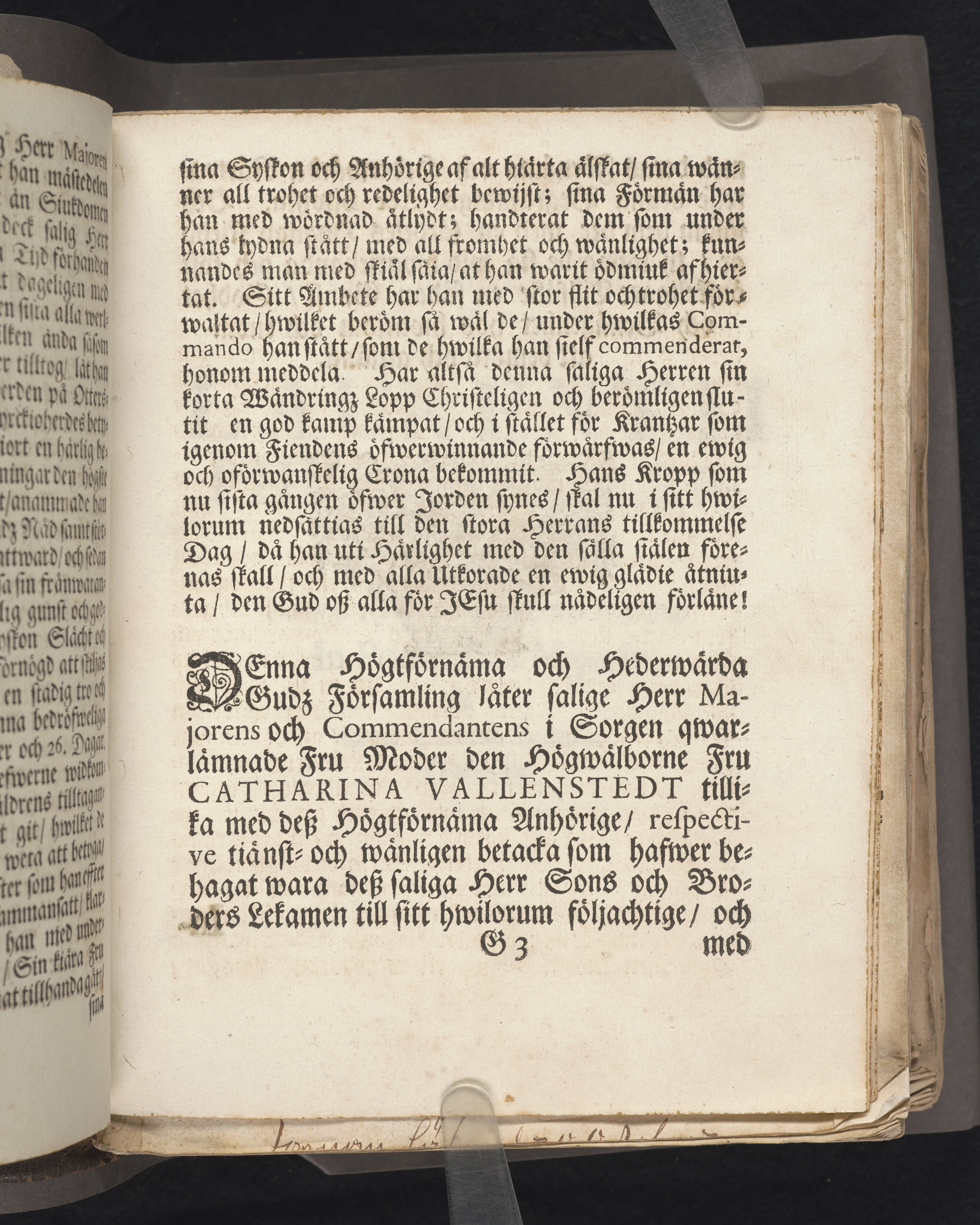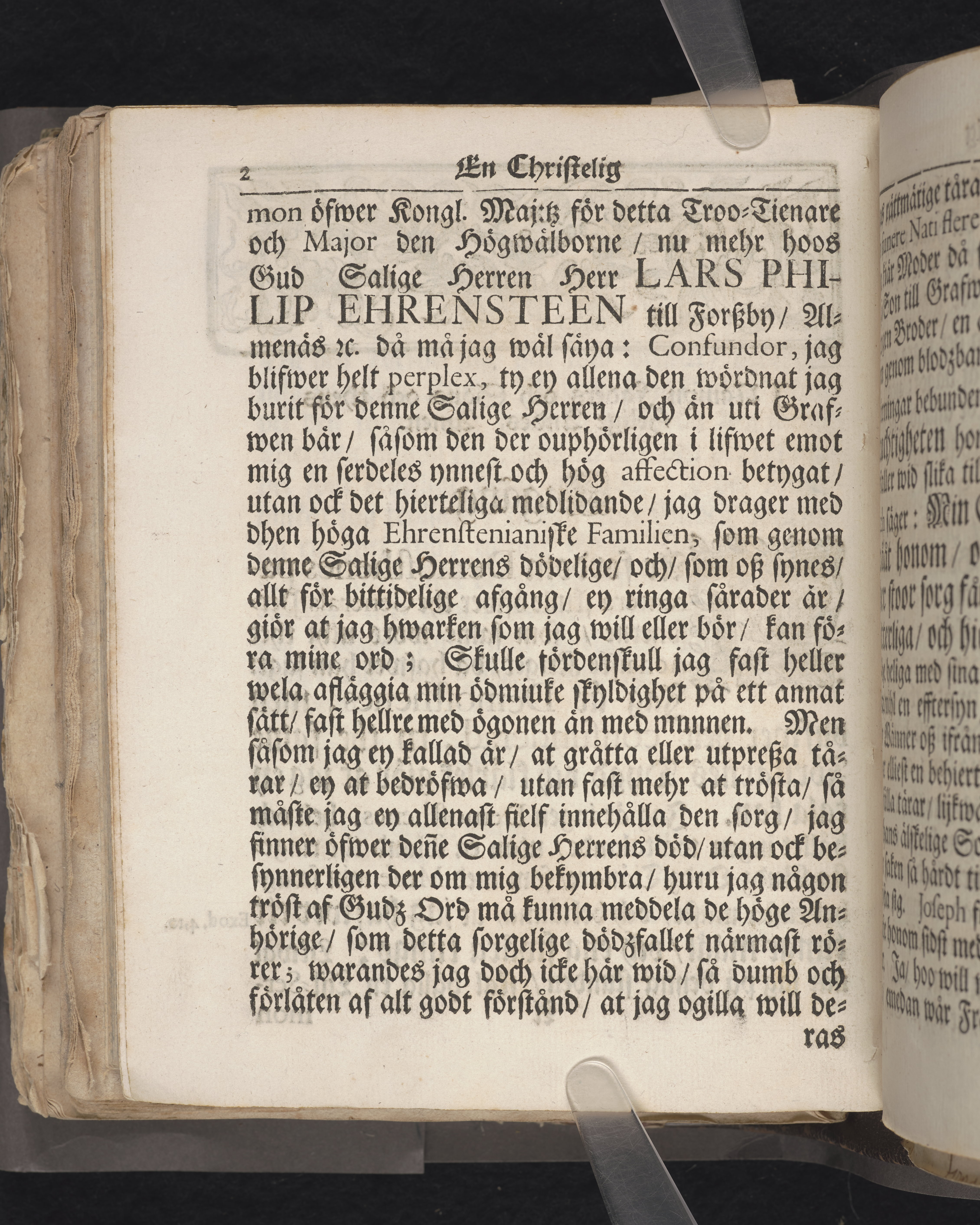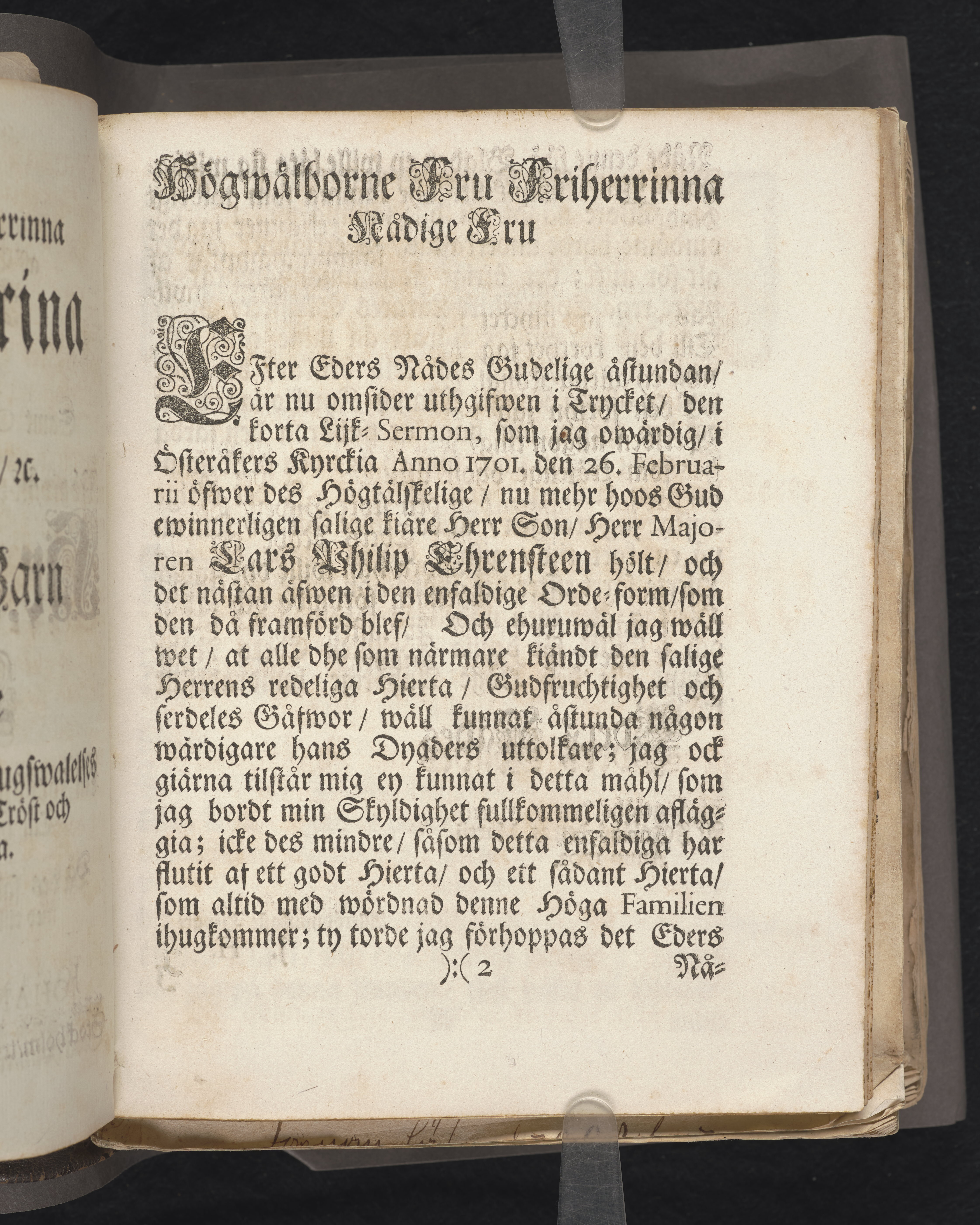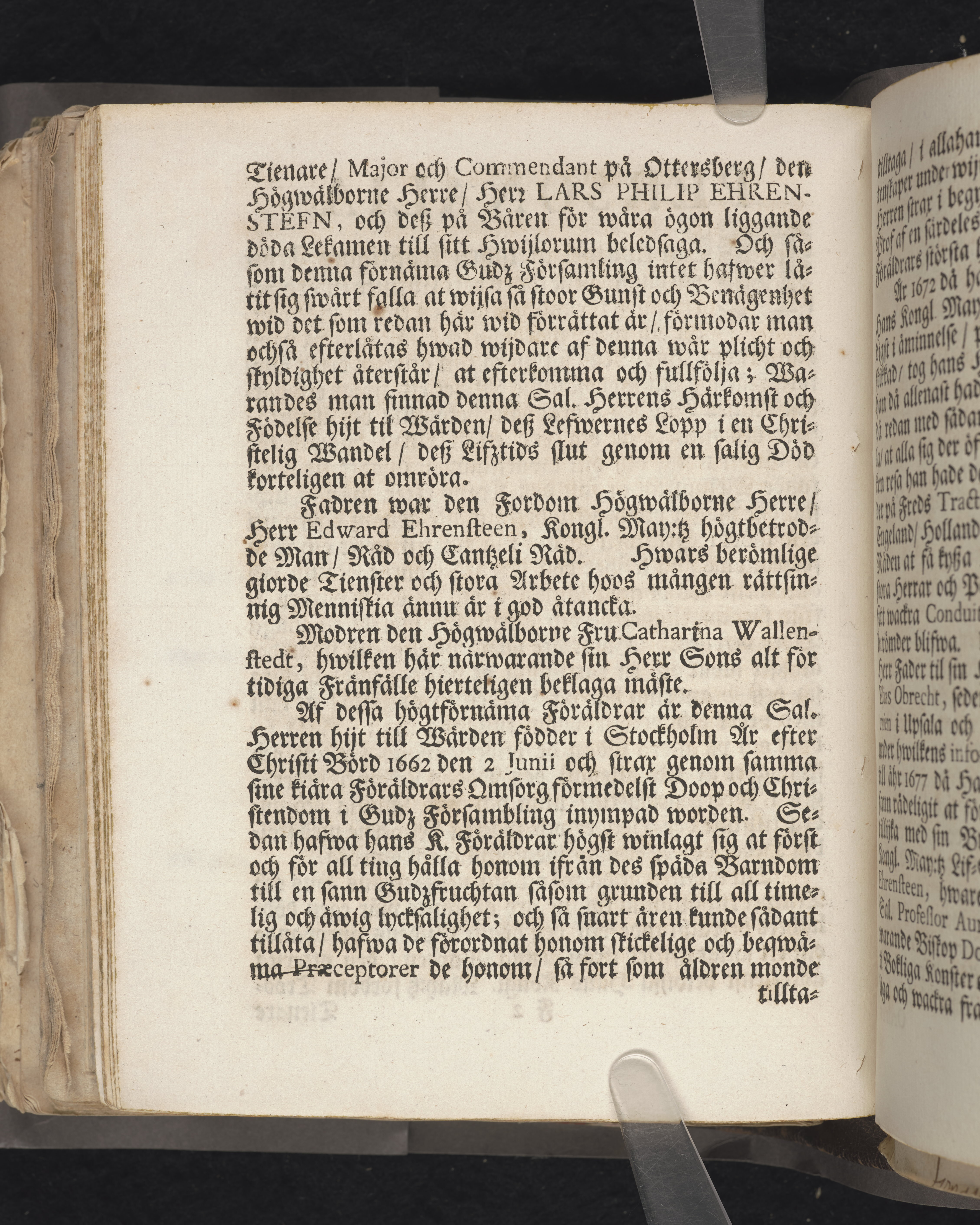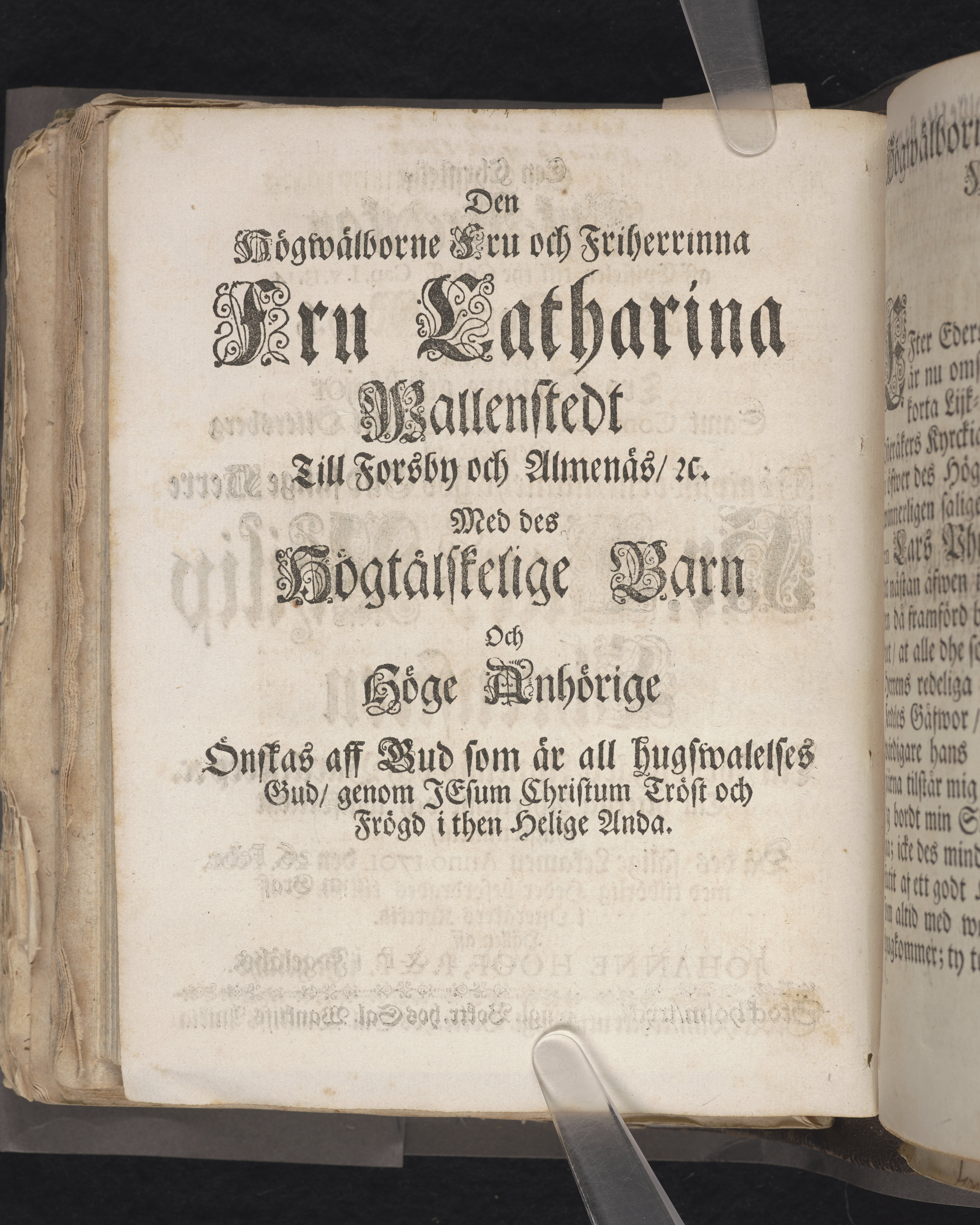 Een christelig lijk-predikan ... Hr. Lars Ehrensteen till Forsbygård, Almenäs och Barckestorp till yttersta ähretienst och wälförtient ihugkommelse, då des salige lekamen anno 1701. den 26. febr. med tilbörlig heder befordrades till sin graf i Österåkers kyrckia. Hållen aff Johanne Hoof, p. & p. i Fogelåhs. Stockholm, tryckt uti kongl. boktr. hos sal. Wanlijfs änkia.