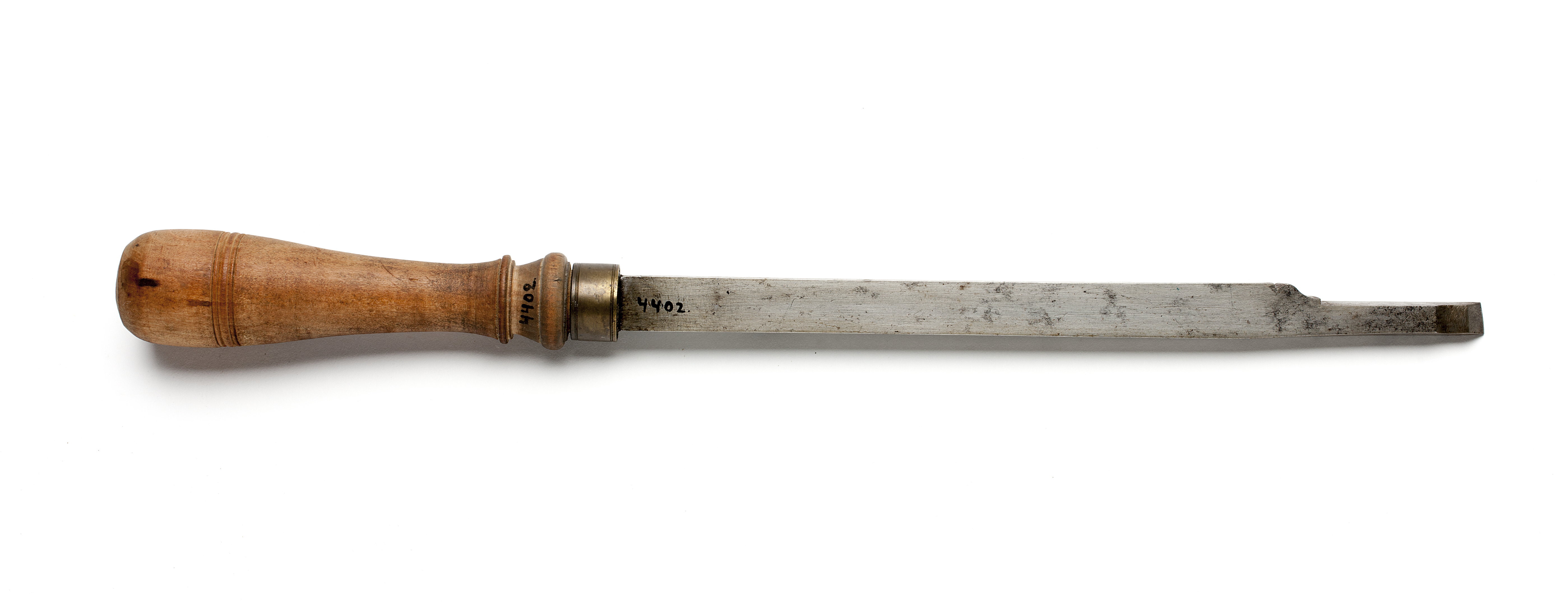 Klinga med rektangulär genomskärning, via profilering på ena sidan övergående i smalare ände. Något sned egg. Stämplat på klingan: "IK" under krona, Johan Kesemaker, Stockholm, samt "P" (proberstämpel). Svarvat skaft av päronträ, med två vulster nedtill ("rydboholmstyp"). Mässingsring. Stämplat på skaftet: "NB" under krona.
